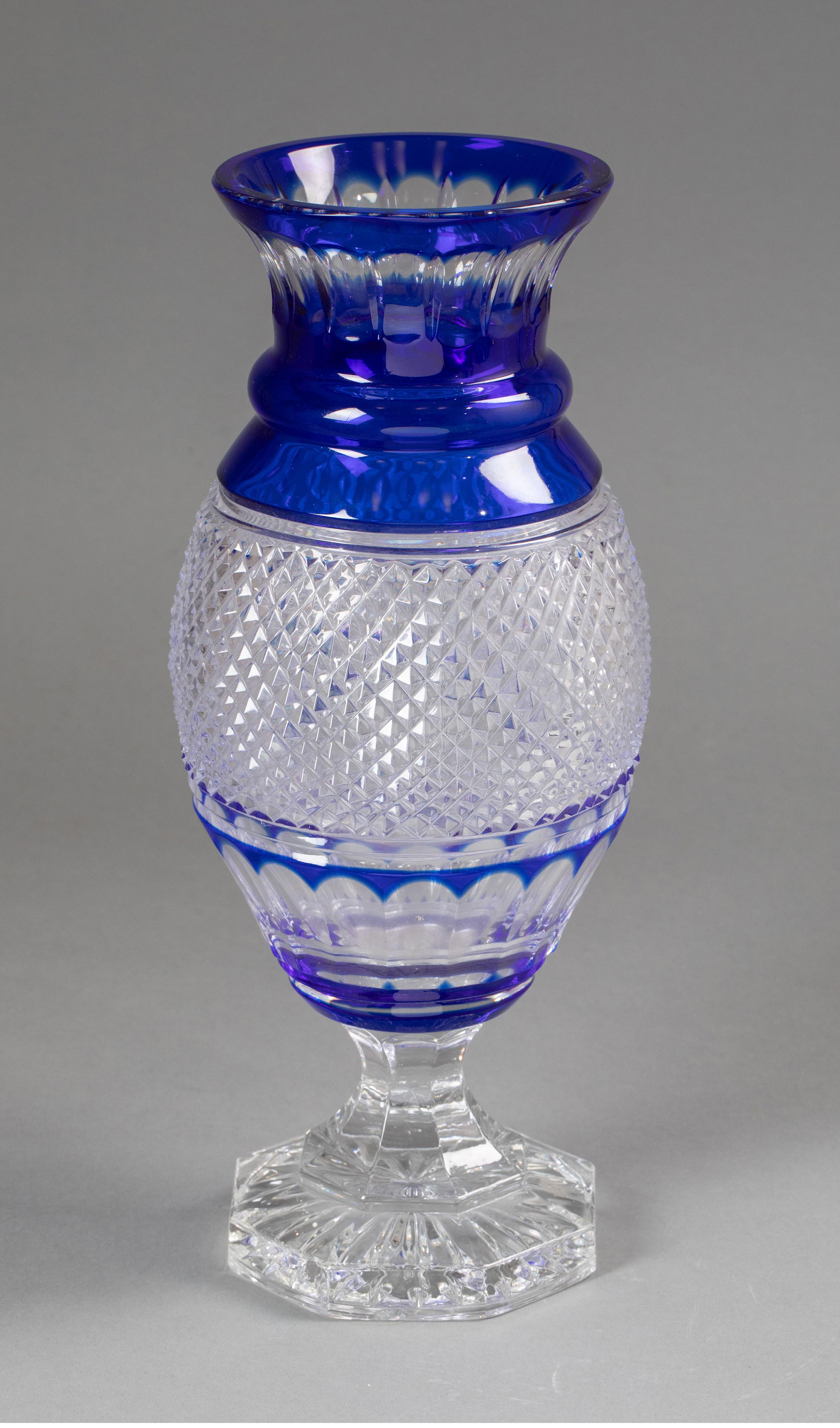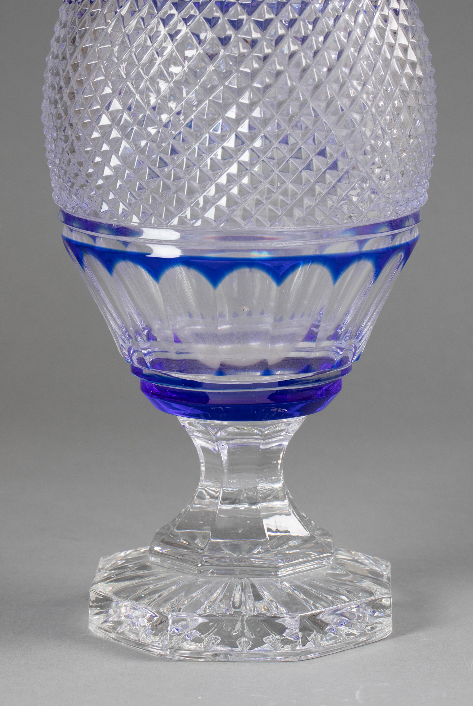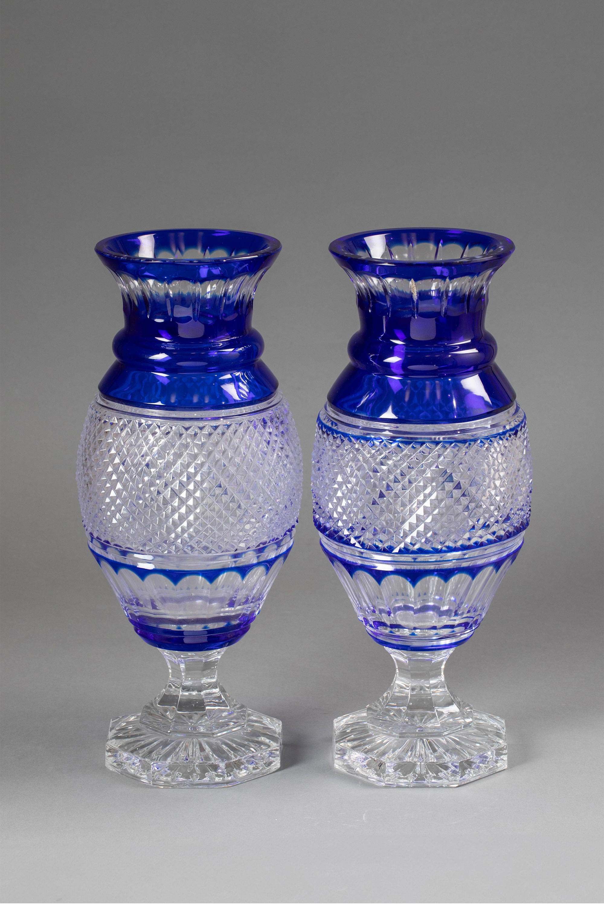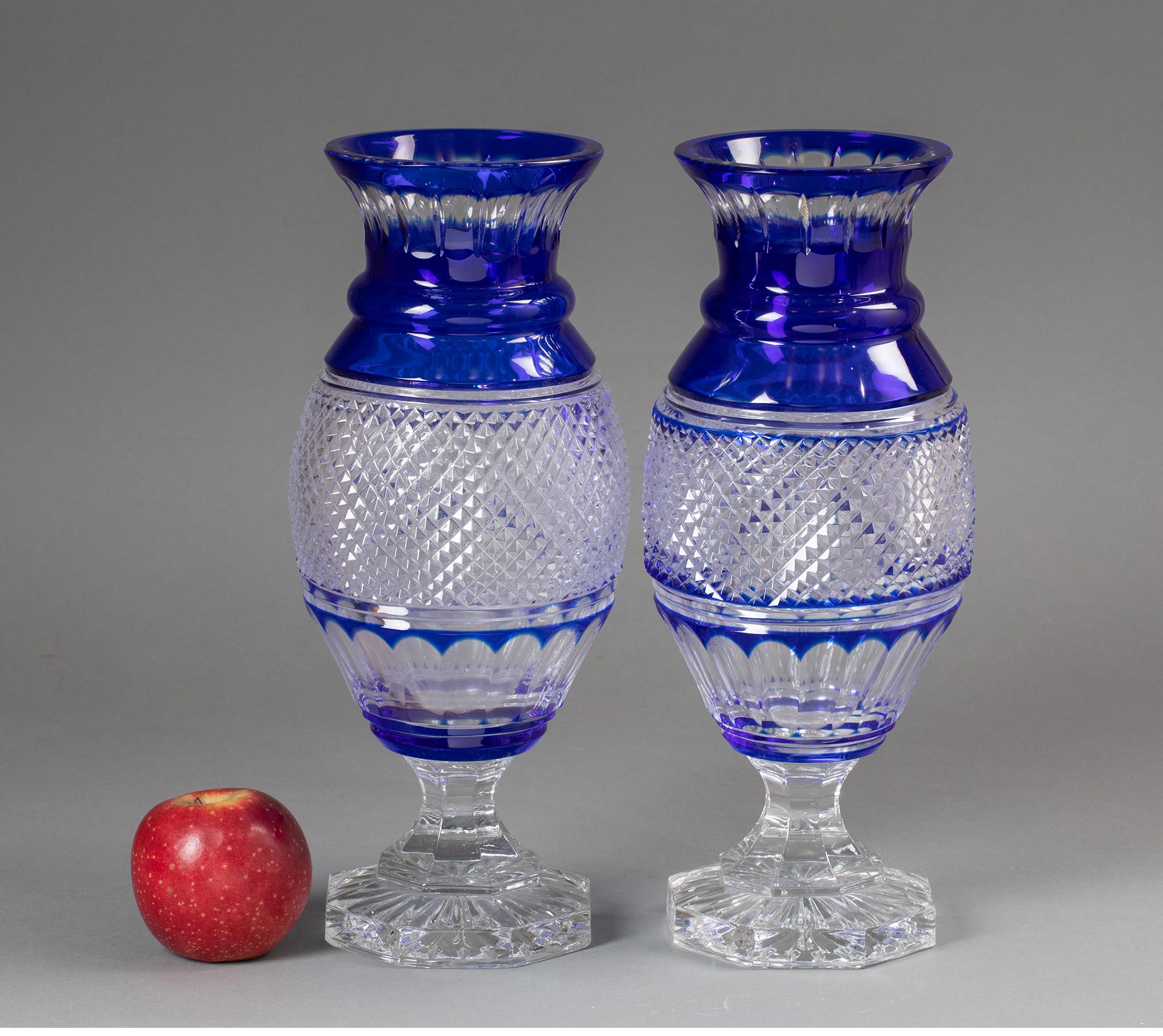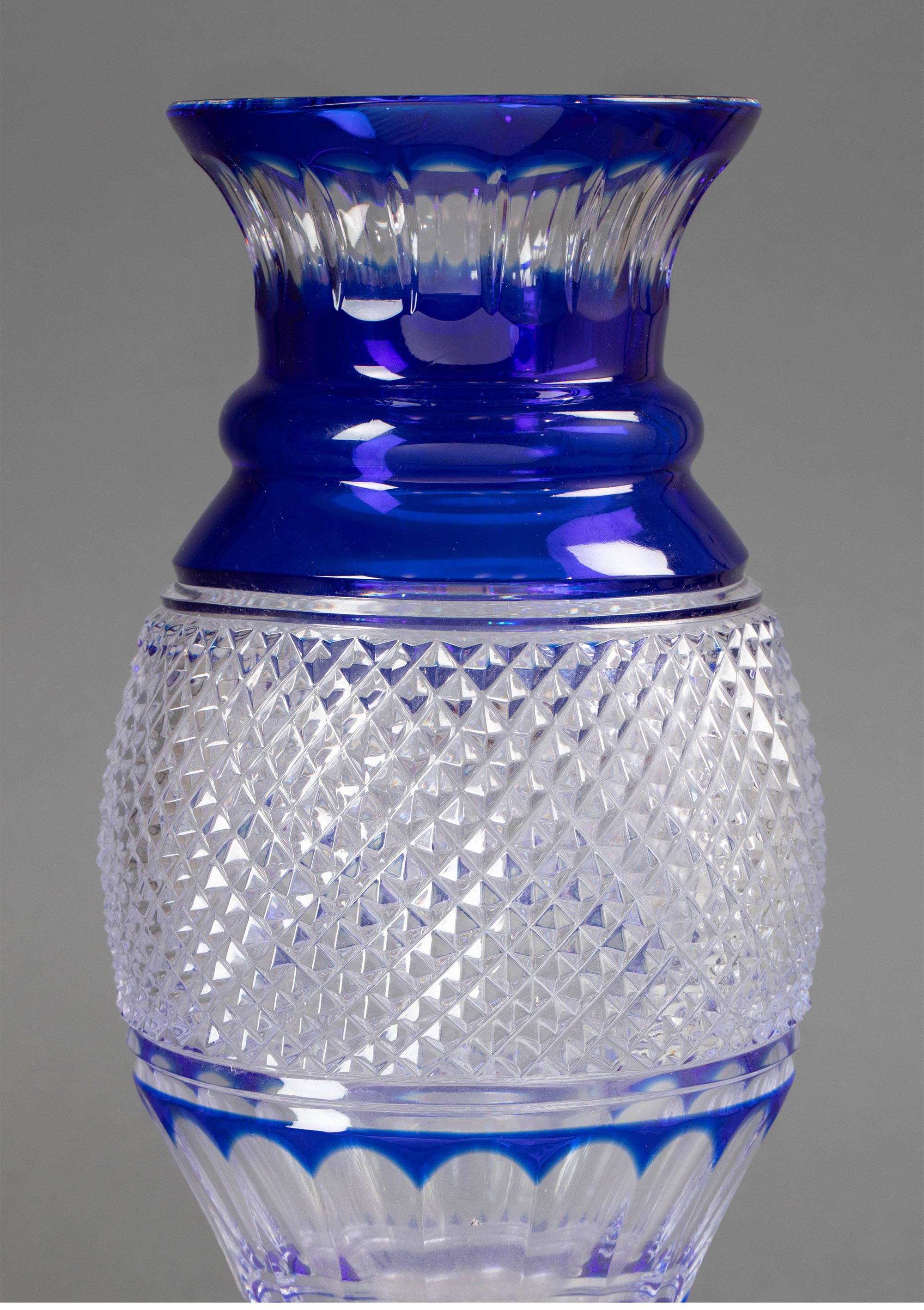 1950年代法国出品蓝彩装饰菱格纹水晶精雕花瓶一对