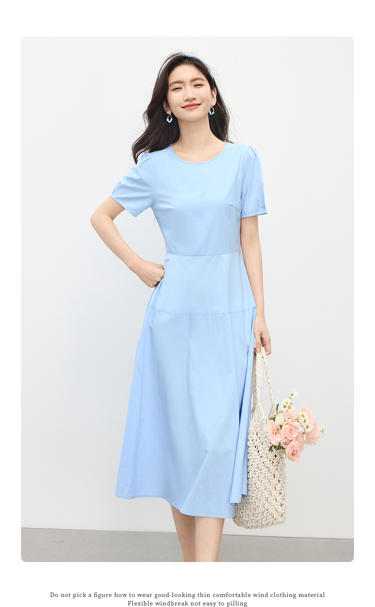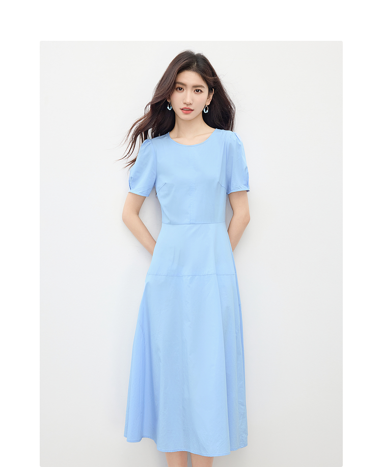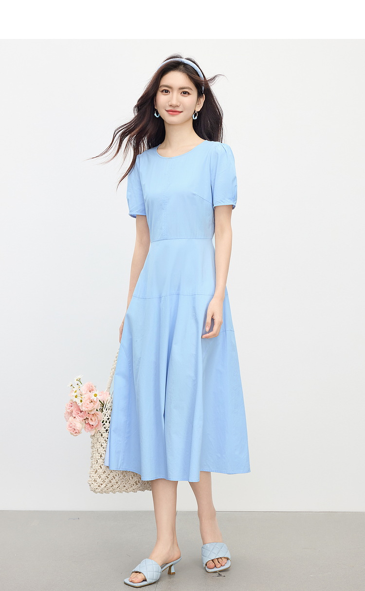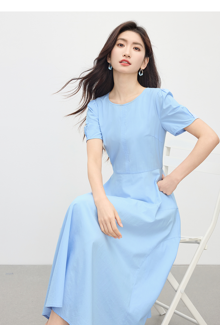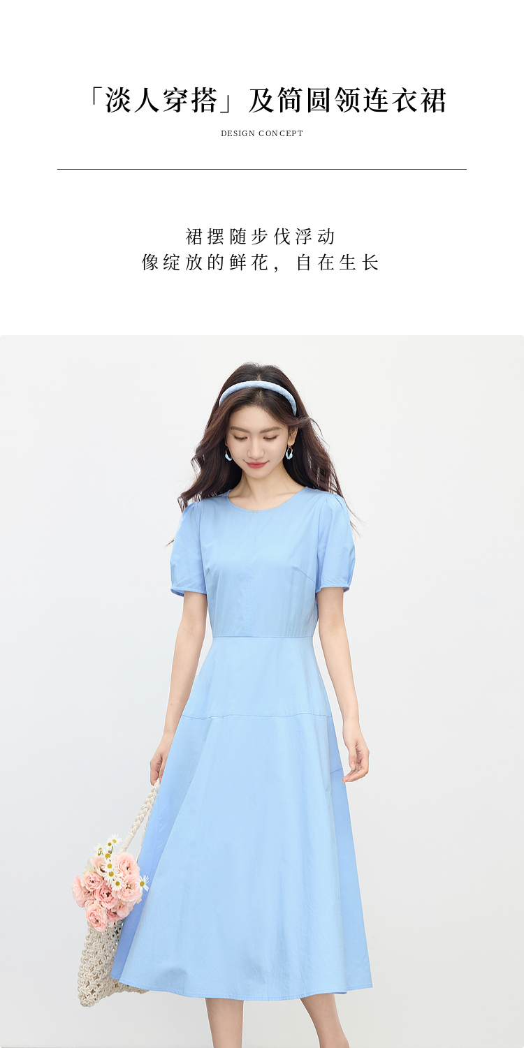 【07/09新品】熙世界极简风通勤浅蓝连衣裙女2025夏季新款气质显瘦短袖收腰长裙