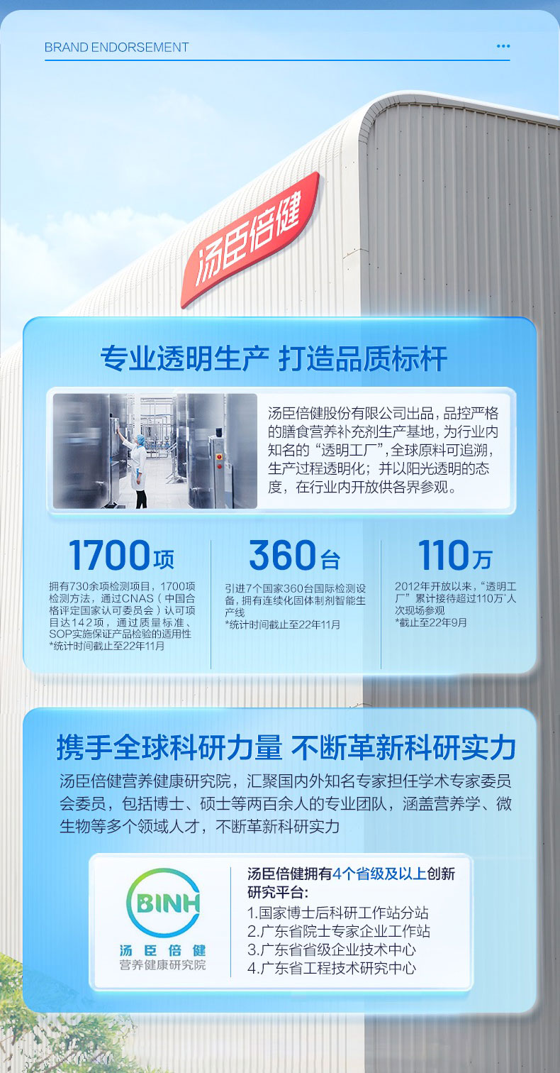 - 作为全球膳食营养补充剂行业领先者,汤臣倍健实施科学营养战略,建立了全面的膳食营养补充剂科学体系,携手全球前沿科研力量,以极致的科学精神,打造极致的科学营养产品力。