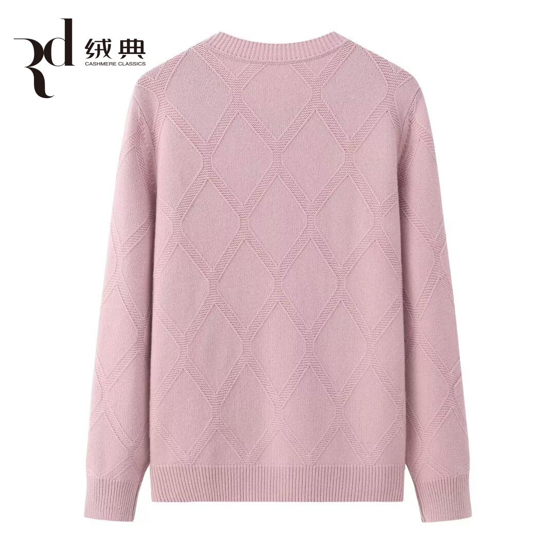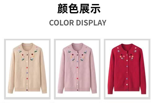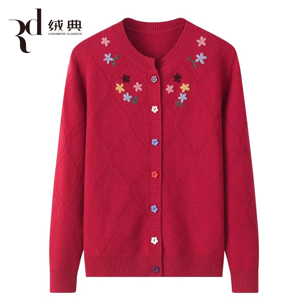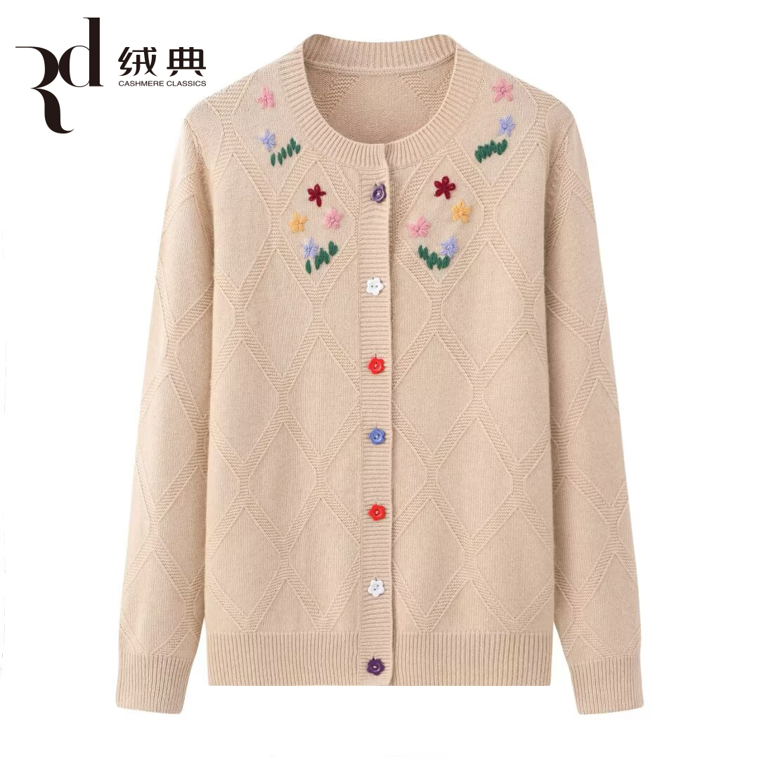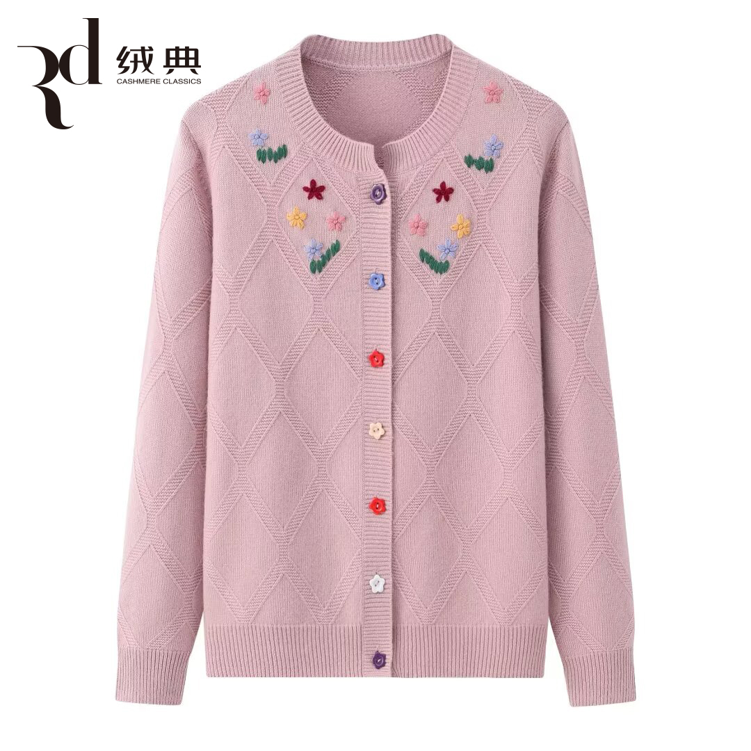 绒典圆领加厚翻花绣花女开衫