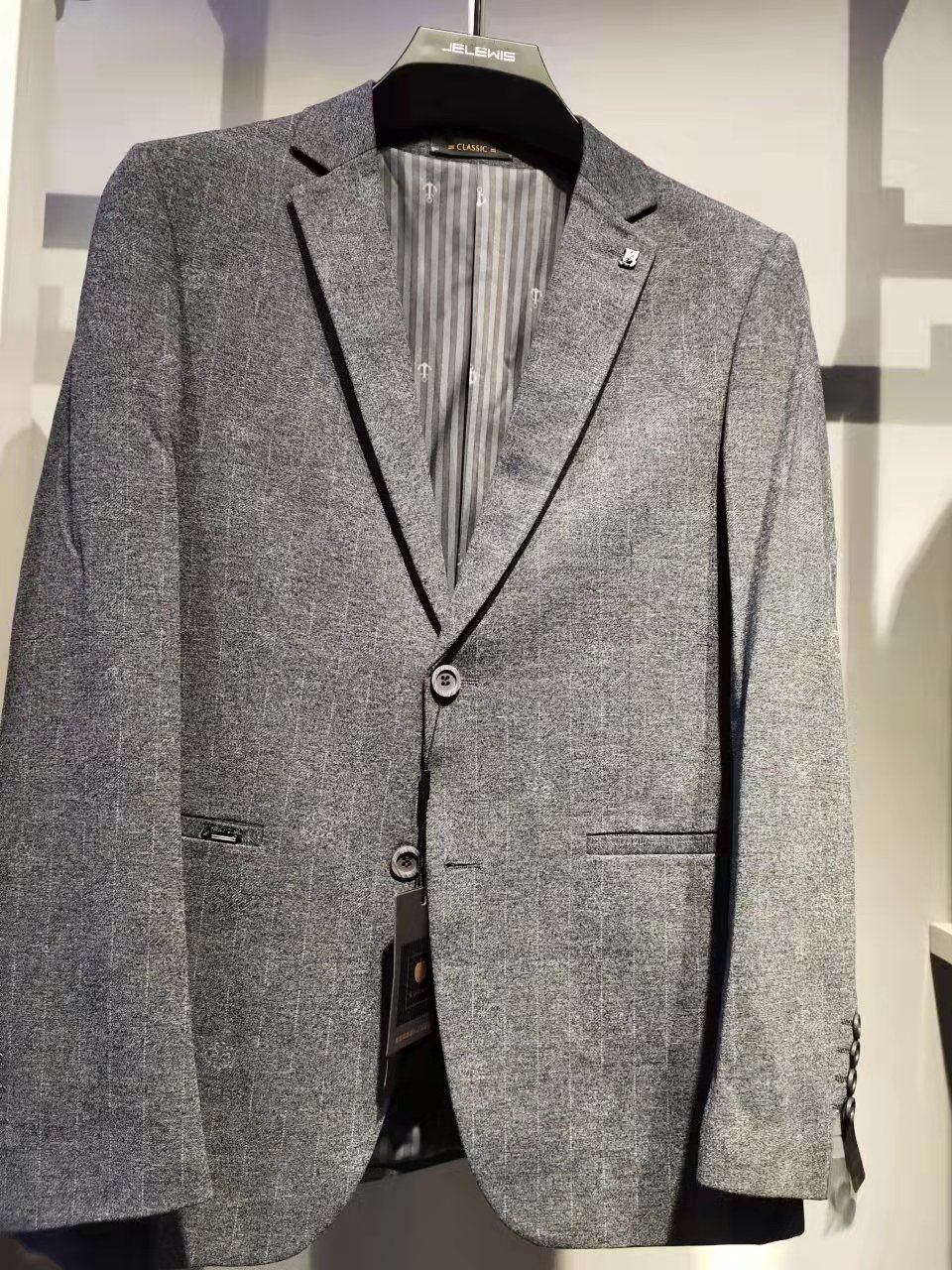 一款休闲西服,面料是粘纤,锦纶加氨纶,聚酯纤维混纺的面料,穿着舒服,有弹性,可以搭毛衫衬衣,根据自己的喜好,穿衣搭配。