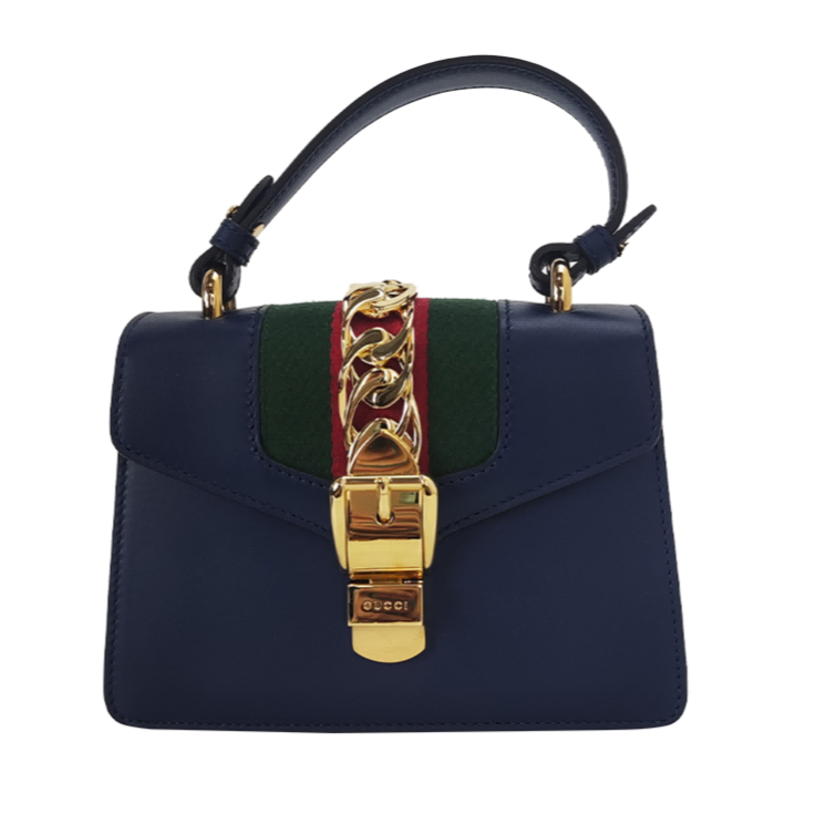 GUCCI古驰 Sylvie 金扣条纹织带 皮革 手提包单肩包斜挎包 迷你 女款 蓝色