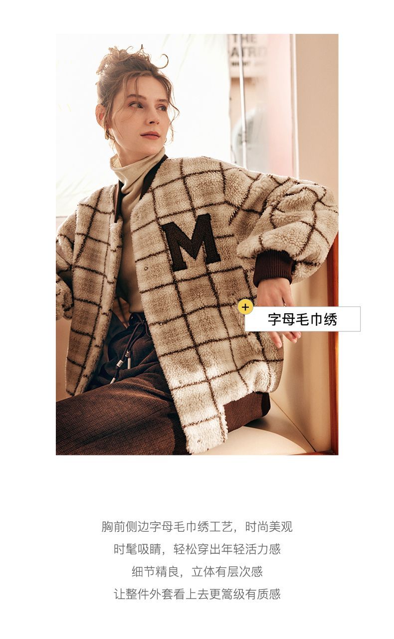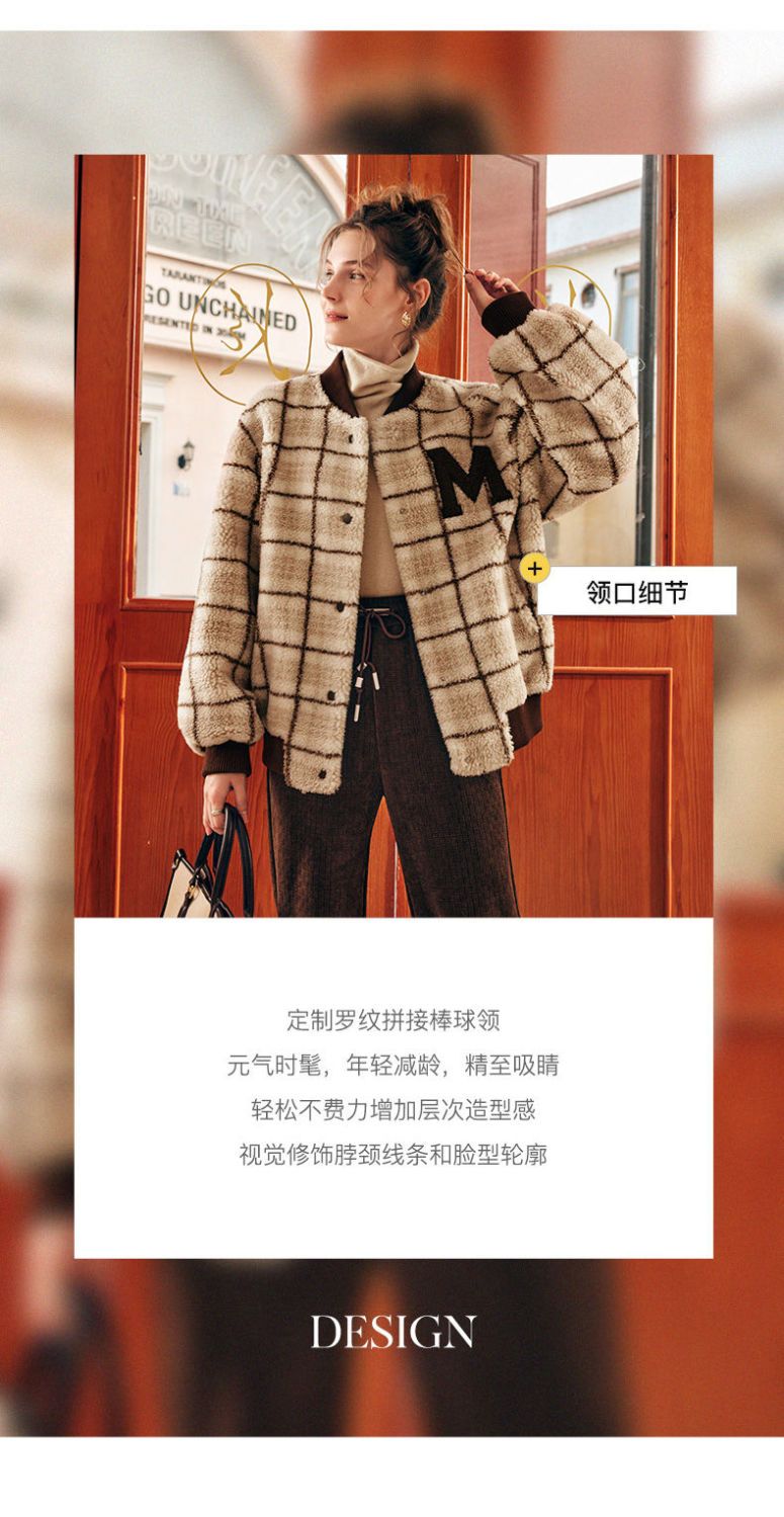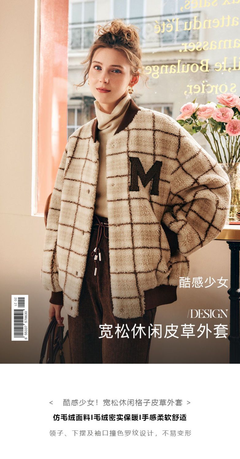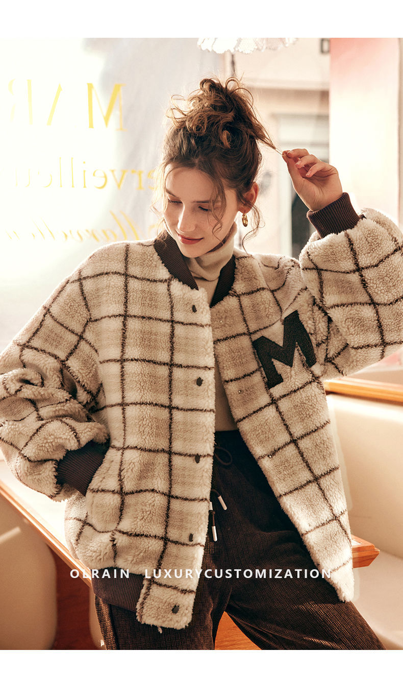 OLrain欧芮儿法式格子毛呢外套女秋冬2025年新款宽松加厚毛绒皮草