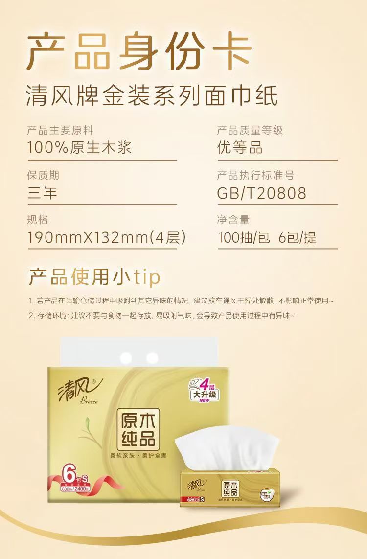 清风 金装抽纸 【1提6包(600抽/2400张)】 四层原木纯品 家用纸巾面巾纸餐巾纸卫生纸