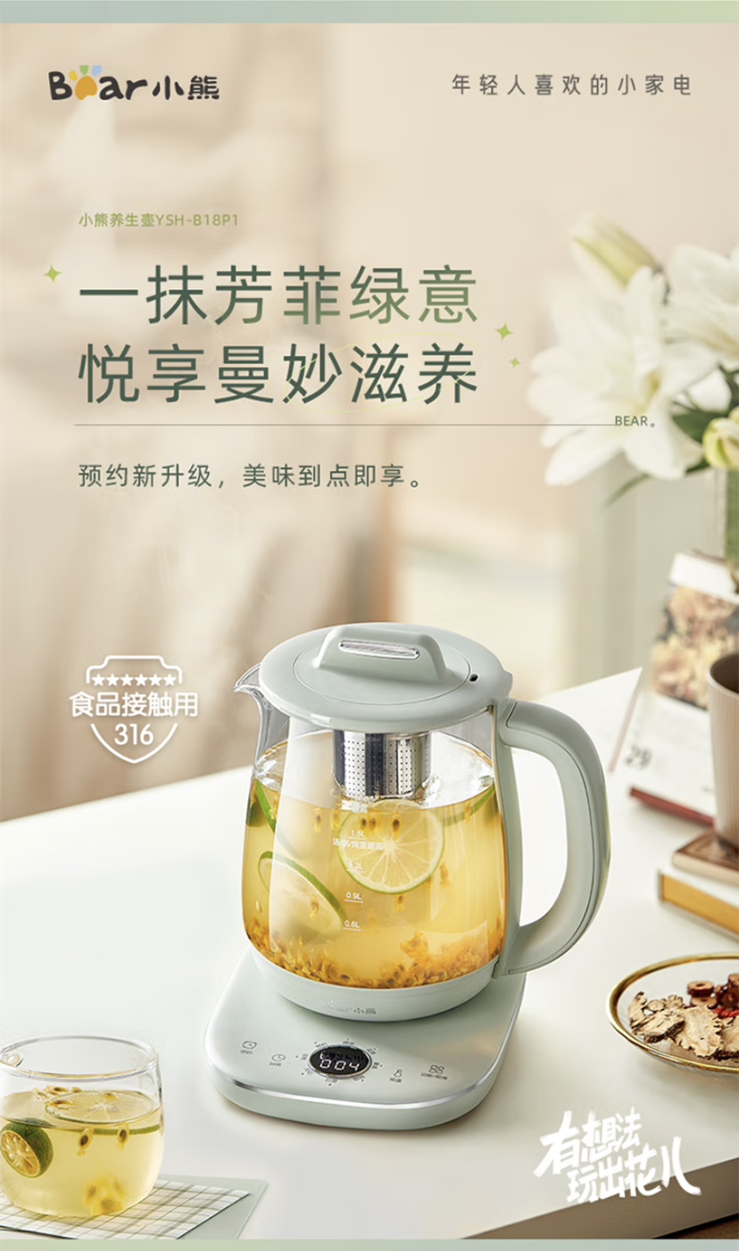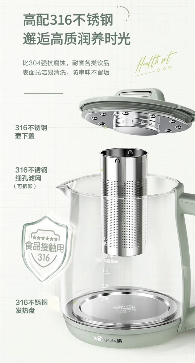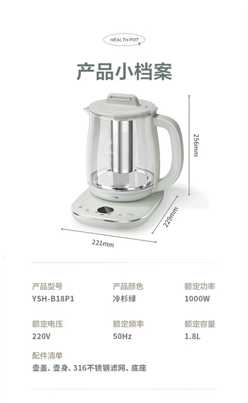 小熊YSH-B18P1养生壶煮茶壶电水壶花茶壶1.8L电热烧水壶