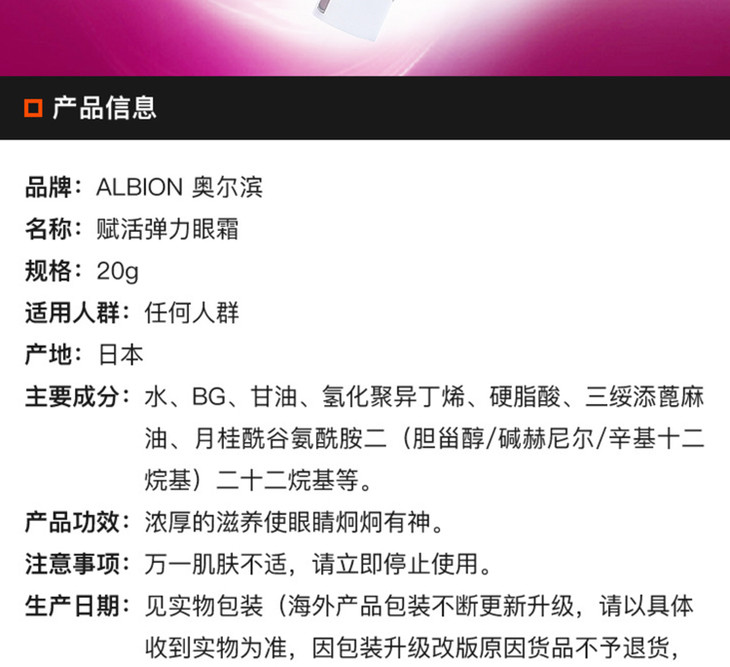 预售albion澳尔滨infiness系列赋活弹力眼霜20g 直邮需要等2周