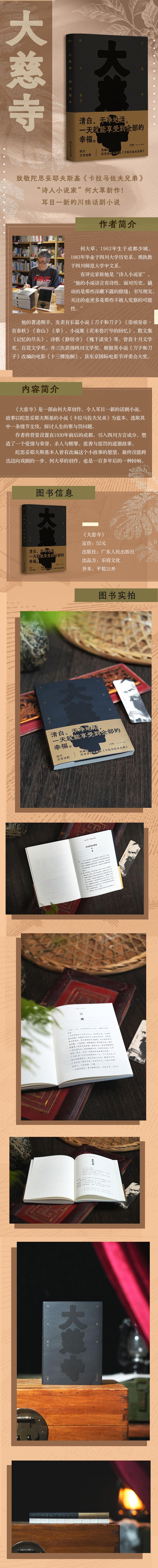 《大慈寺》是一部由何大草创作,令人耳目一新的话剧小说。故事以陀思妥耶夫斯基的小说《卡拉马佐夫兄弟》为蓝本,选取其中一条情节支线,探讨人生的罪与罚问题。作者将背景设置在1930年前后的成都,引入四川方言成分,塑造了一个爱情与荣誉,杀人与赎罪,慈善与惩罚的道德故事。多年之前,副官李还珠救下了巴蜀富贾朱福田。一来二去,两人结成了忘年之交,李还珠更是成了朱家的常客、贵客,并对朱福田的掌上明珠,女儿朱珠暗生情愫。而他并不知道,朱珠的心早已另有所属——她的表哥陈宝宸。一起误会,两个耳光。自尊的受辱令两个年轻人卷入了一场生死决斗。但是就在决斗前夜,李还珠做出了一个令所有人都倍感意外的选择。而他的举动,也将再次改变朱福田的命运……陀思妥耶夫斯基本人曾有改编这个小故事的愿望,最终没能跨出迈向戏剧的一步,何大草的创作,也是一百多年后的一种回响。