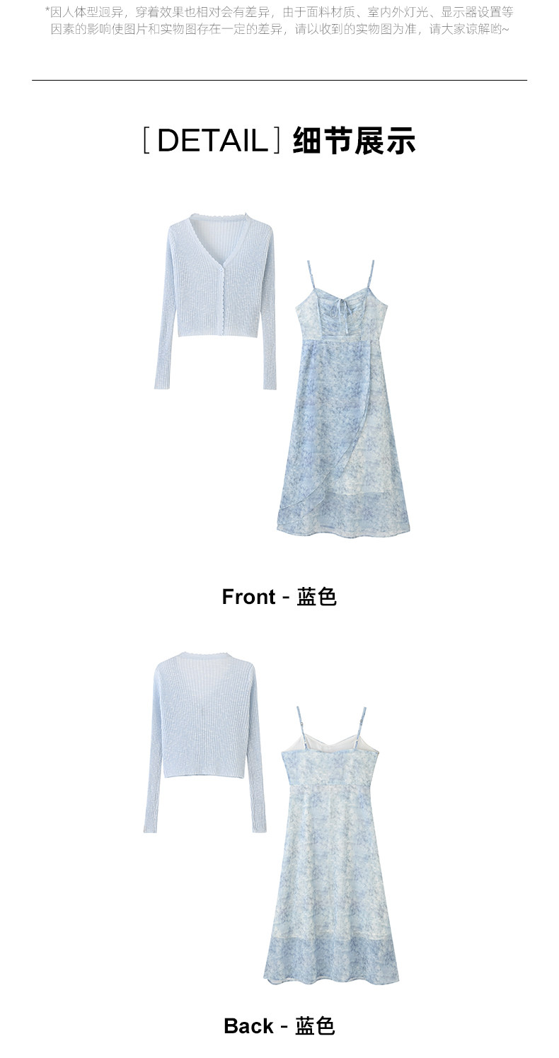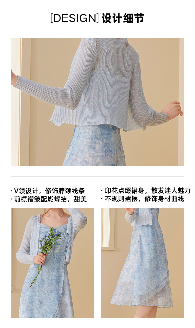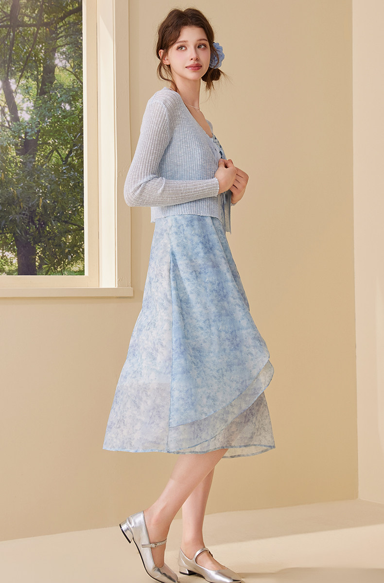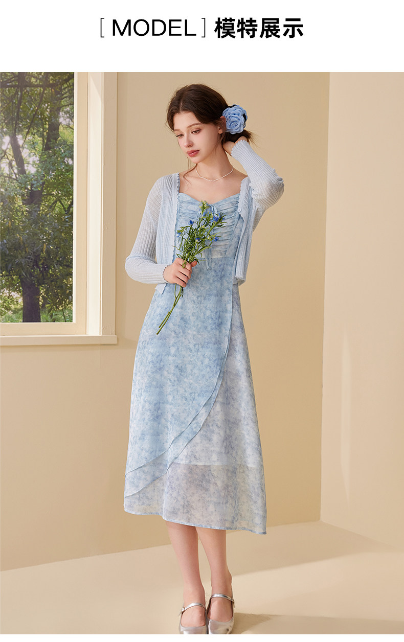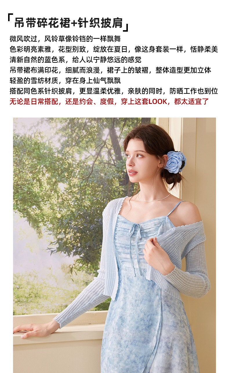 mc2吊带碎花裙+针织披肩两件套女夏季新款显白蓝色系小个子