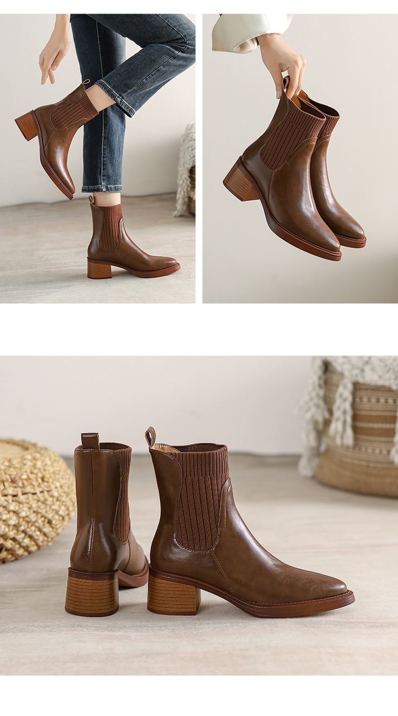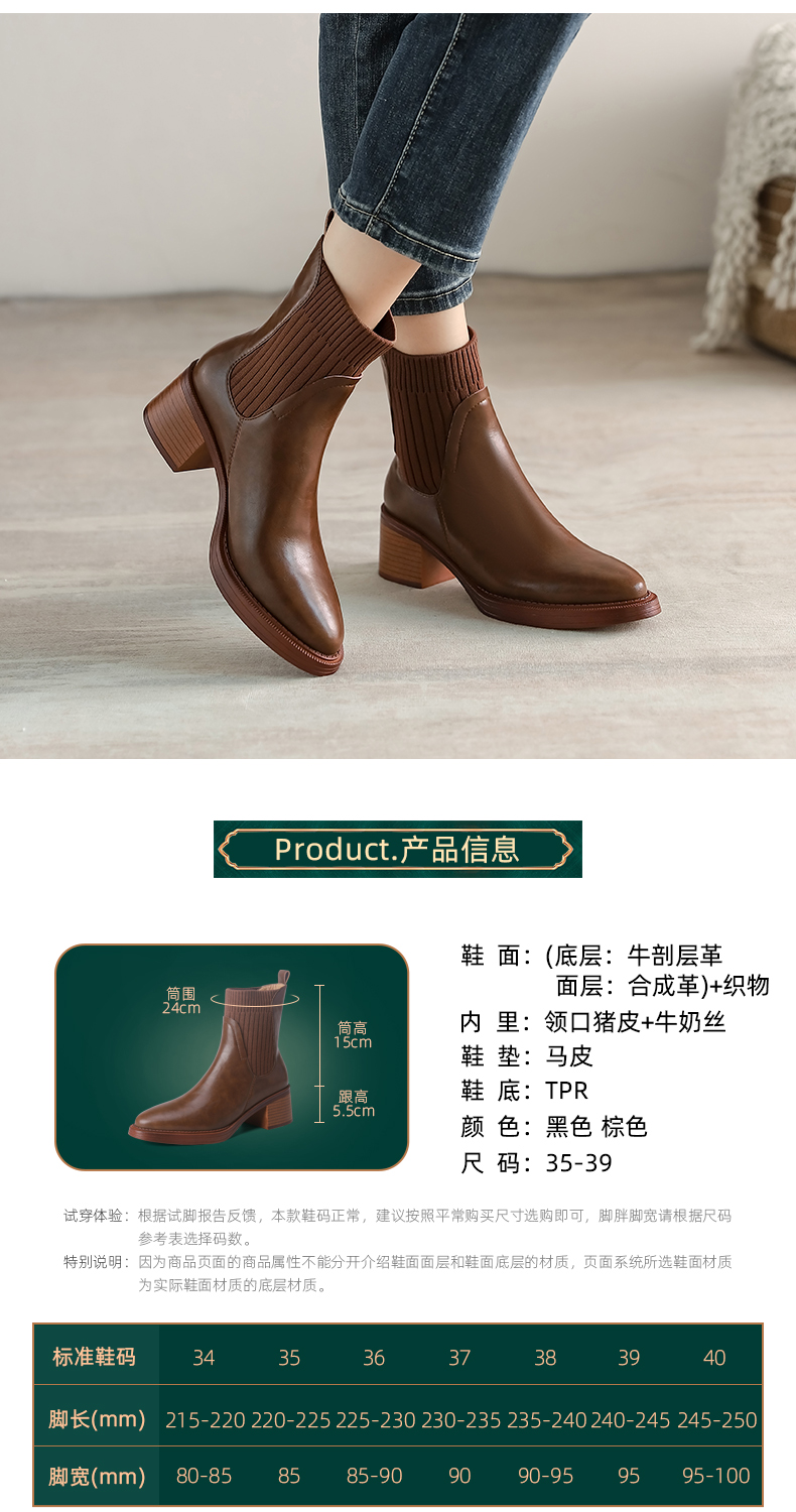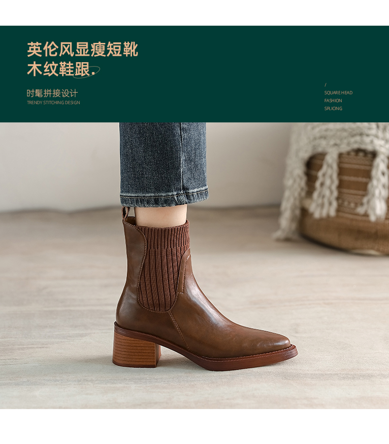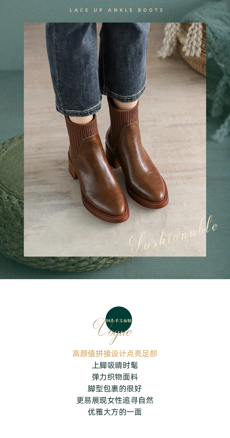 阿么手工女鞋复古显瘦百搭真皮短靴粗跟5.5CM显瘦针织瘦瘦靴棕色