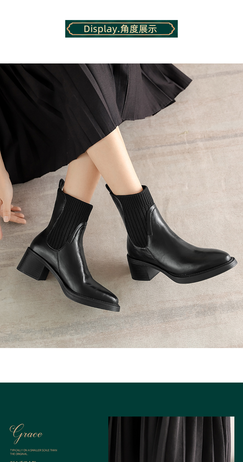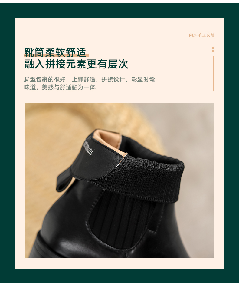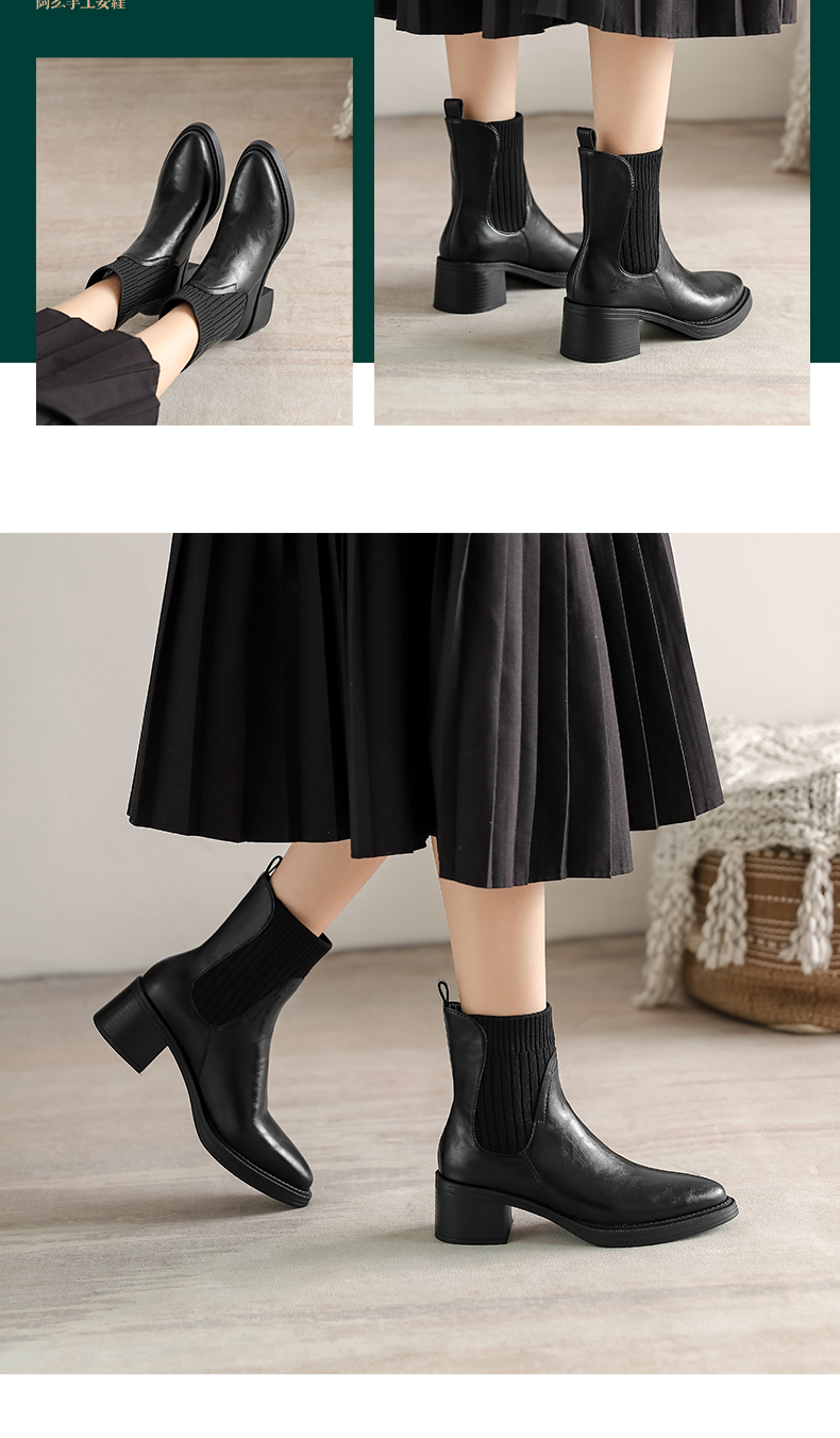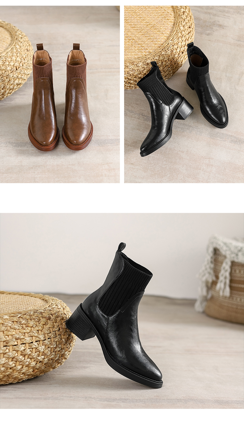 阿么手工女鞋复古显瘦百搭真皮短靴粗跟5.5CM显瘦针织瘦瘦靴棕色