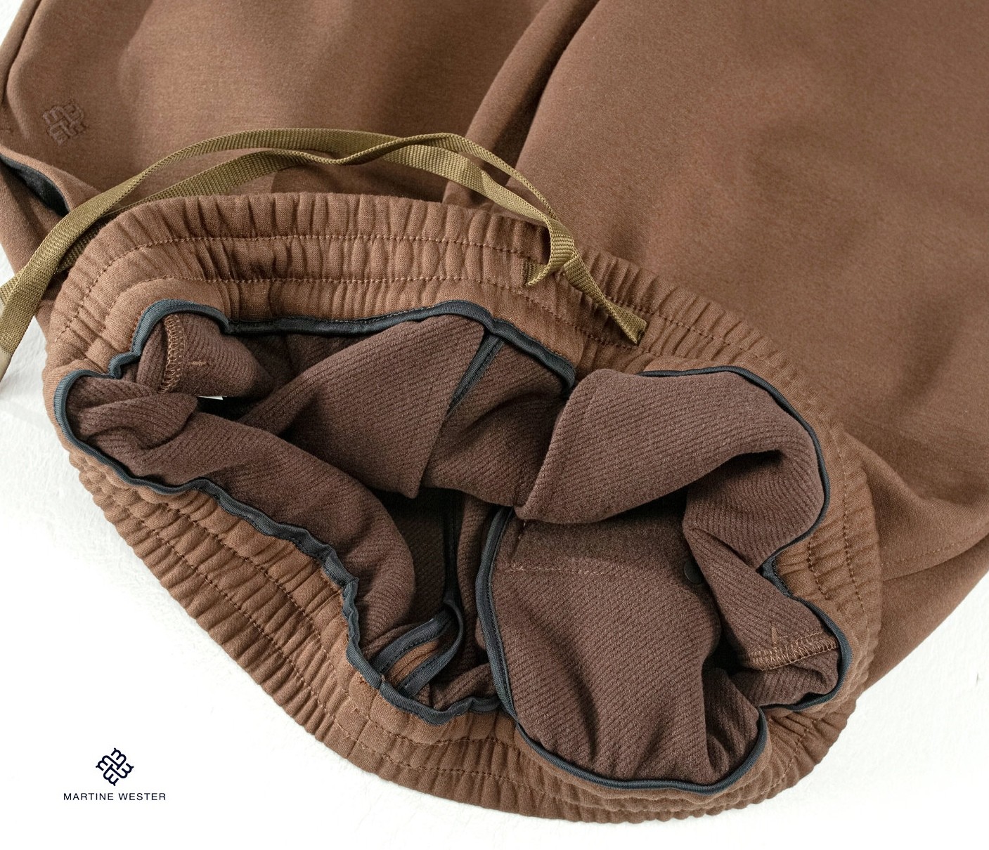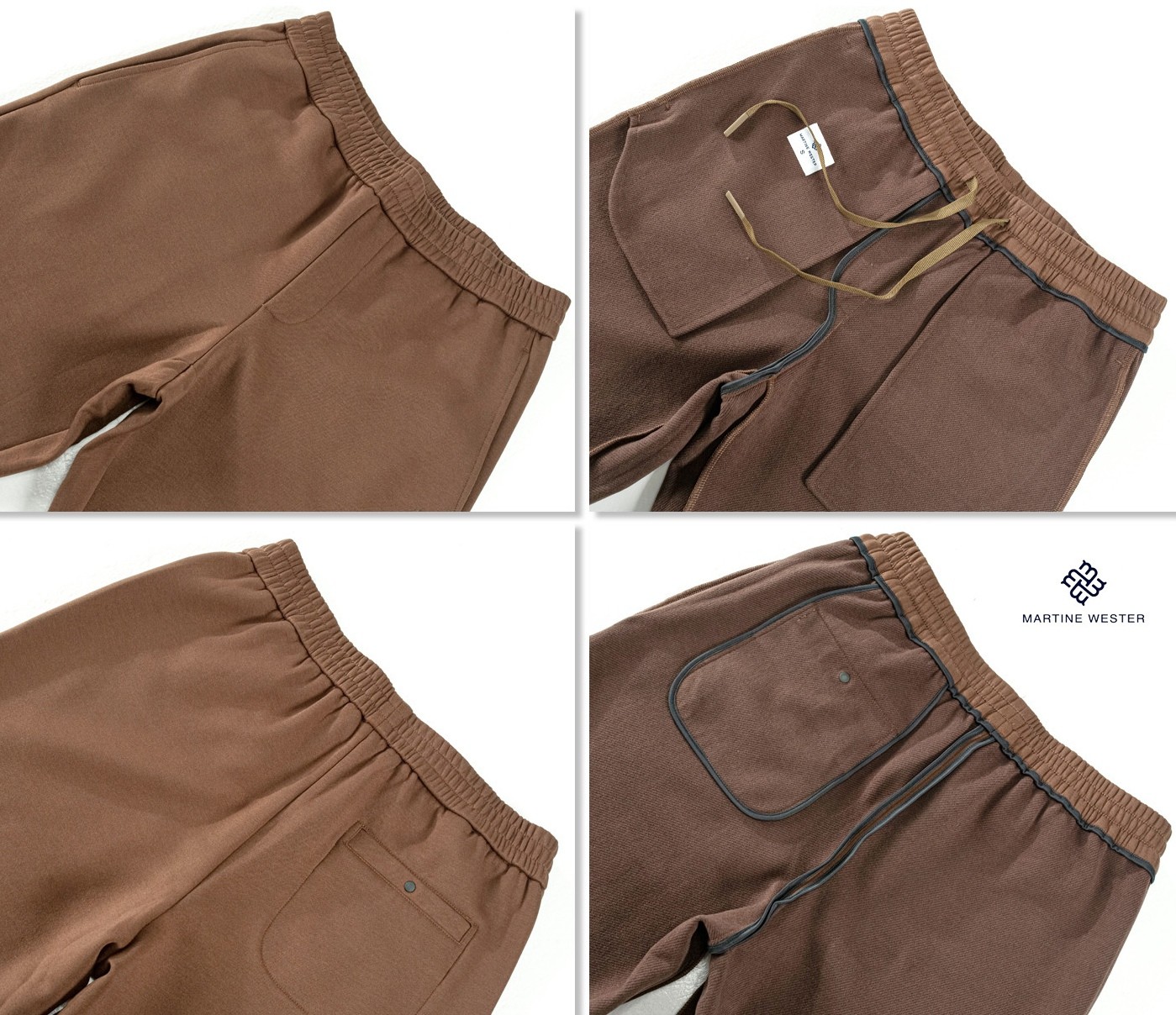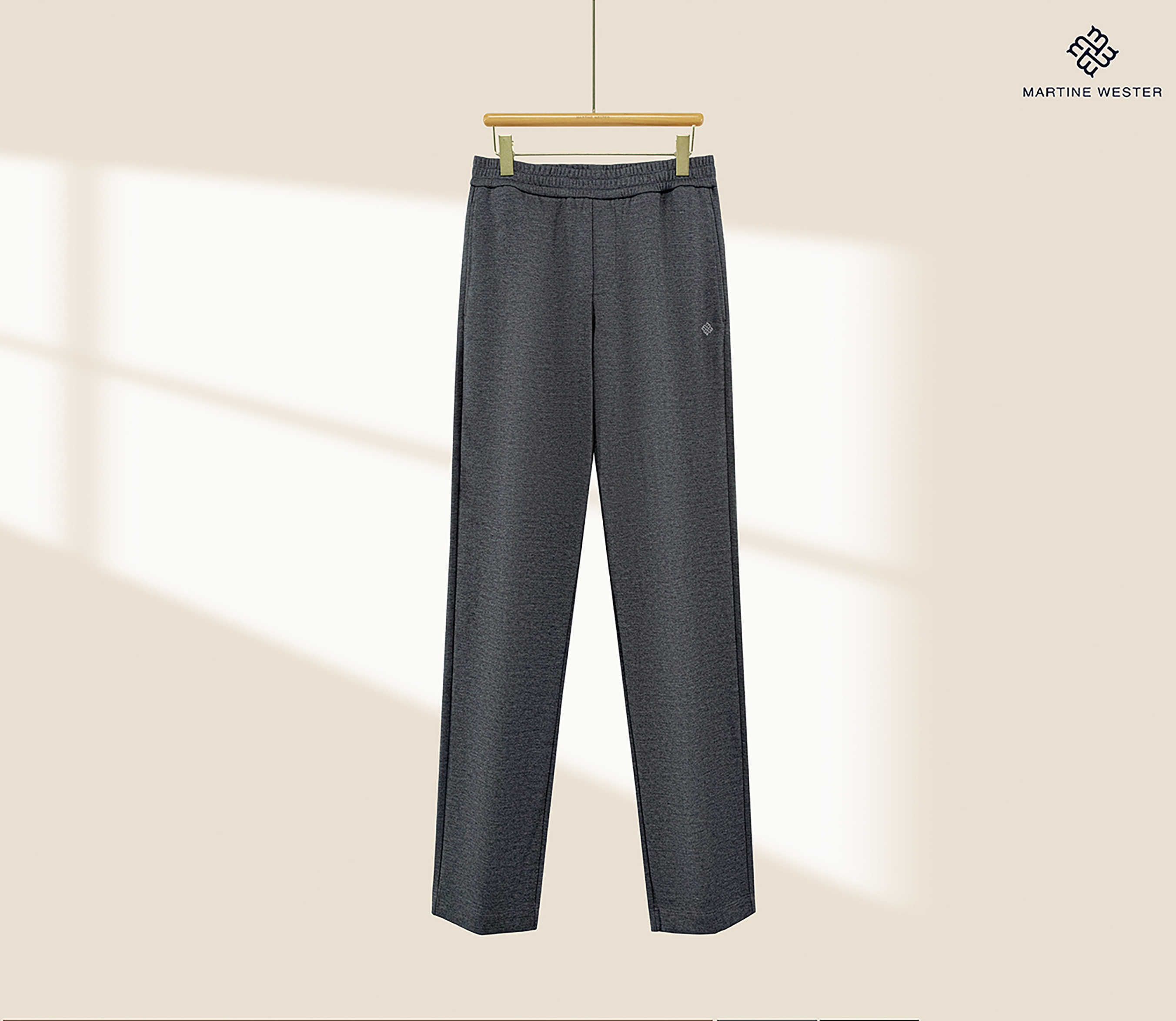 Martine Wester 男款羊毛起绒面料松紧腰直脚口卫裤; 采用天丝羊毛混纺针织面料,垂感好,有弹力,两者的混合,既保留了羊毛的温暖特性,又让穿着者享受到了天丝柔滑触感 宽松裤型,松紧腰加抽绳的设计,穿着舒适,对腰围尺寸有较高的包容度,不挑版型。