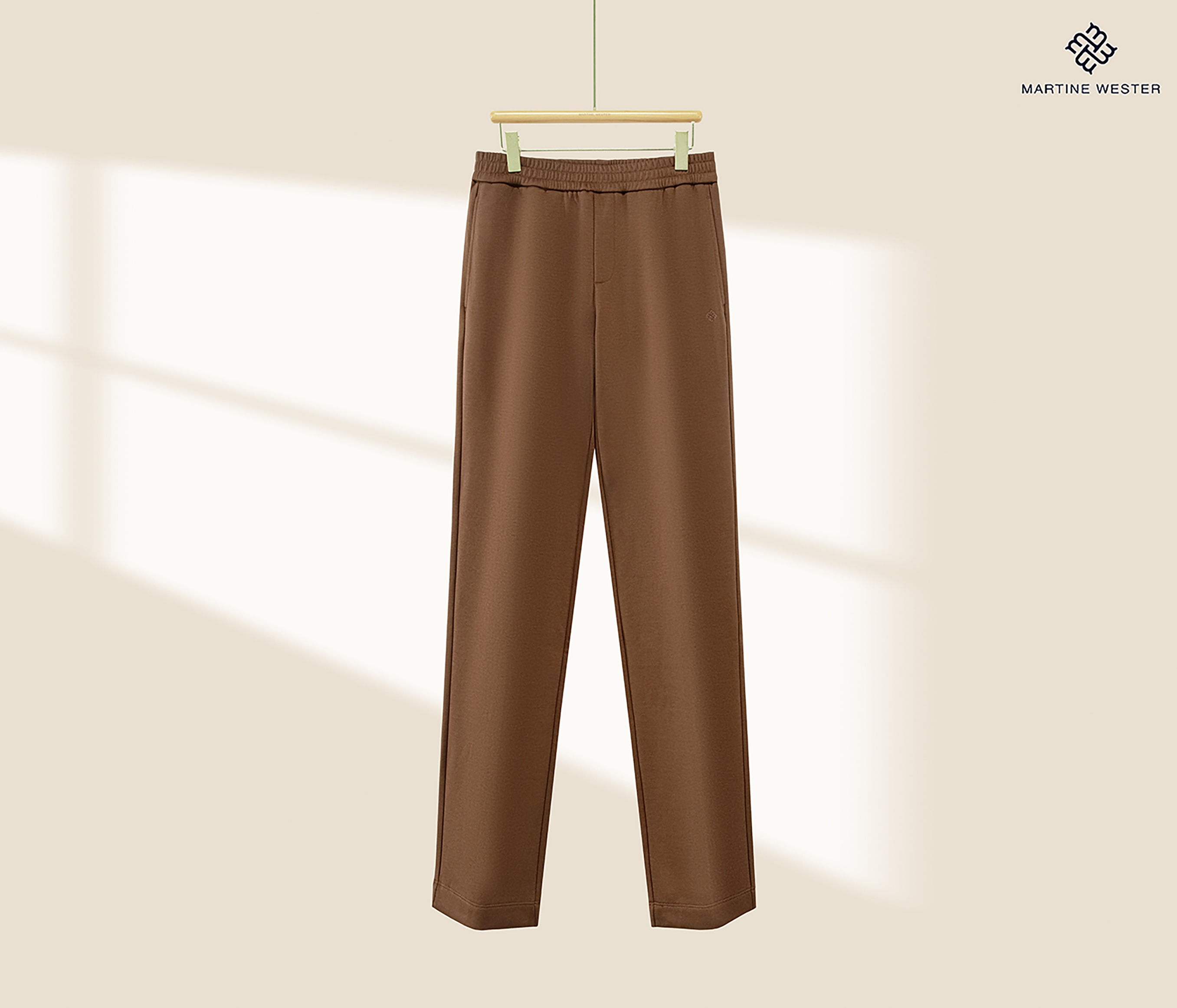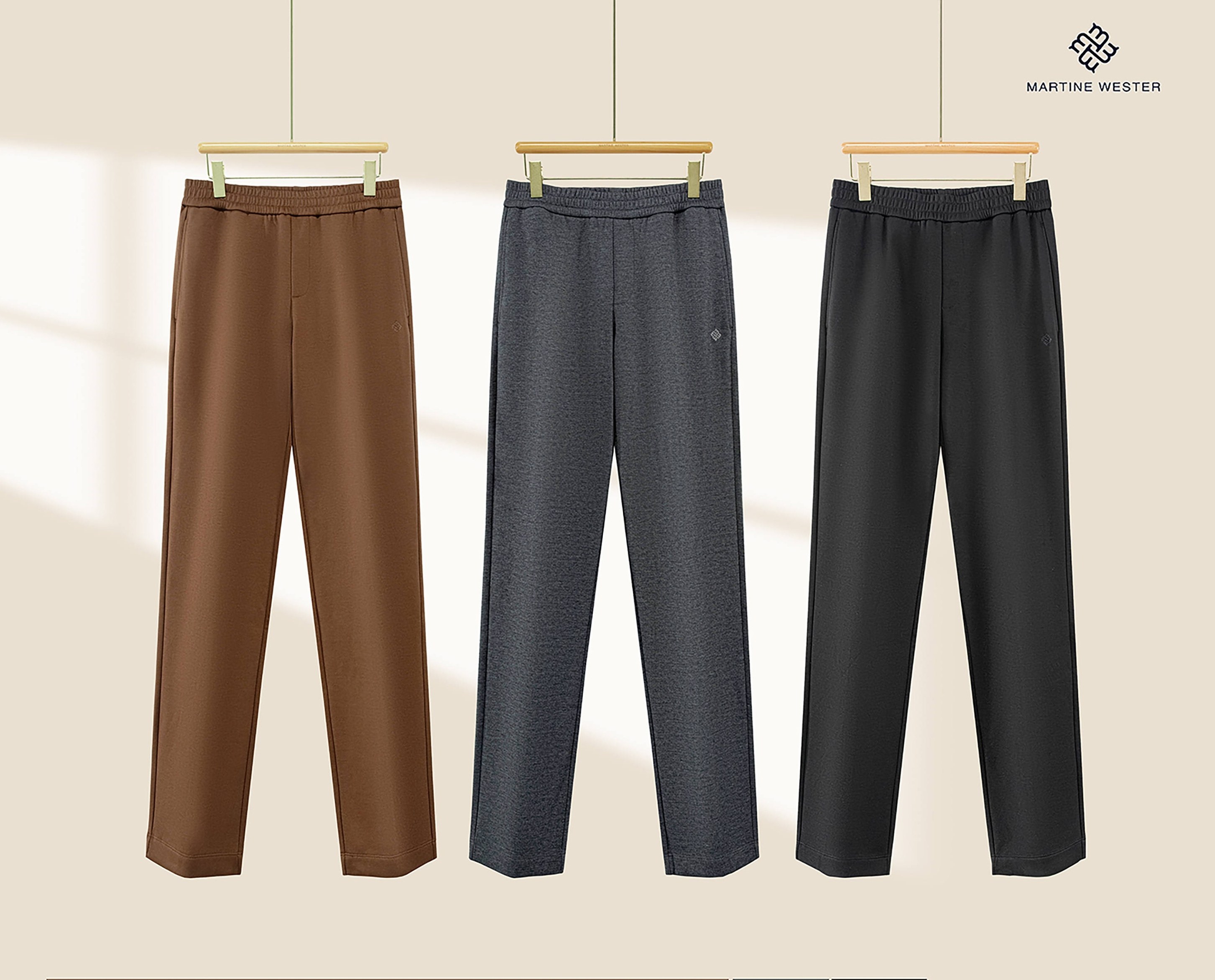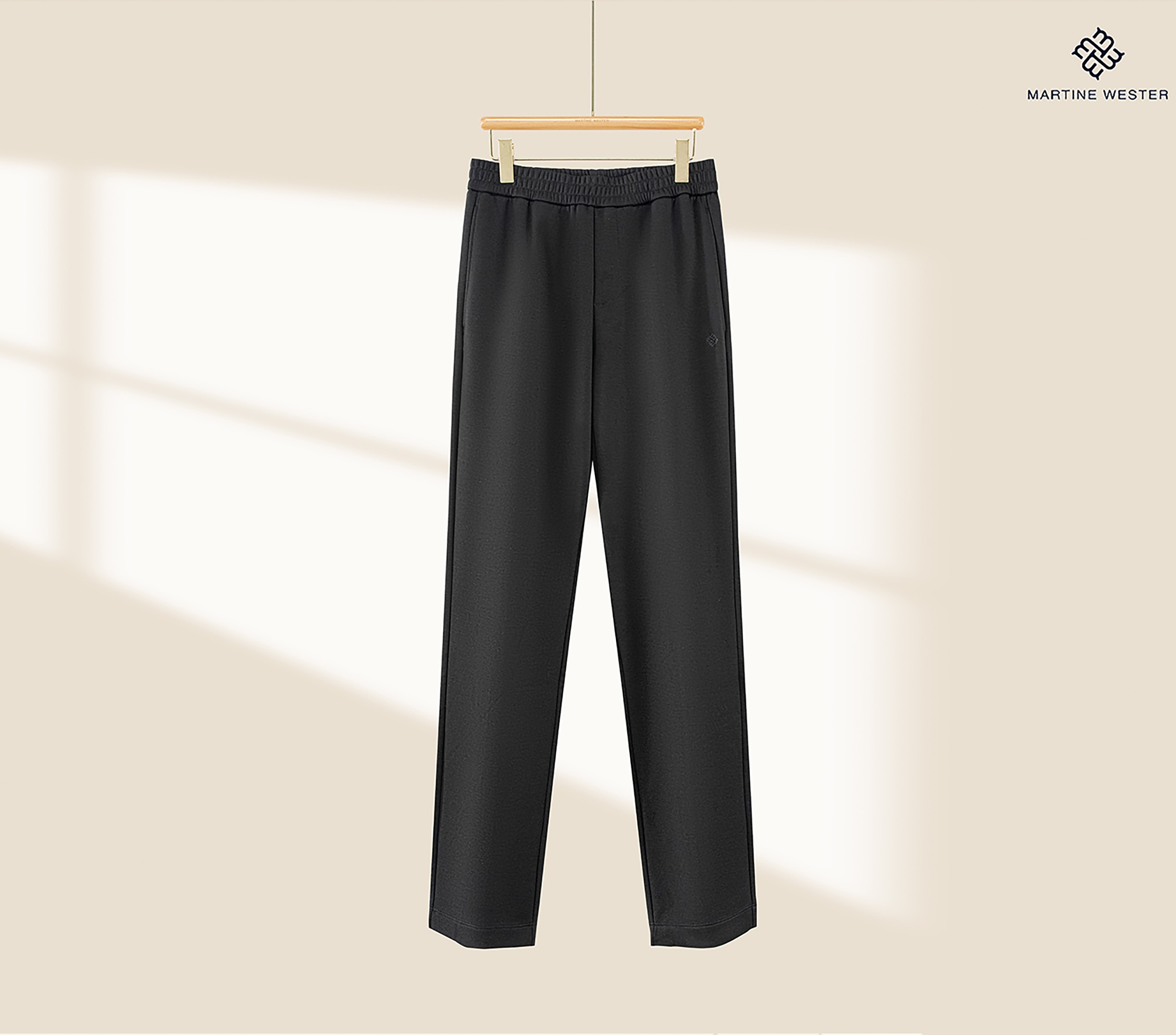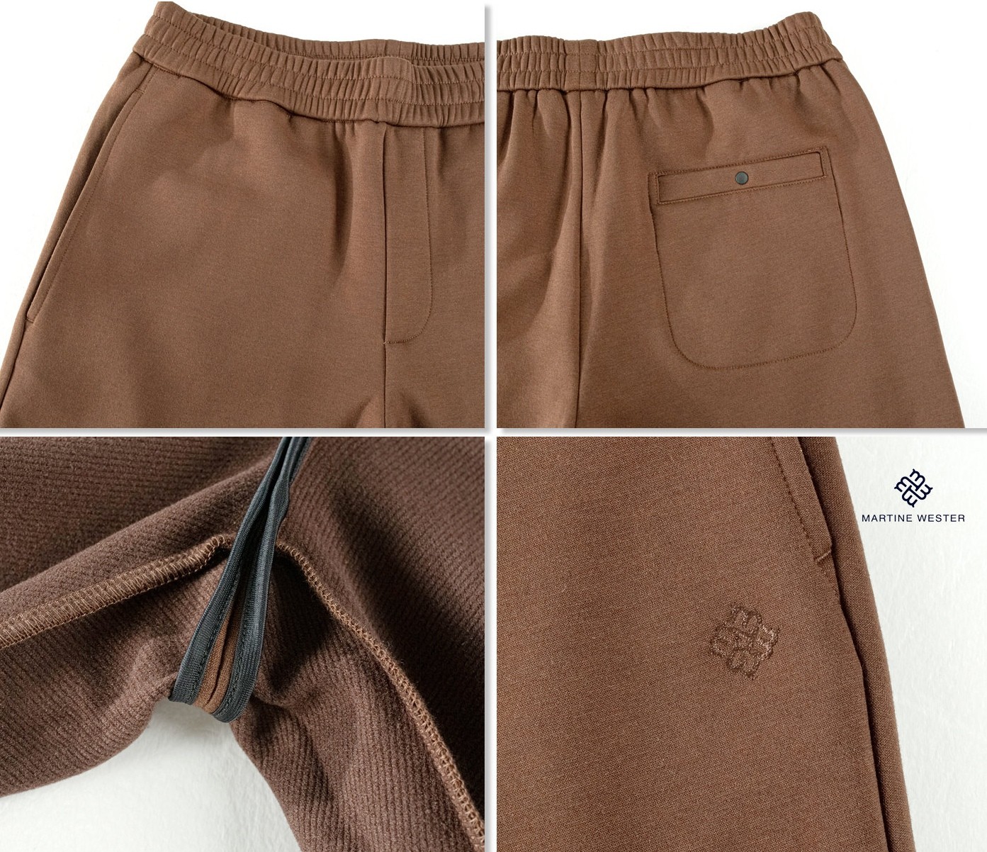 Martine Wester 男款羊毛起绒面料松紧腰直脚口卫裤; 采用天丝羊毛混纺针织面料,垂感好,有弹力,两者的混合,既保留了羊毛的温暖特性,又让穿着者享受到了天丝柔滑触感 宽松裤型,松紧腰加抽绳的设计,穿着舒适,对腰围尺寸有较高的包容度,不挑版型。