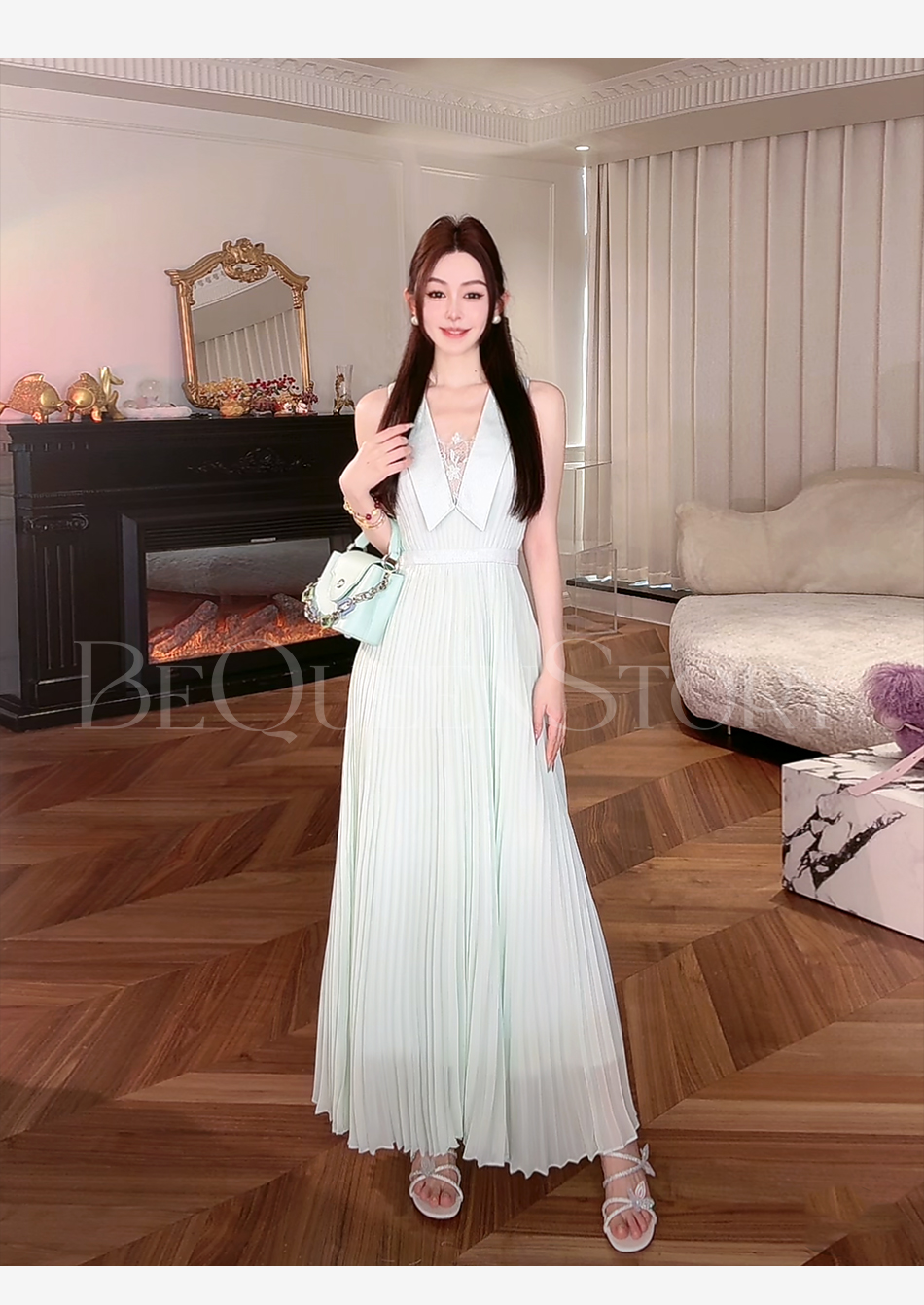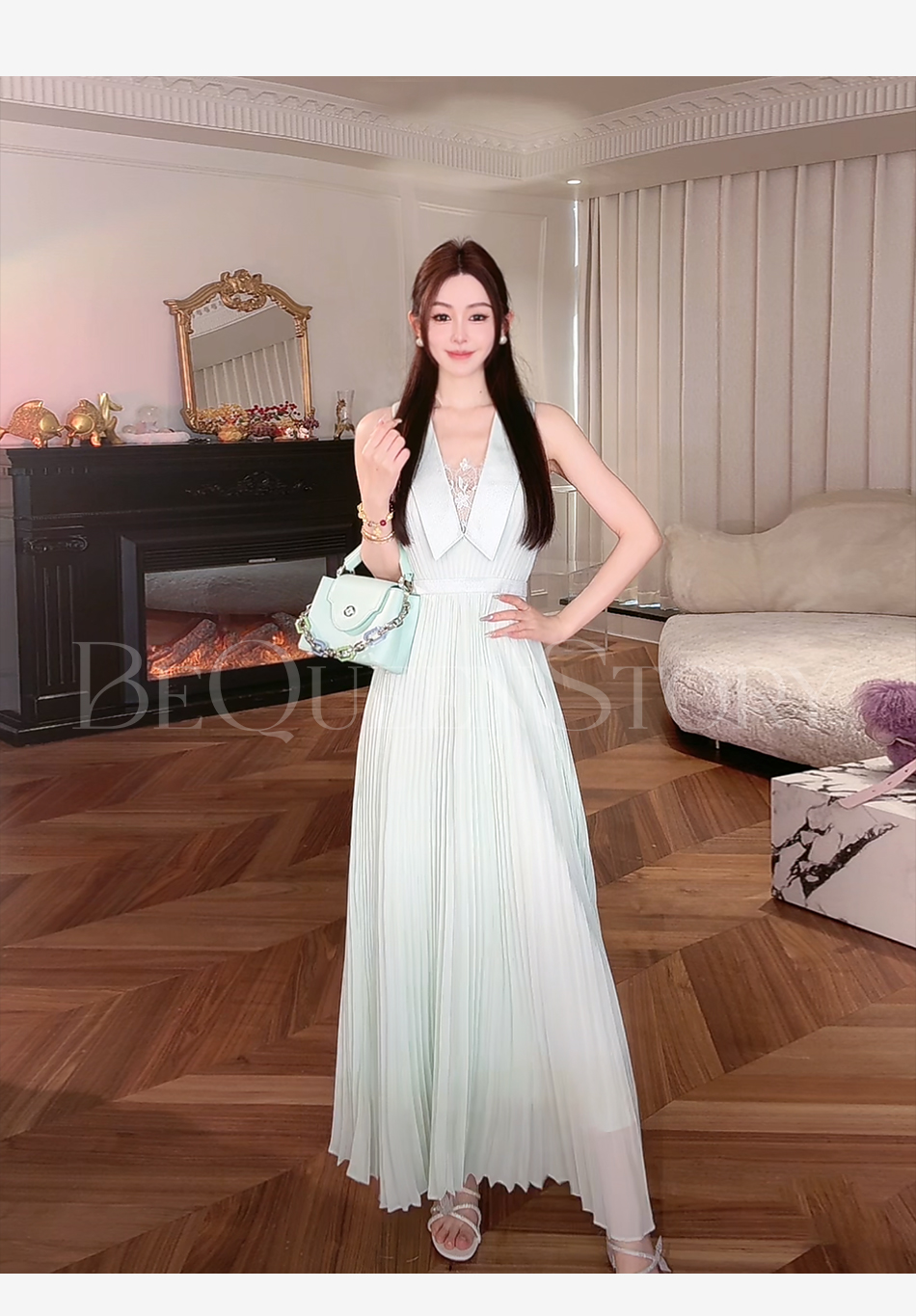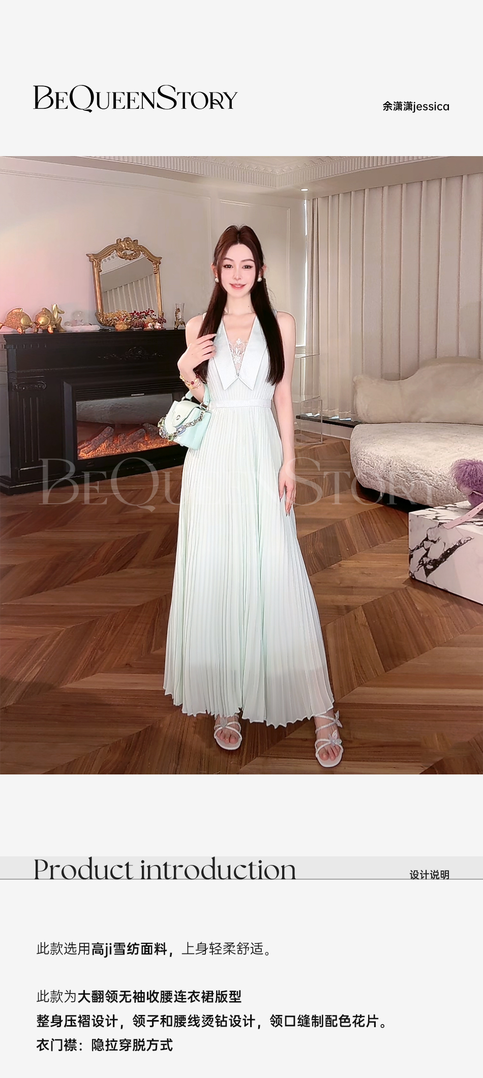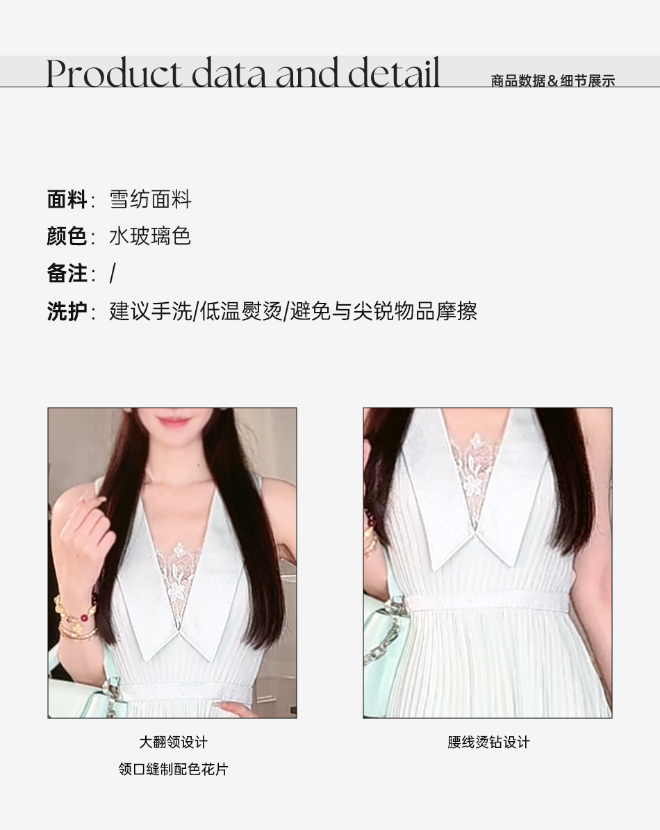 余潇潇【海上风琴】2025春装新款欧若风轻奢精致压褶无袖翻领连衣