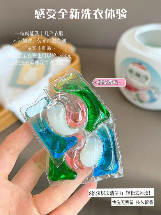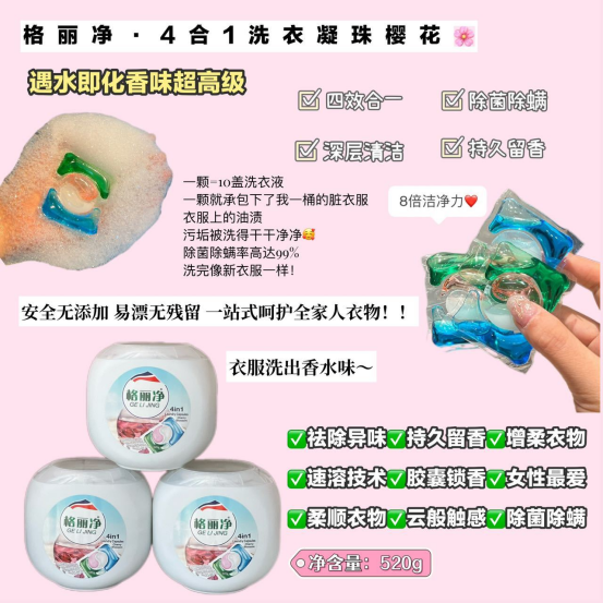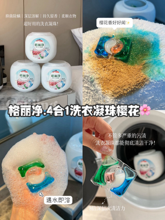 格丽净.4合1洗衣凝珠樱花 ✅微囊留香科技,品质香氛,凝时留香 ✅柔顺因子,柔顺护衣,亲肤柔软防静电,安全无添加易漂无残留 ✅强效除菌除螨