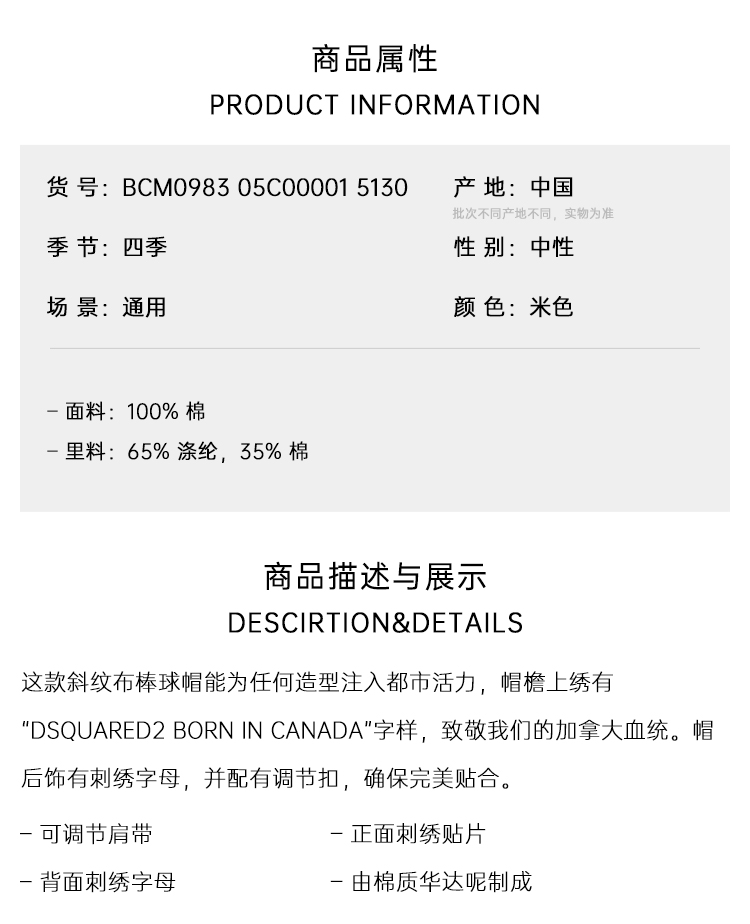 DSQUARED2 中性徽标贴片刺绣棉质棒球帽 米色 BCM0983 05C00001 5130