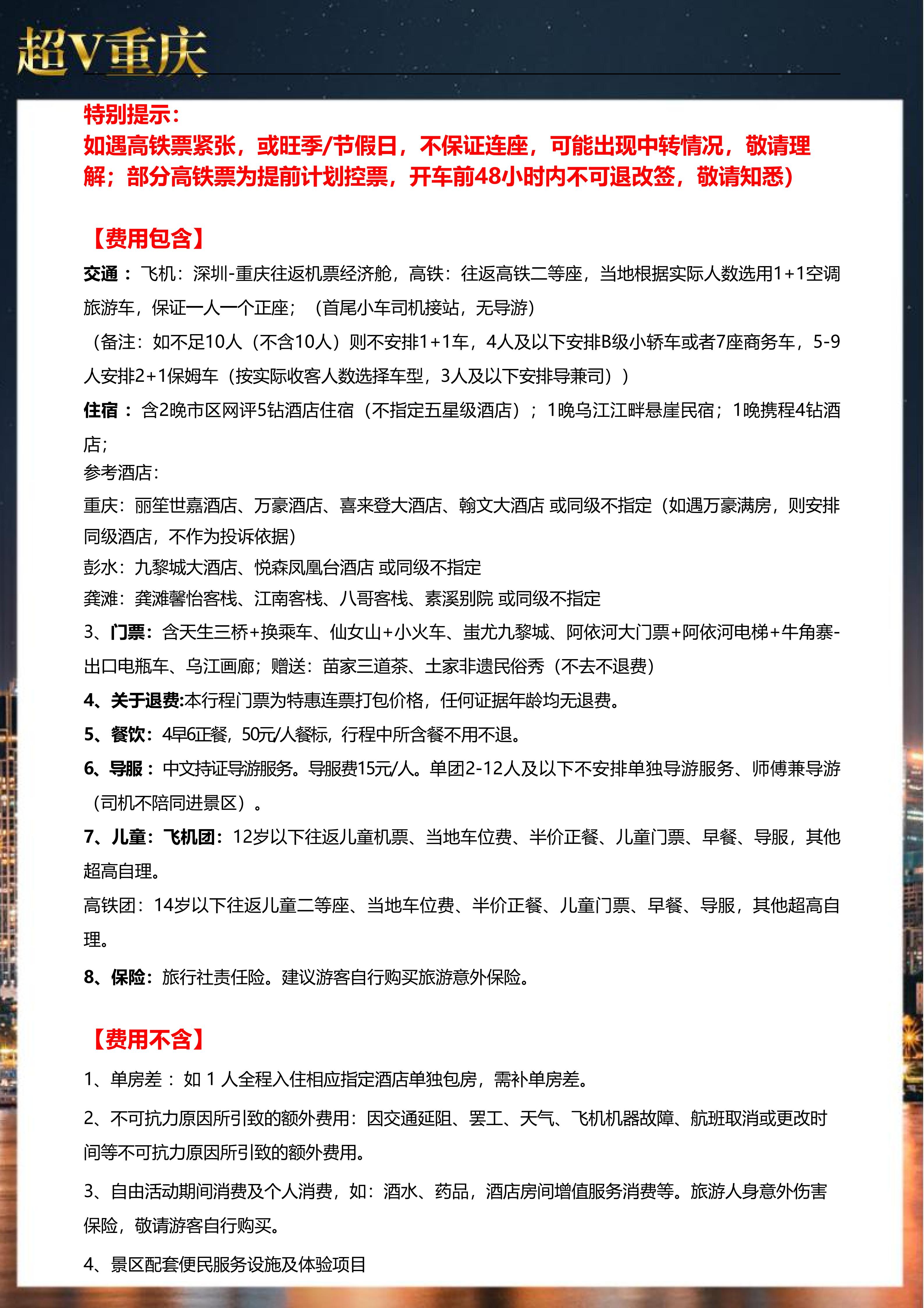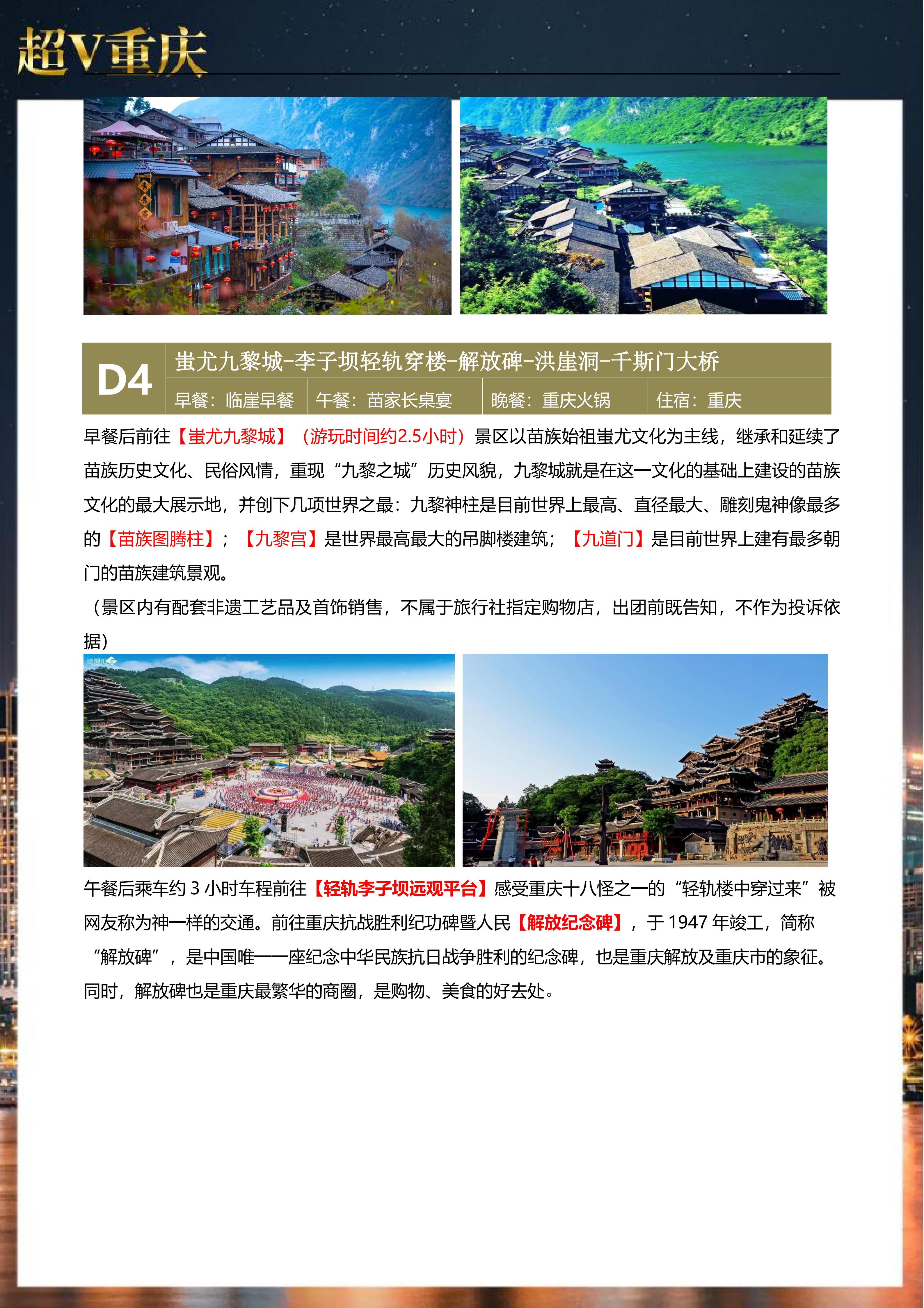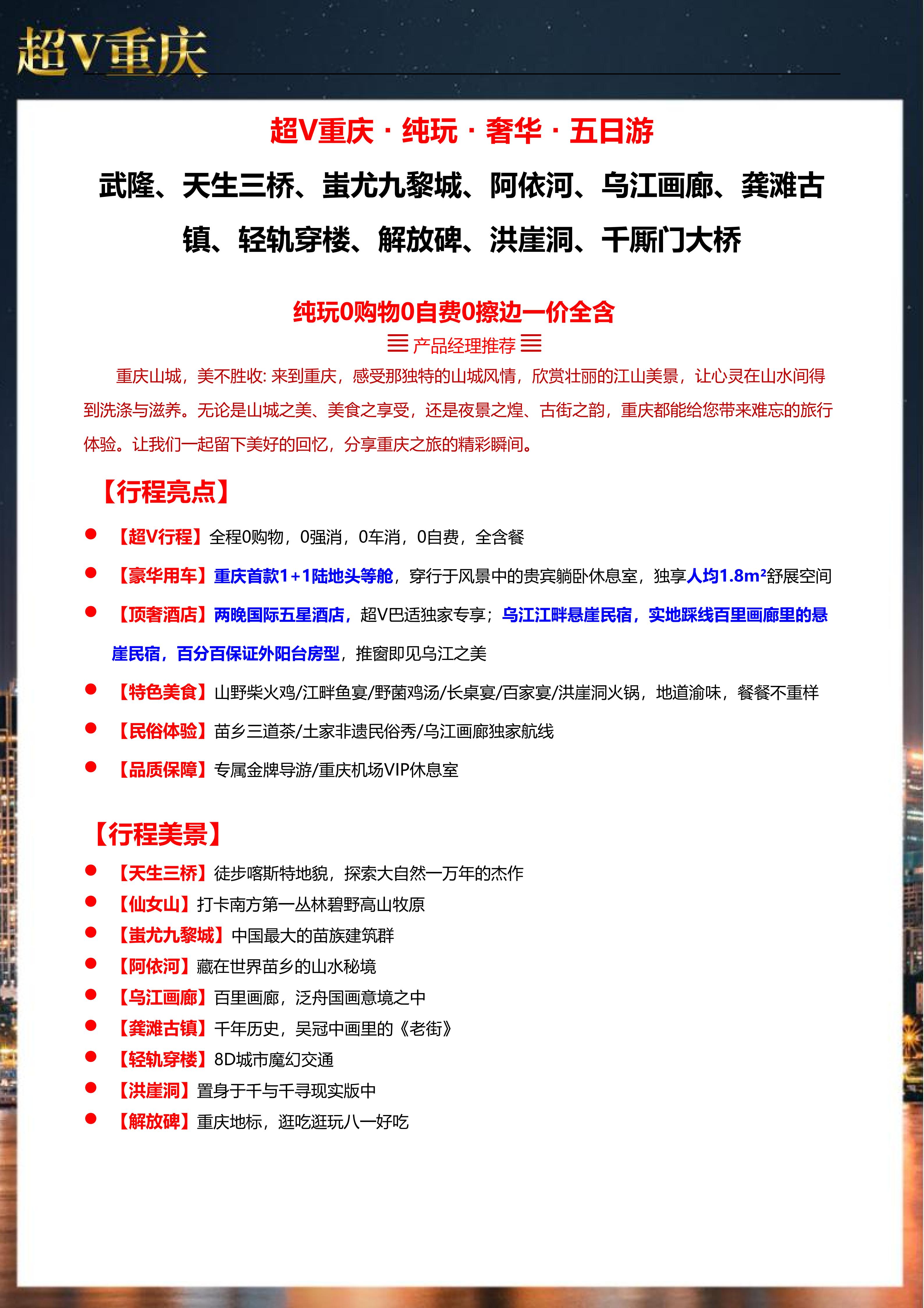 <重庆5天精品纯玩团(15-20人)>武隆、天生三桥、蚩尤九黎城、阿依河、乌江画廊、龚滩古镇、非遗民俗、轻轨穿楼、解放碑、洪崖洞、千厮门大桥