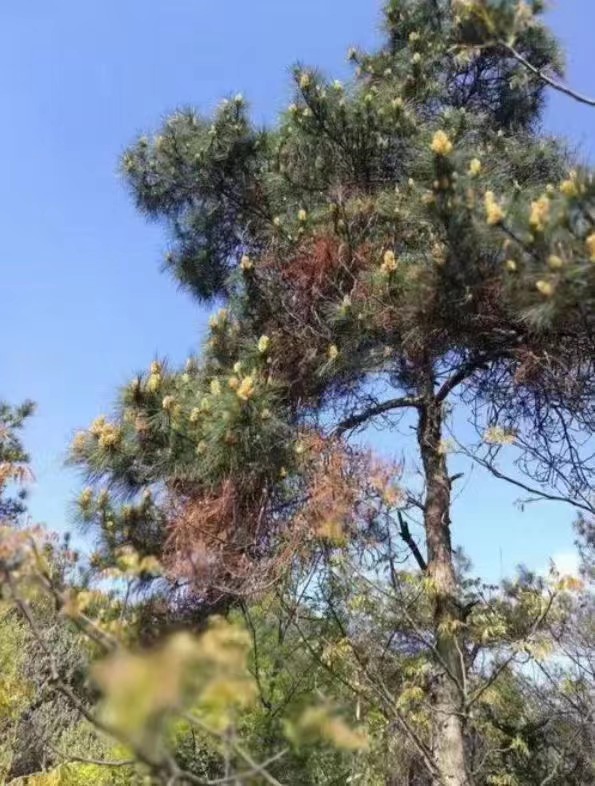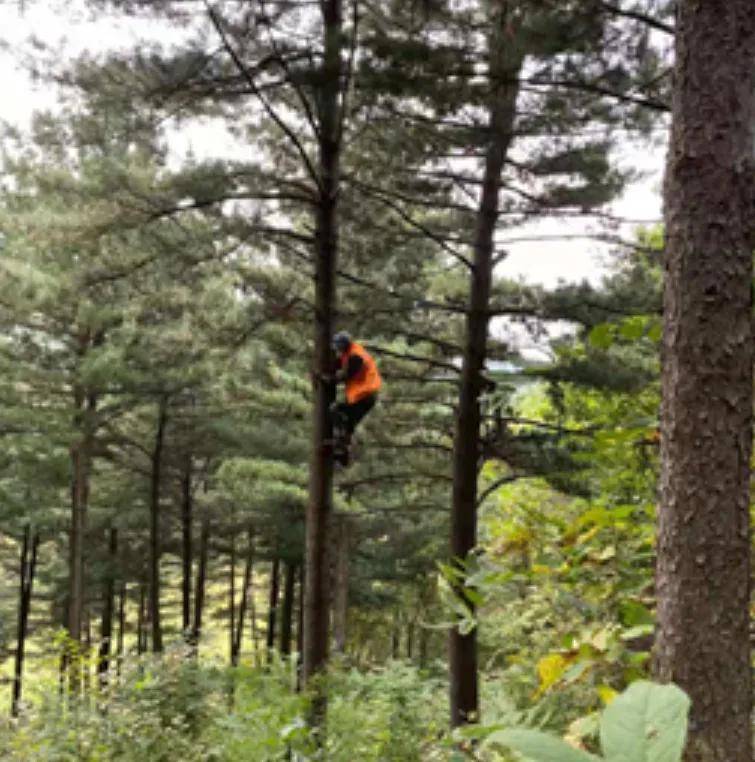 采松子是一件危险系数很高的工作,松子都长在最顶端的树尖儿上,松树都要在二三四十米以上。