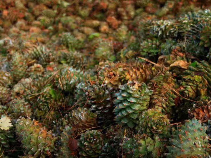 松子采集的农人都要在天色蒙蒙亮的时候就启程上山,收获的季节日日如此。