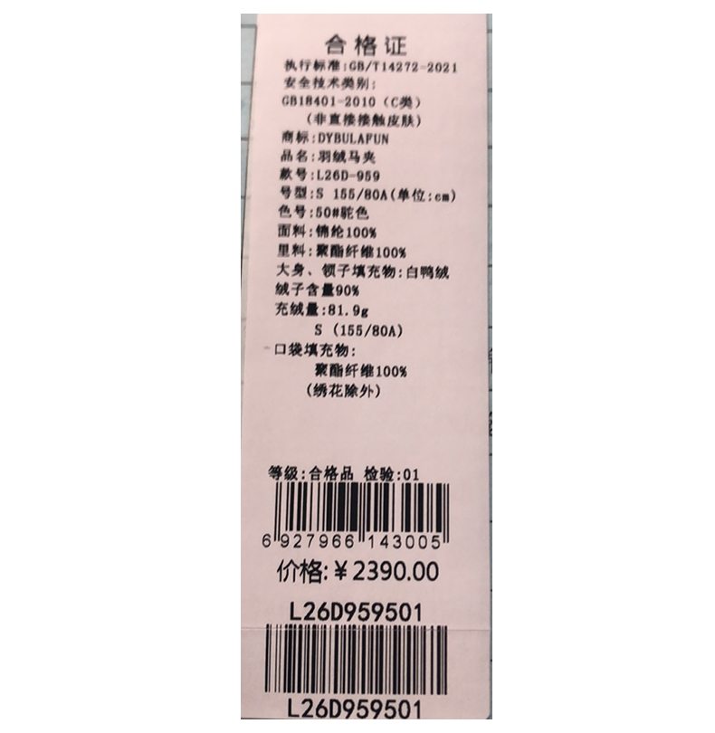 戴布拉芬羽绒服L26D959