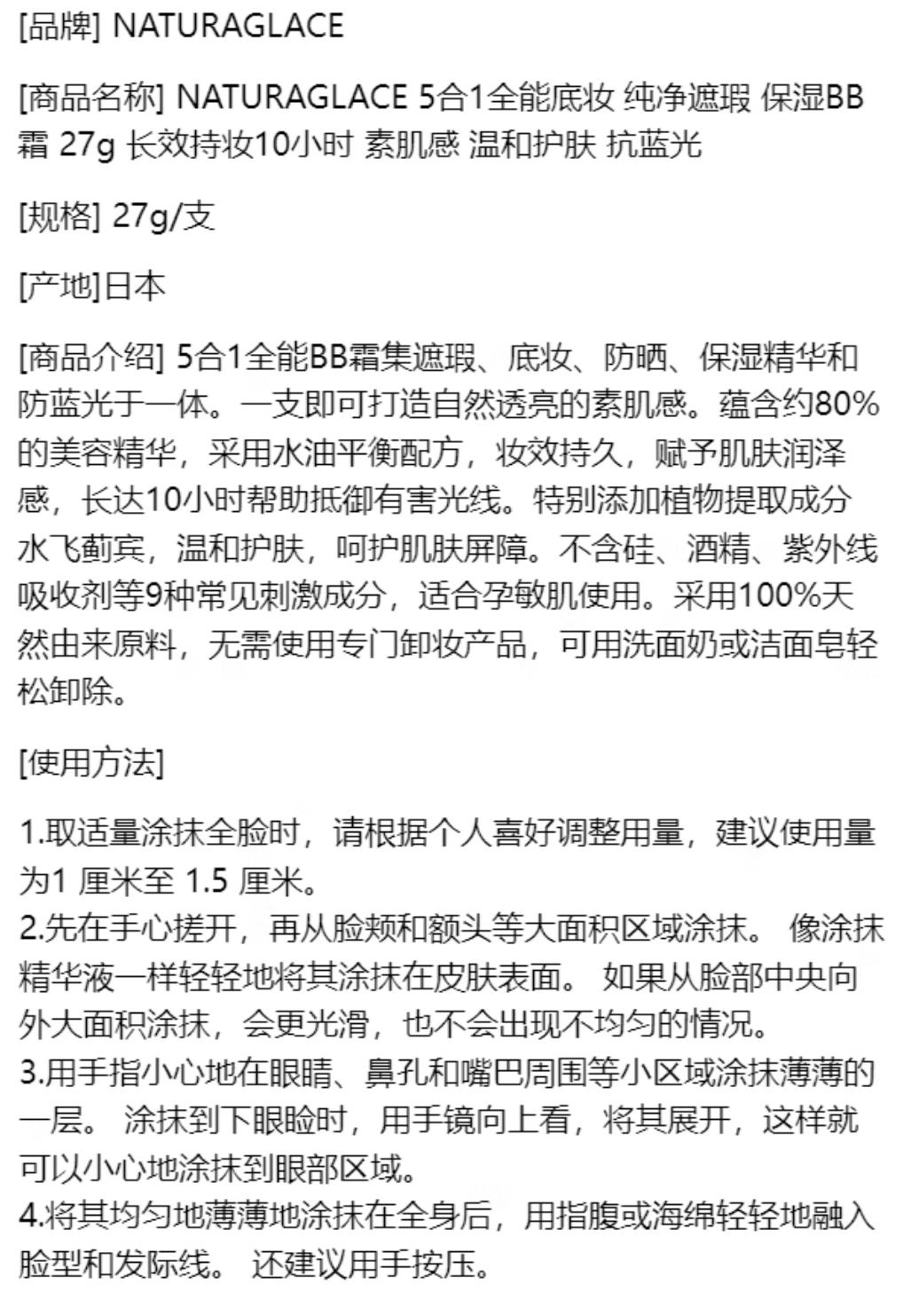naturaglace保湿BB霜防晒防蓝光遮瑕养肤27g
