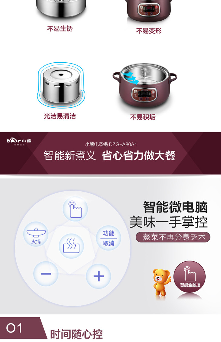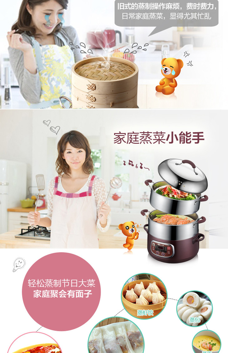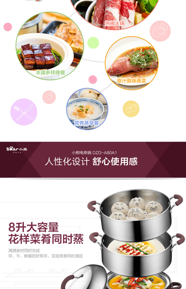 小熊(Bear)电蒸锅304不锈钢三层大容量微电脑预约定时多功能电火锅DZG-A80A1 8L