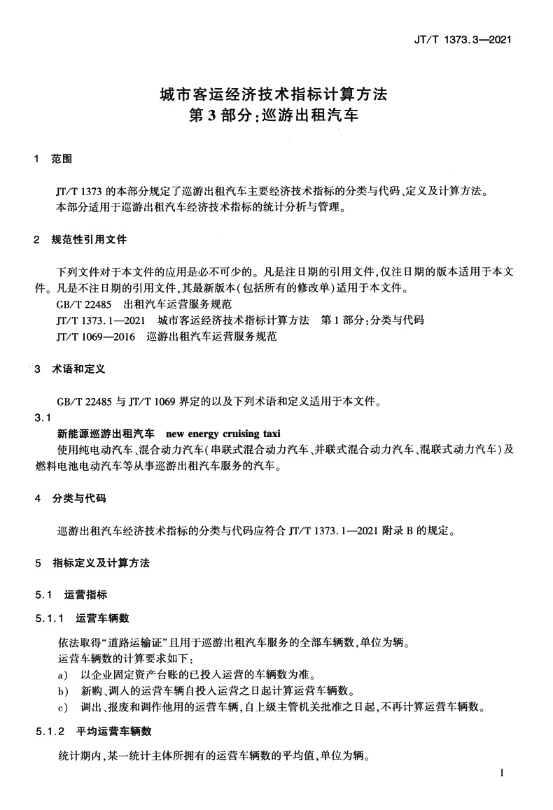 城市客运经济技术指标计算方法 第3部分:巡游出租汽车(JT/T 1373.3—2021)