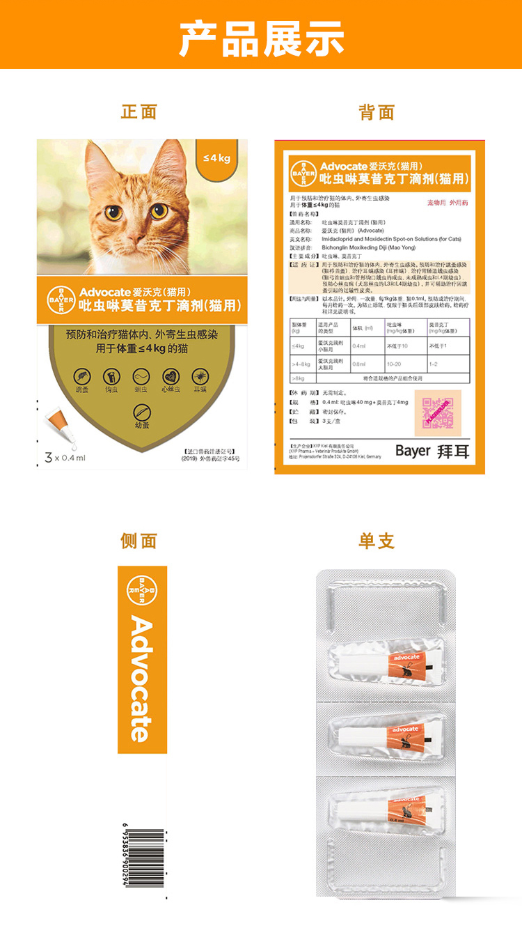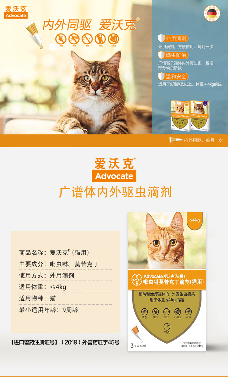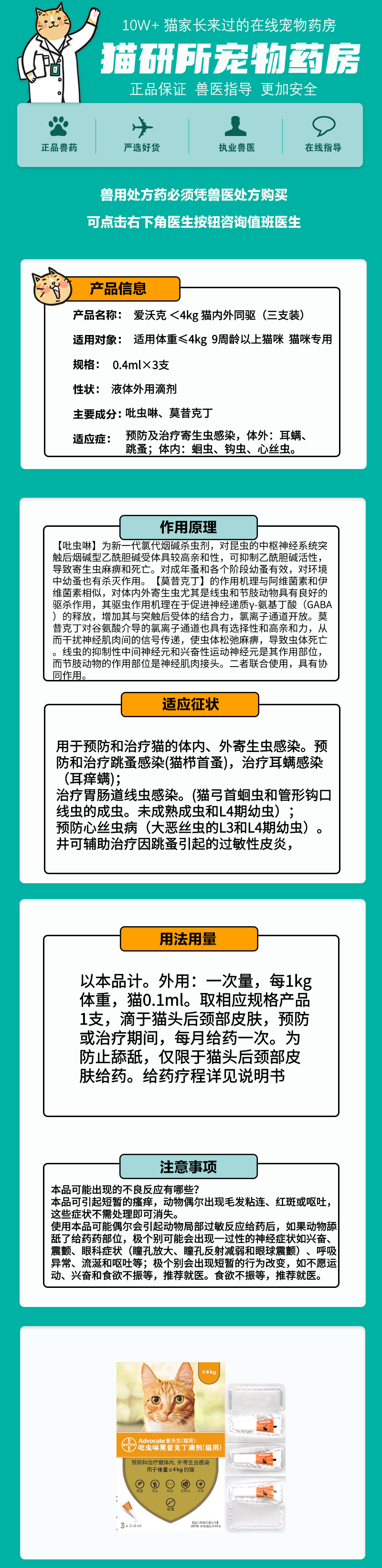 猫研所 拜耳爱沃克 小规格<4kg 猫用体内外驱虫剂三支装 跳蚤耳螨线虫蛔虫寄生虫(爱沃克日期2027年8月)