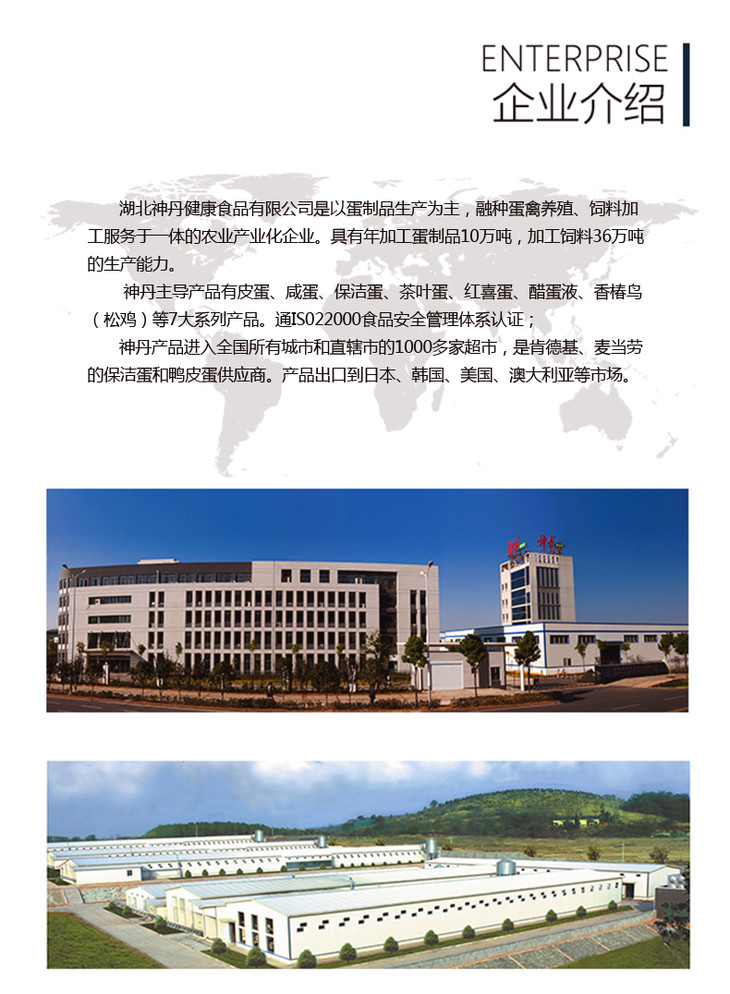 湖北神丹健康食品有限公司,中国实力雄厚的蛋产品加工企业,年生产、销售各类蛋品数亿枚,是中国目前品种全、销售广的禽蛋研发加工基地。神丹公司以“服务农民,健康人民”为宗旨,以推动中国健康食品发展为己任。