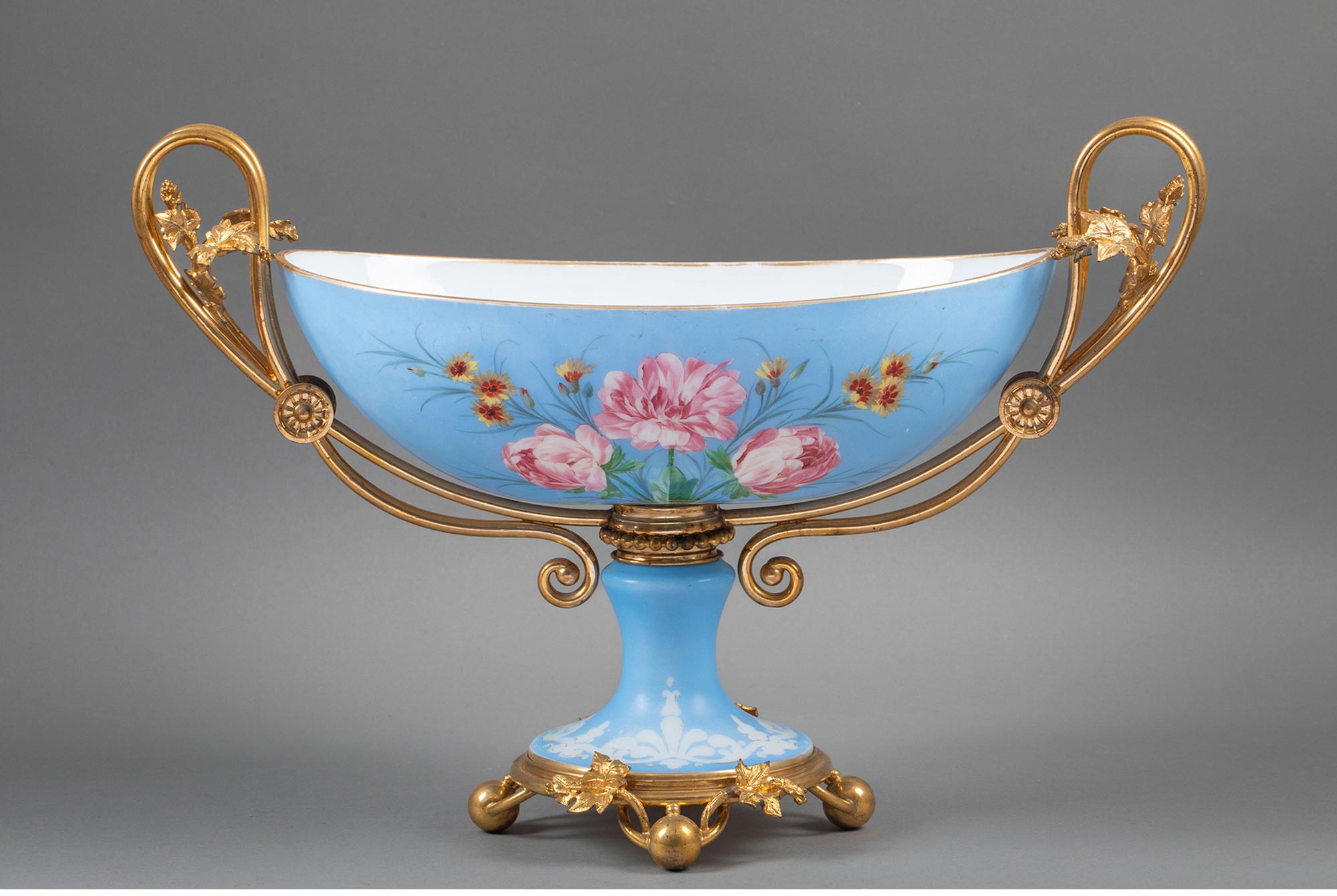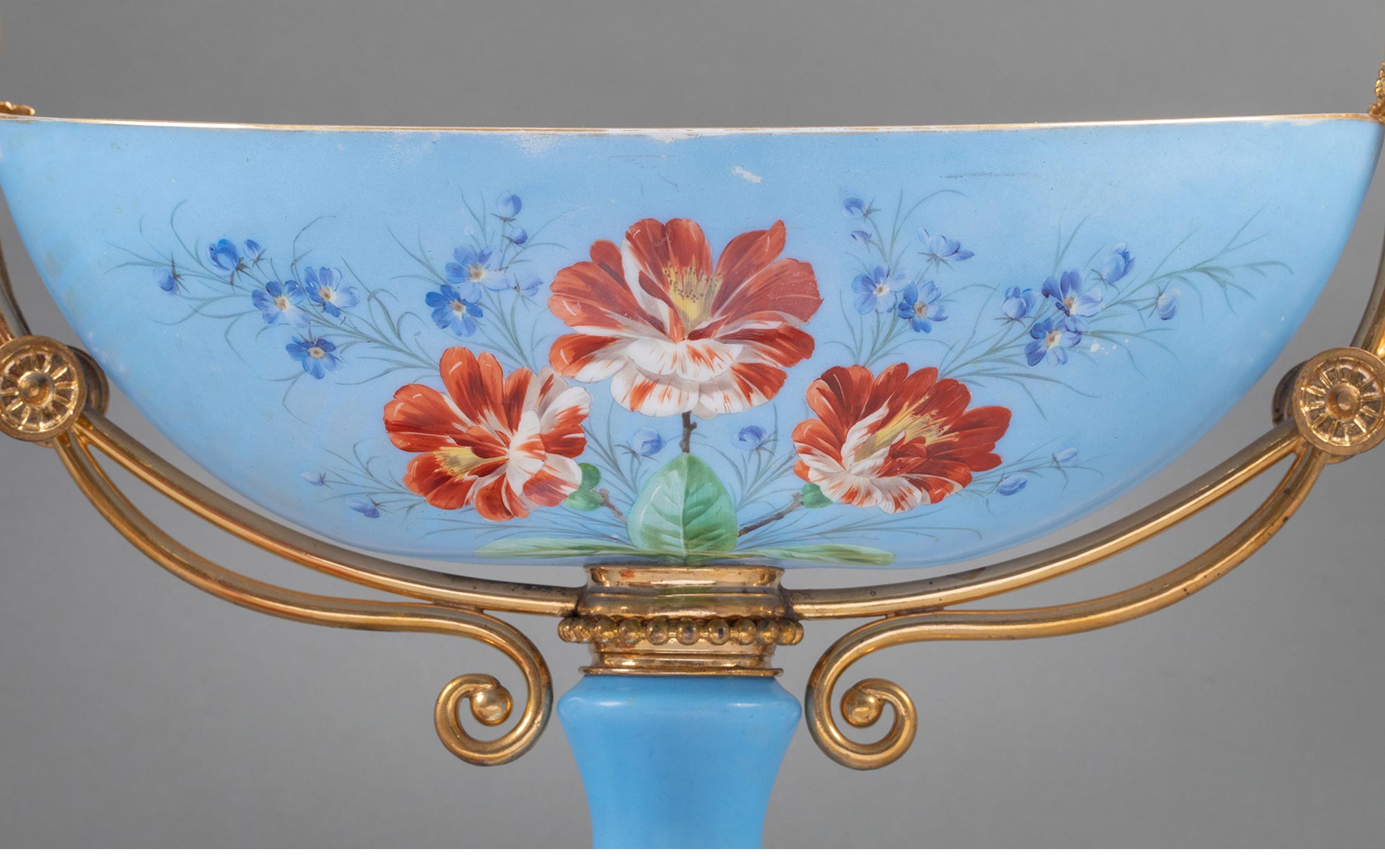 19世纪法国出品铜鎏金装饰花卉主题手绘蓝色欧泊水晶果樽