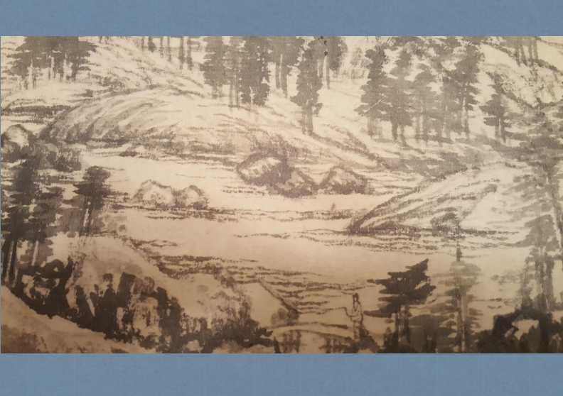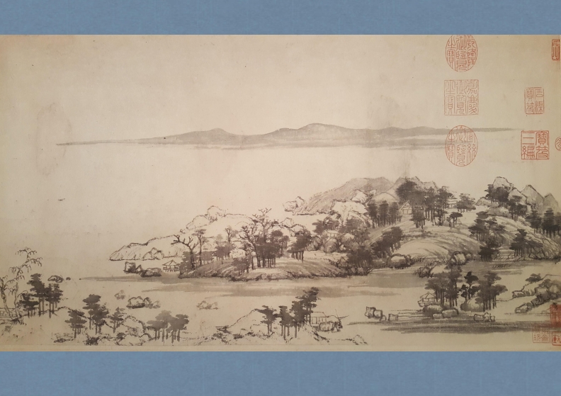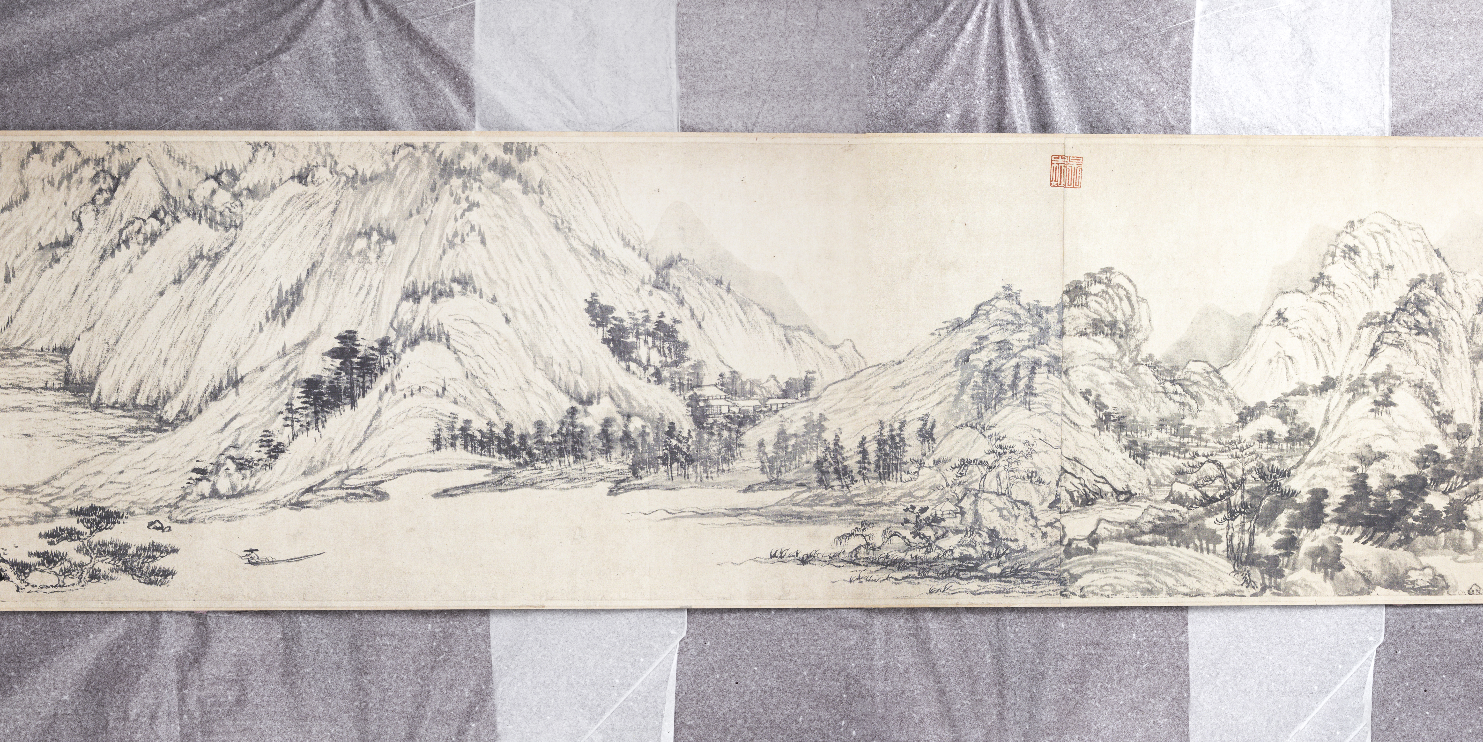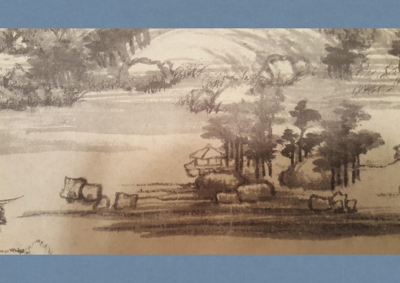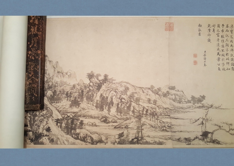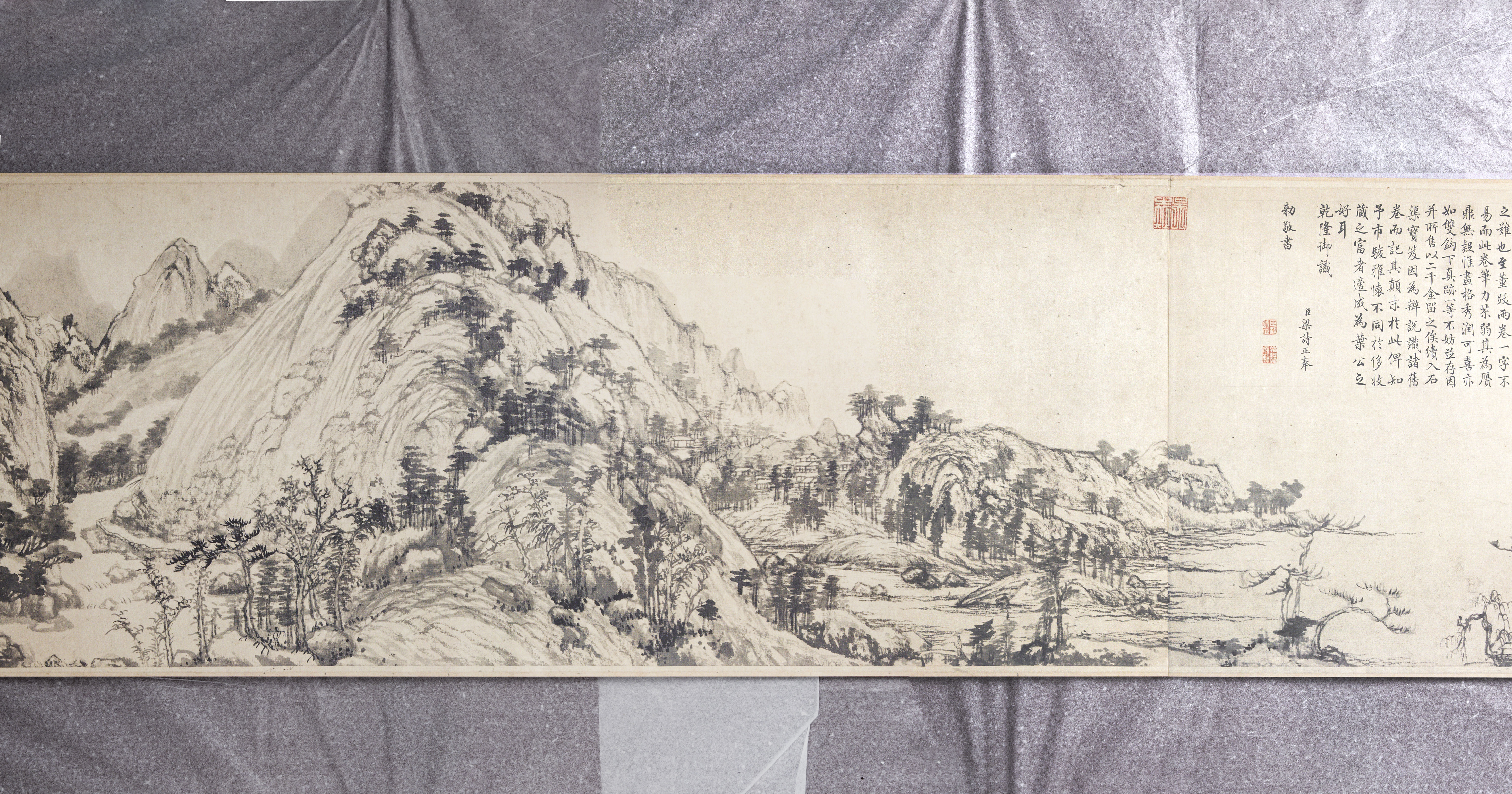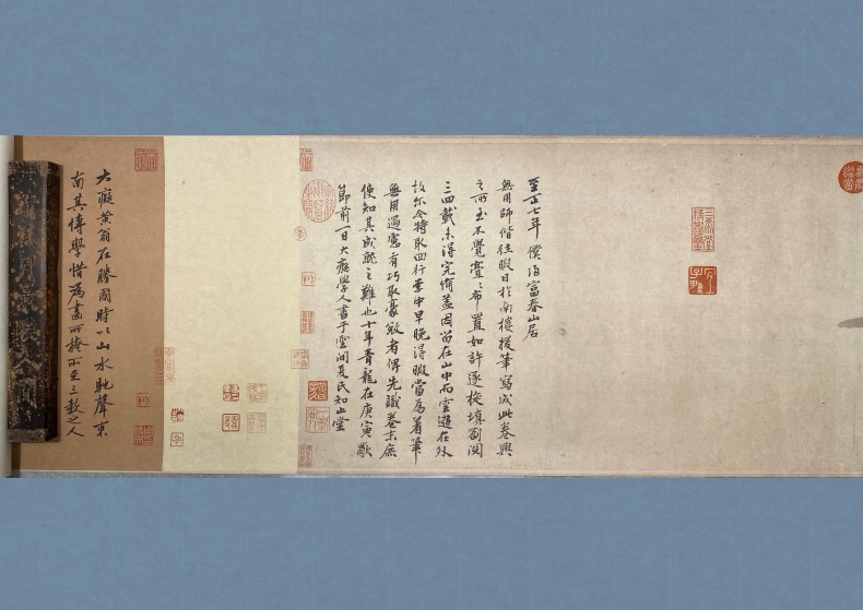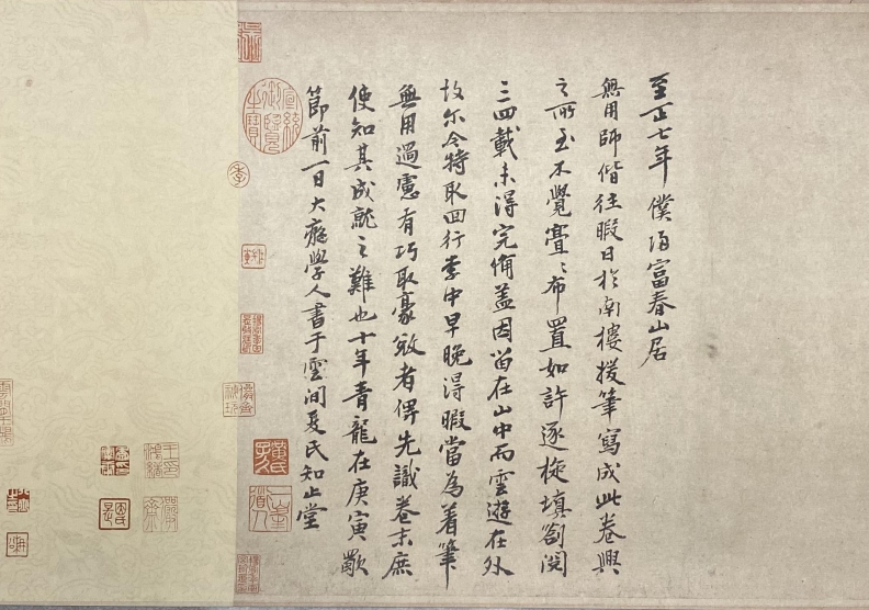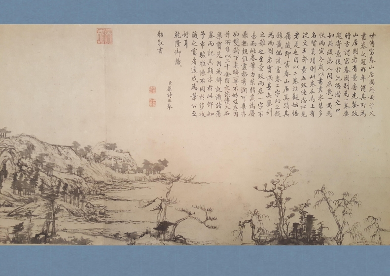 水墨畫煙樹雲山,沙汀村社。幅後自題:至正七年,僕歸富春山居,無用師偕往,暇日于南樓援筆寫成此卷。興之所至,不覺疊疊布置如許,逐旋填剳,閱三四載未得完備。蓋因留在山中,而雲遊在外故爾。今特取回行李中,早晚得暇,當為著筆。無用師過慮有巧取豪敓者,俾先識卷末,庶使知其成就之難也。十年青龍在庚寅,歜節前一日,大癡學人書于雲間夏氏知止堂。鈐印二:黃氏子久。一峰道人。