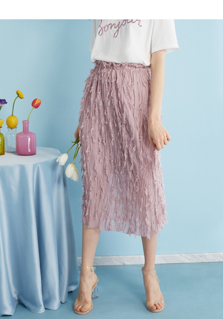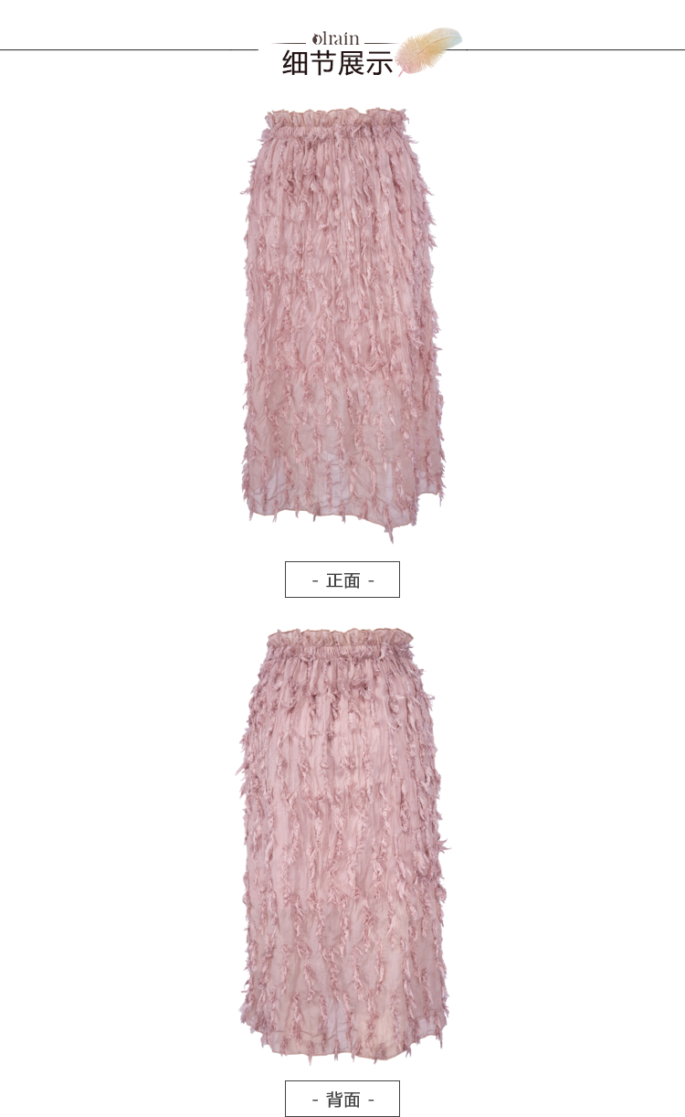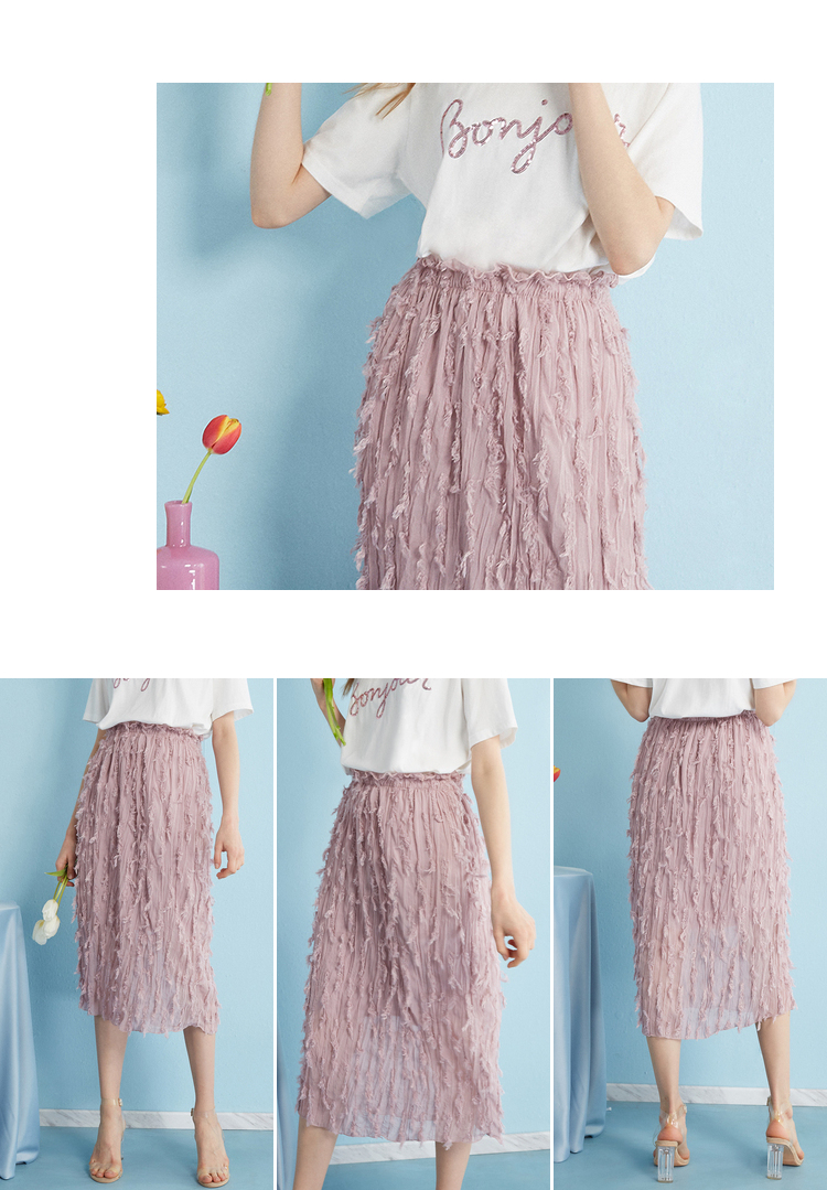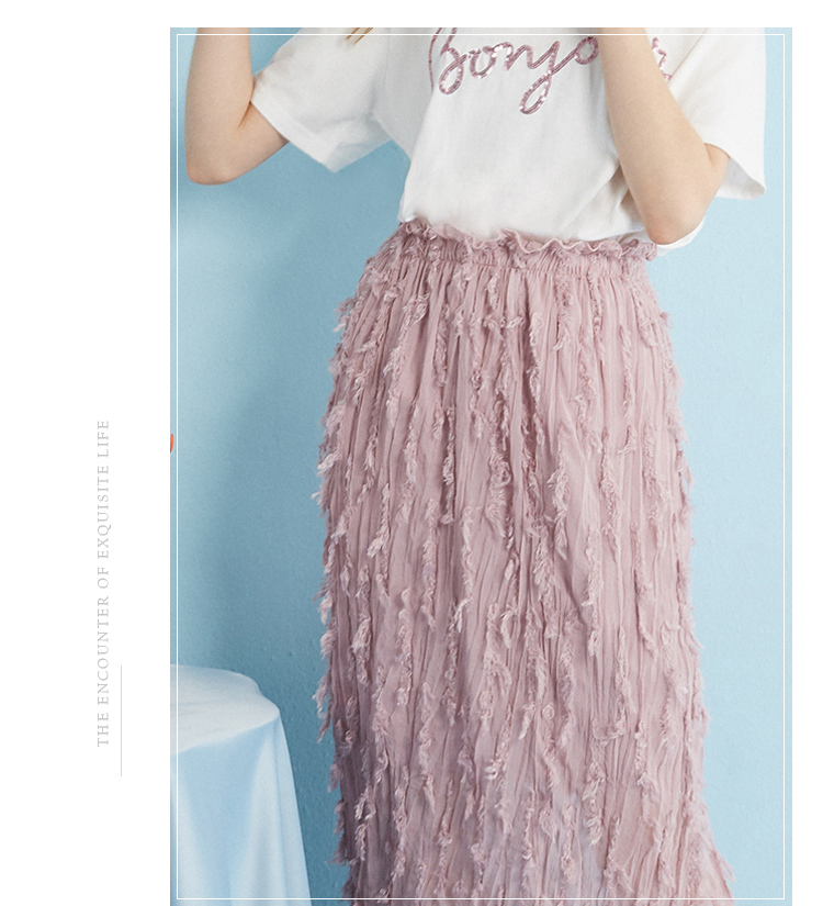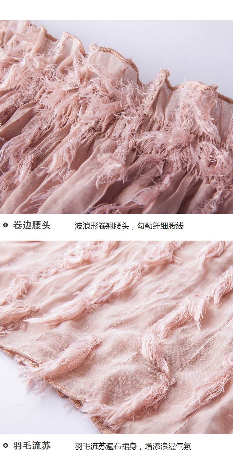 2018夏收腰显瘦粉色羽毛流苏百褶半身裙女中长款