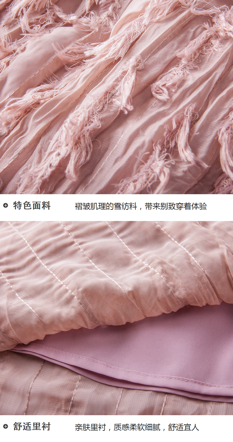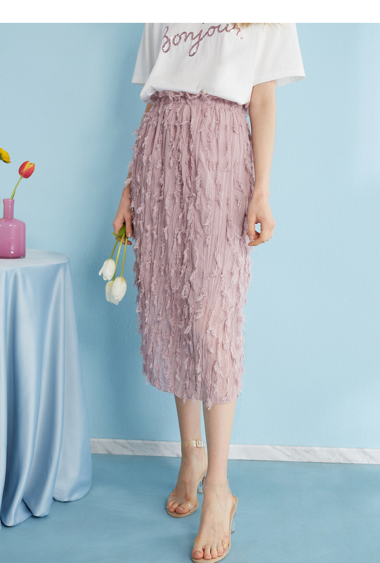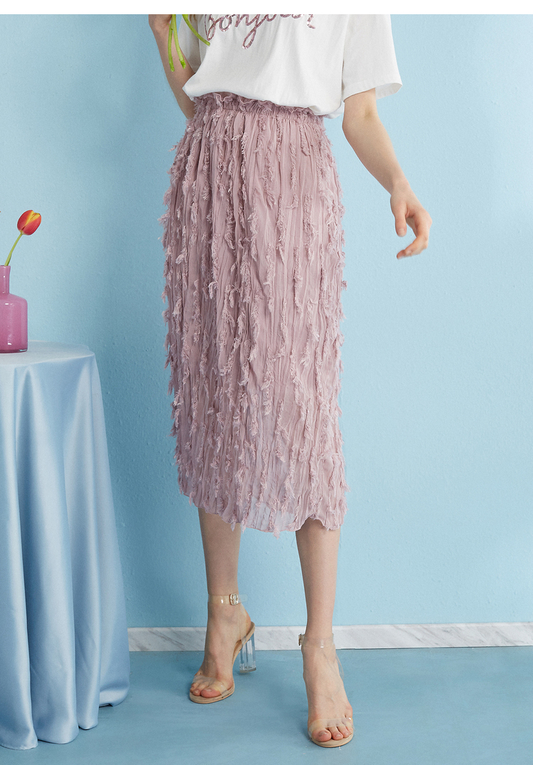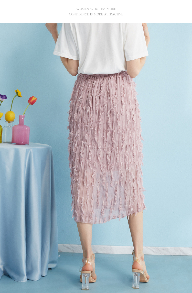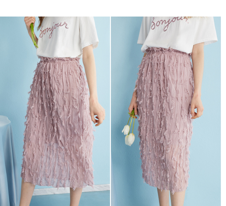 2018夏收腰显瘦粉色羽毛流苏百褶半身裙女中长款