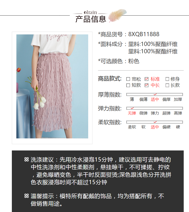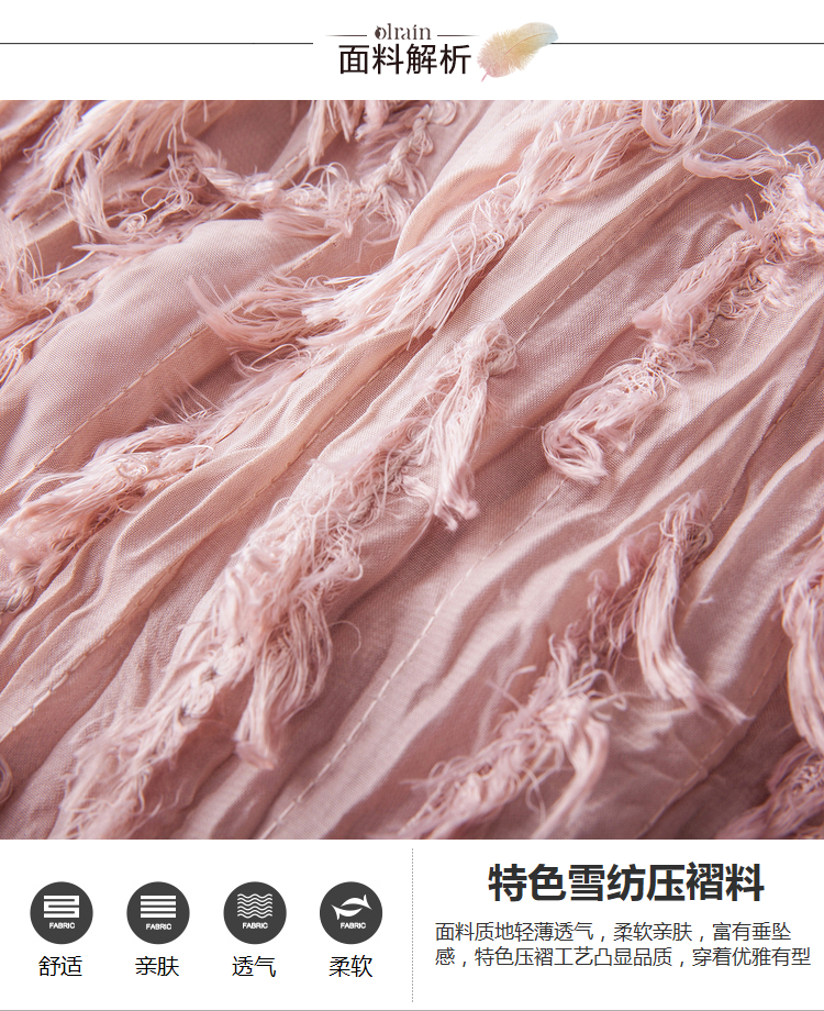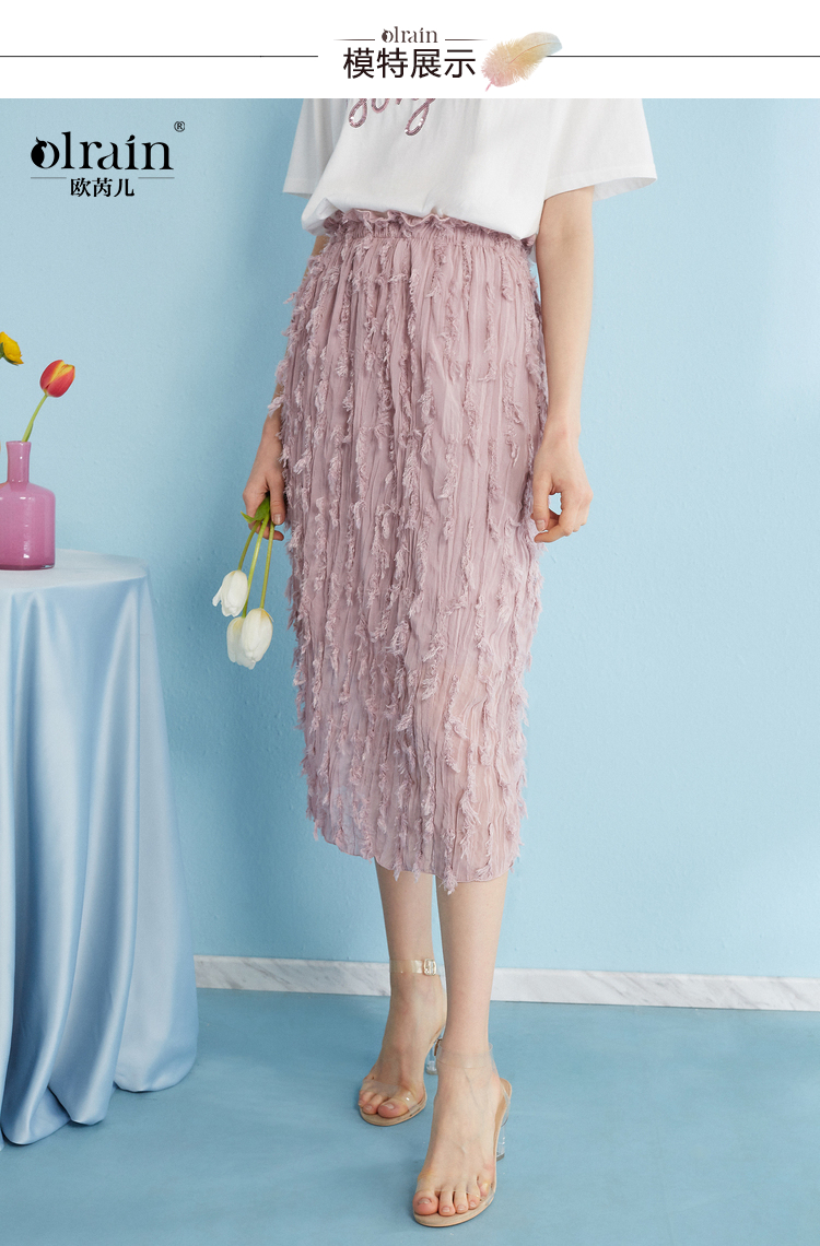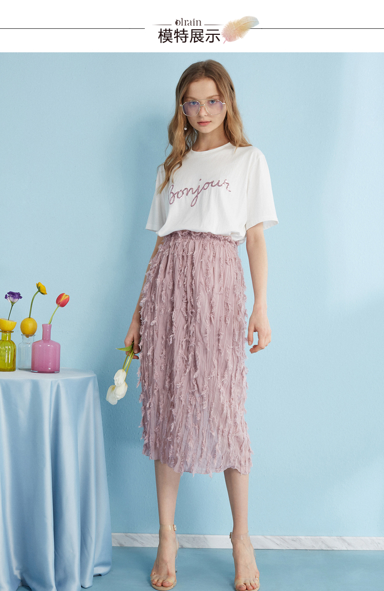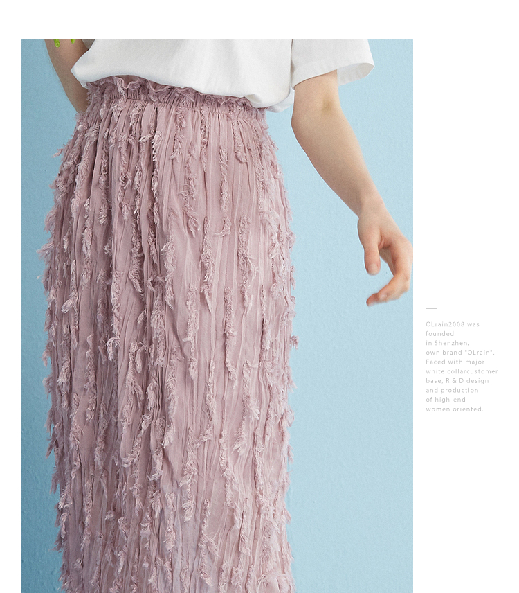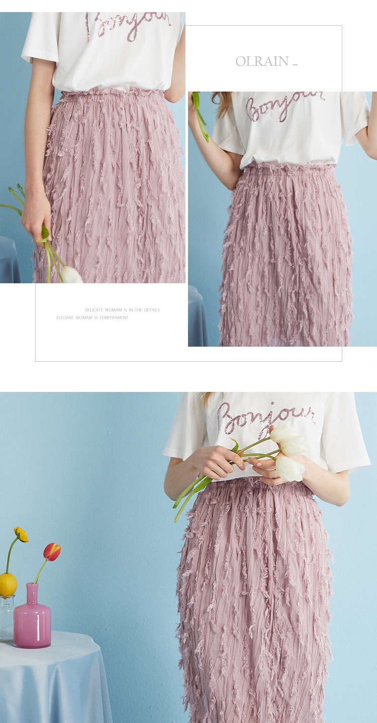 2018夏收腰显瘦粉色羽毛流苏百褶半身裙女中长款