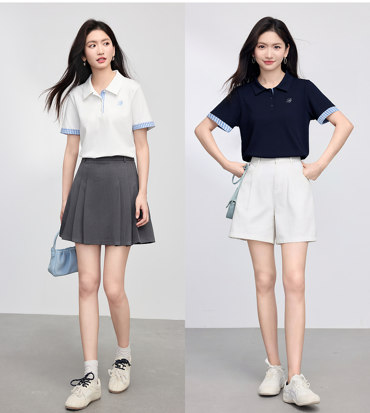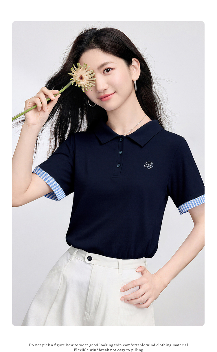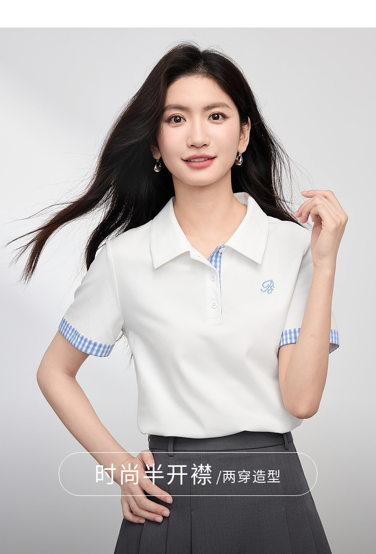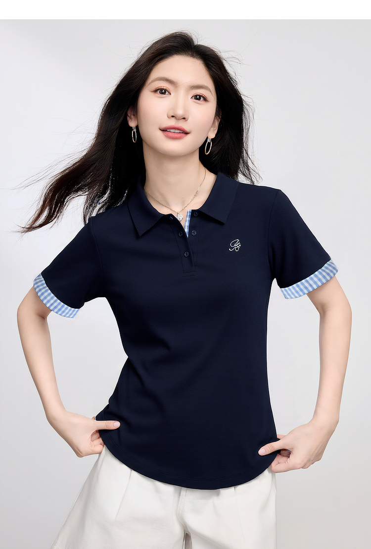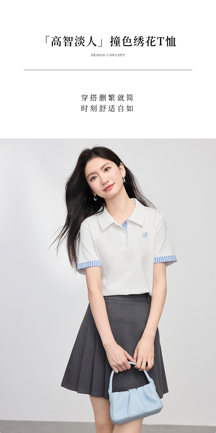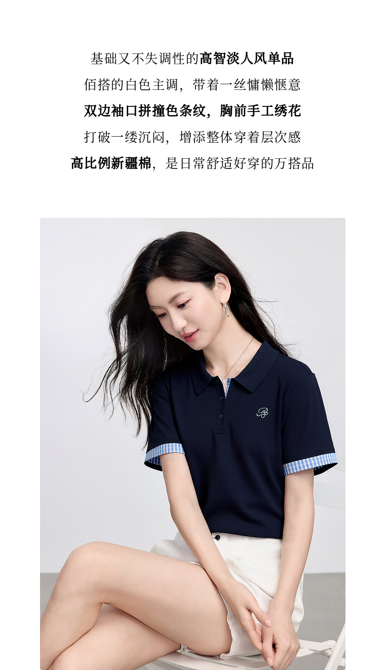 【专属特价】熙世界休闲撞色POLO衫女短袖夏小个子复古翻领T恤上衣