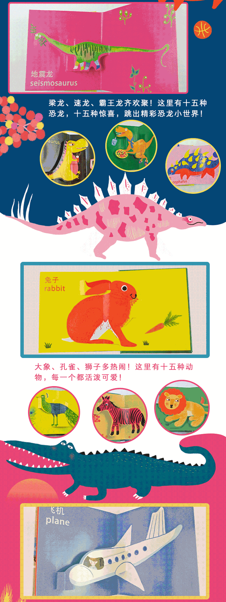 本套立体认知书专为0~3岁孩子设计,分为《动物》、《恐龙》、《交通工具》,一本一个主题。全书以认物为主要内容,配以中英双语认知,能开拓孩子的认知能力与语言发展能力;精巧的立体结构,能有效激起孩子的阅读兴趣,提高空间感知能力。