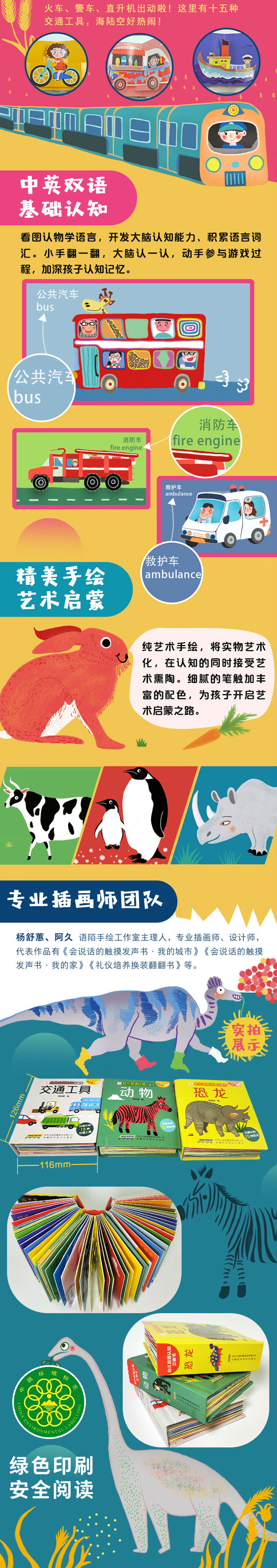 4、选取了孩子们最感兴趣的三大主题——动物、恐龙、交通工具,内容包括15种动物、15种恐龙、15种交通工具,极大地丰富了孩子们的认知视野。