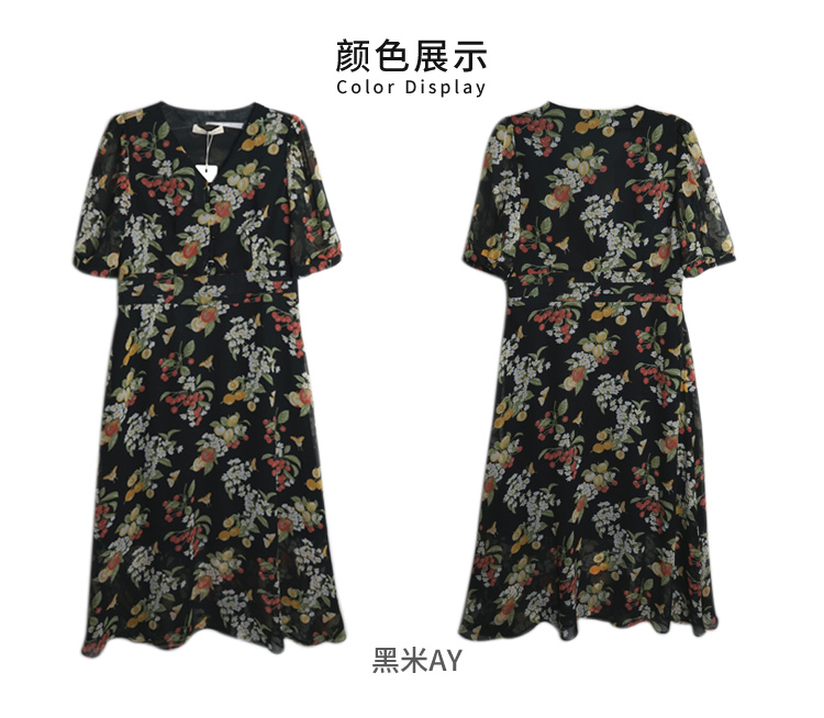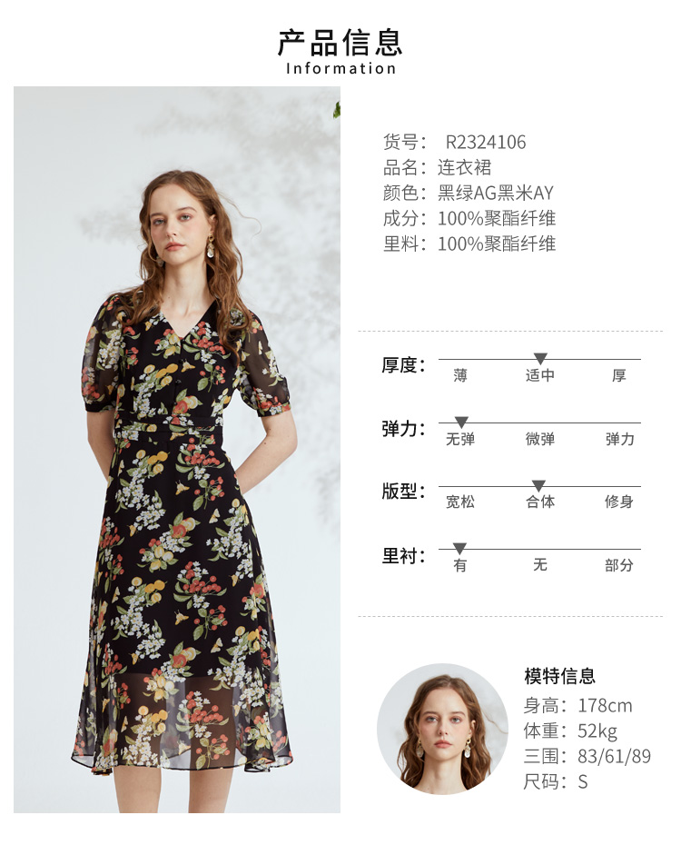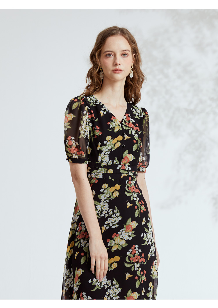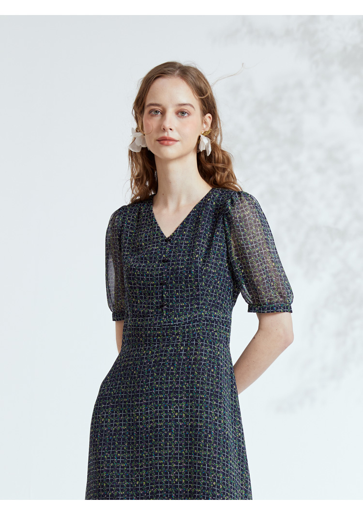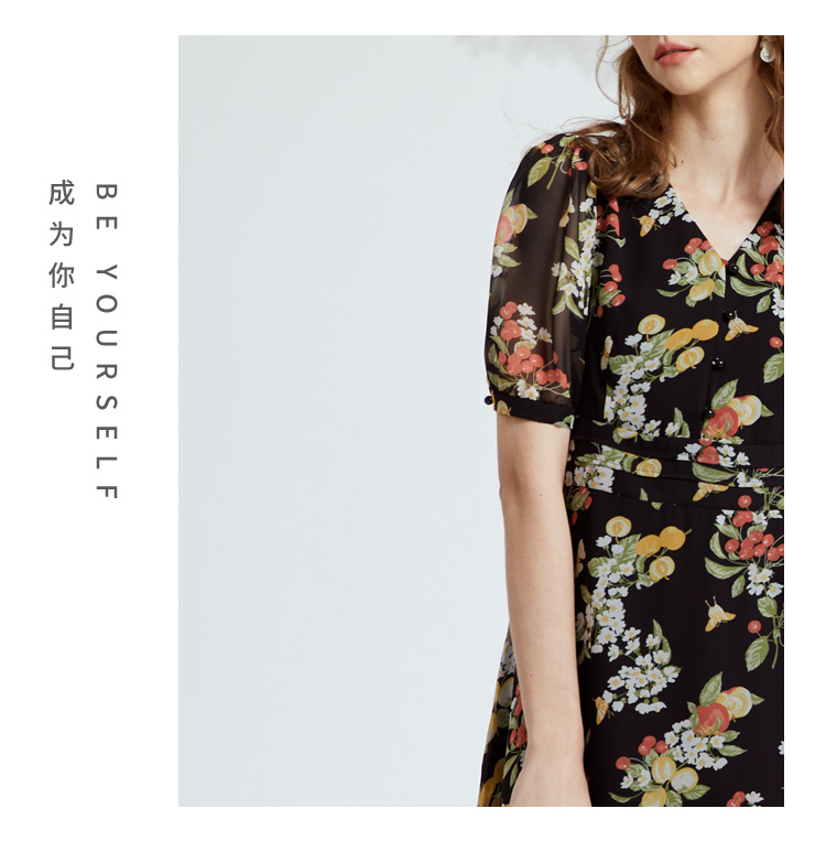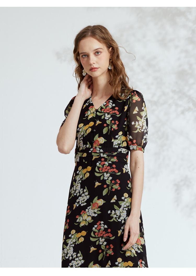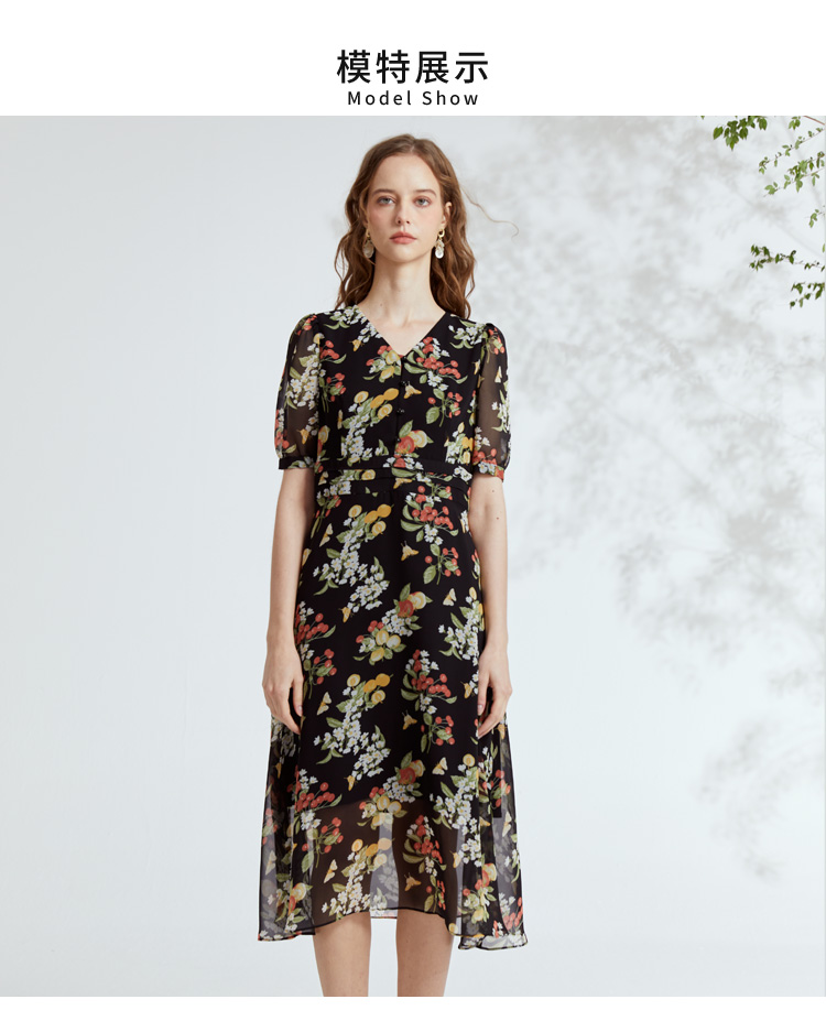 VIVIAN LIU R2324106 春女装新款雪纺印花V领收腰田园半袖连衣裙