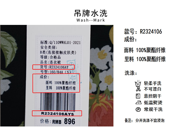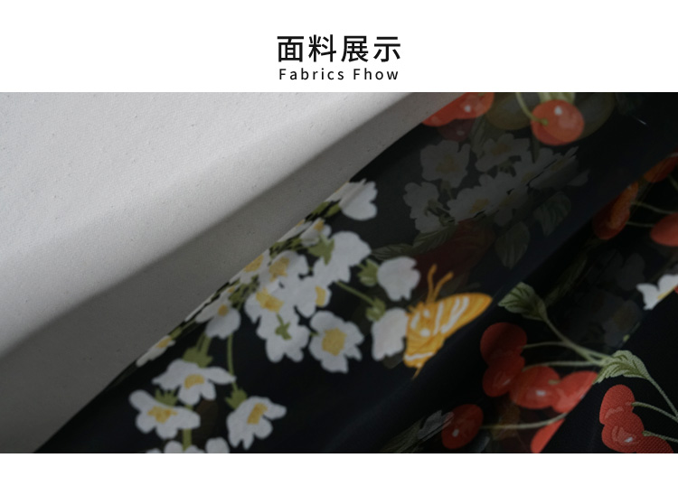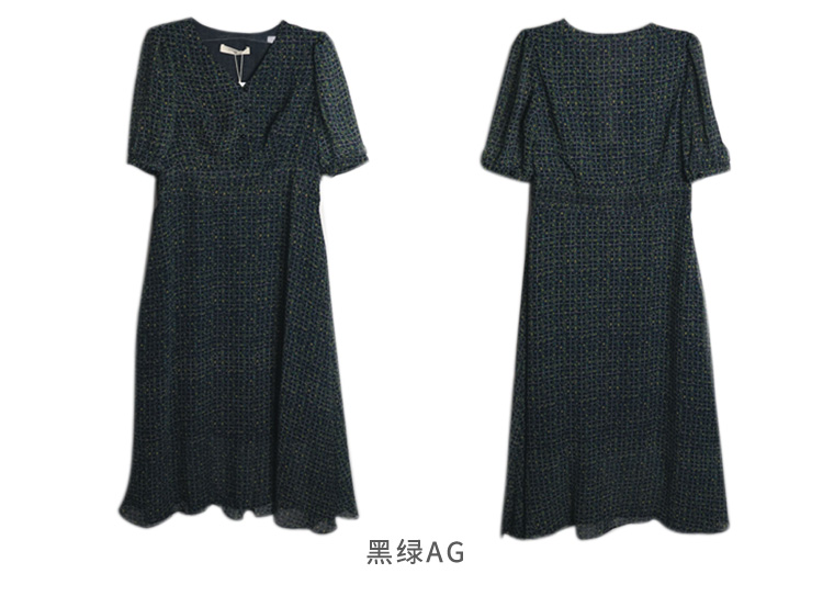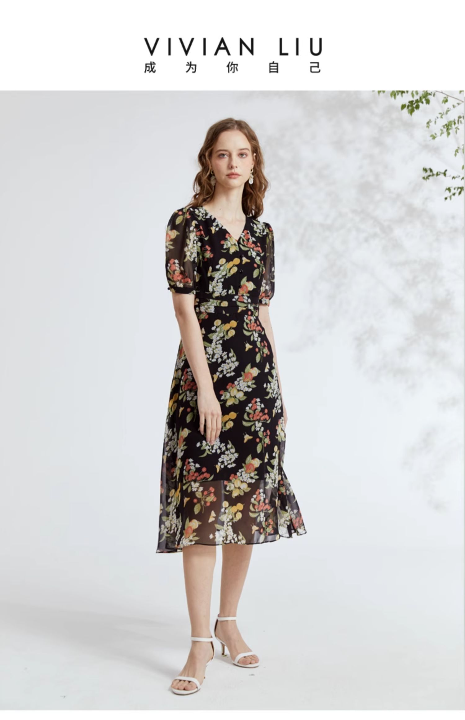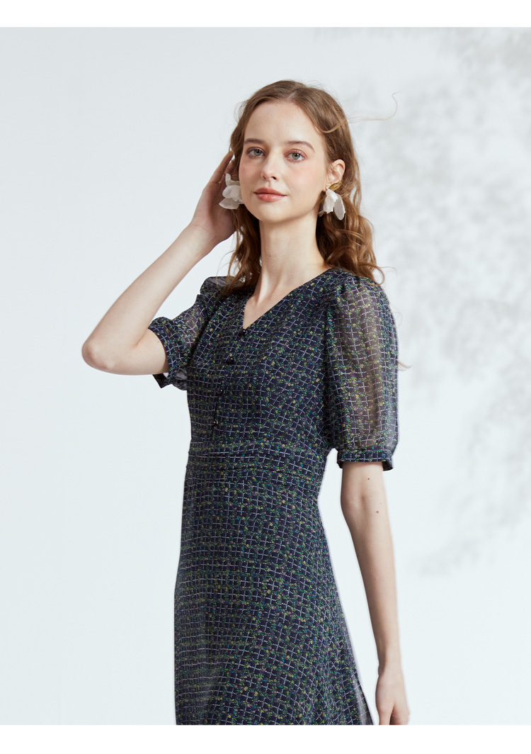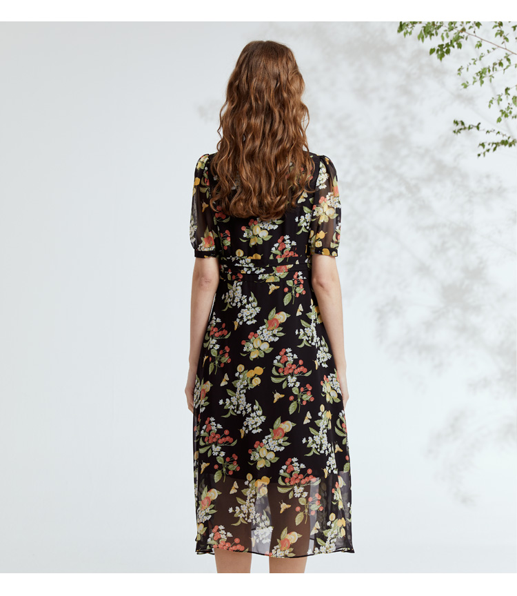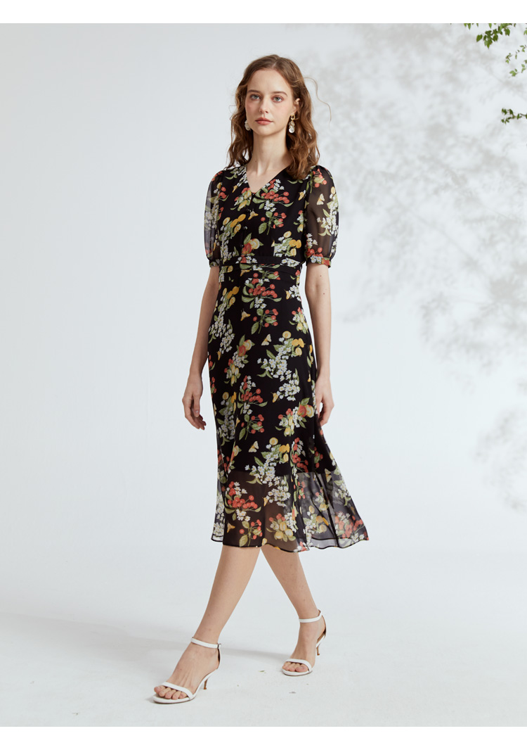 VIVIAN LIU R2324106 春女装新款雪纺印花V领收腰田园半袖连衣裙