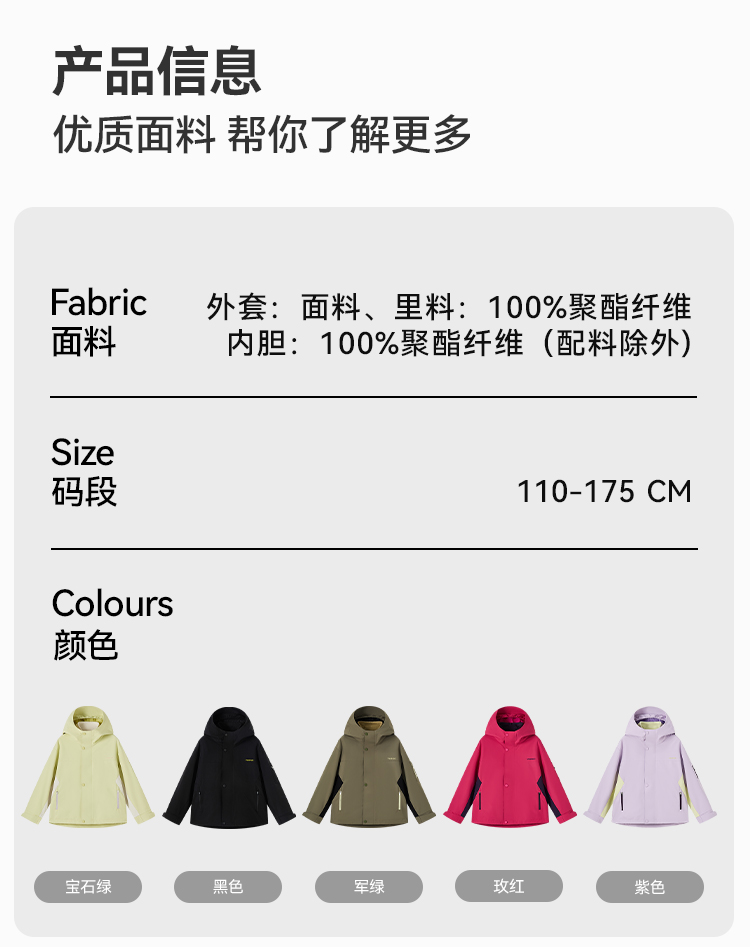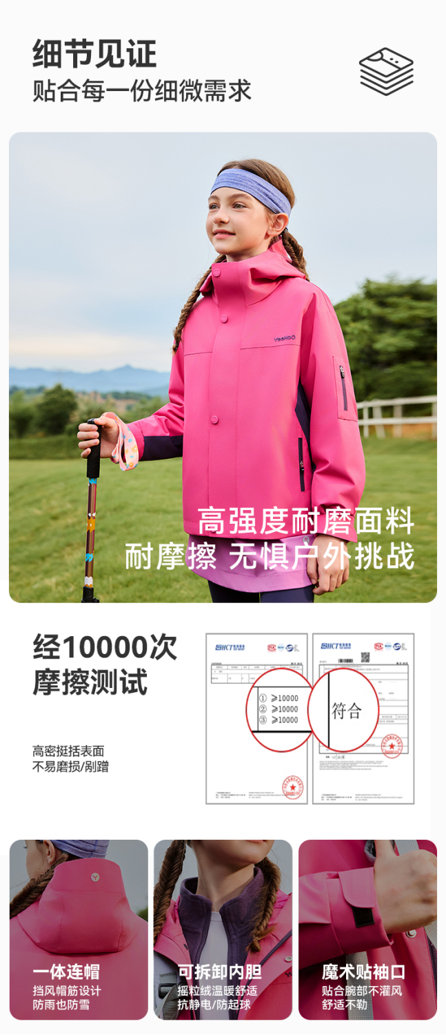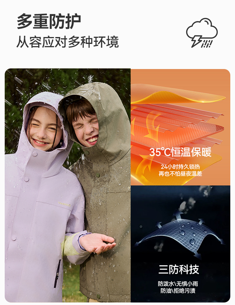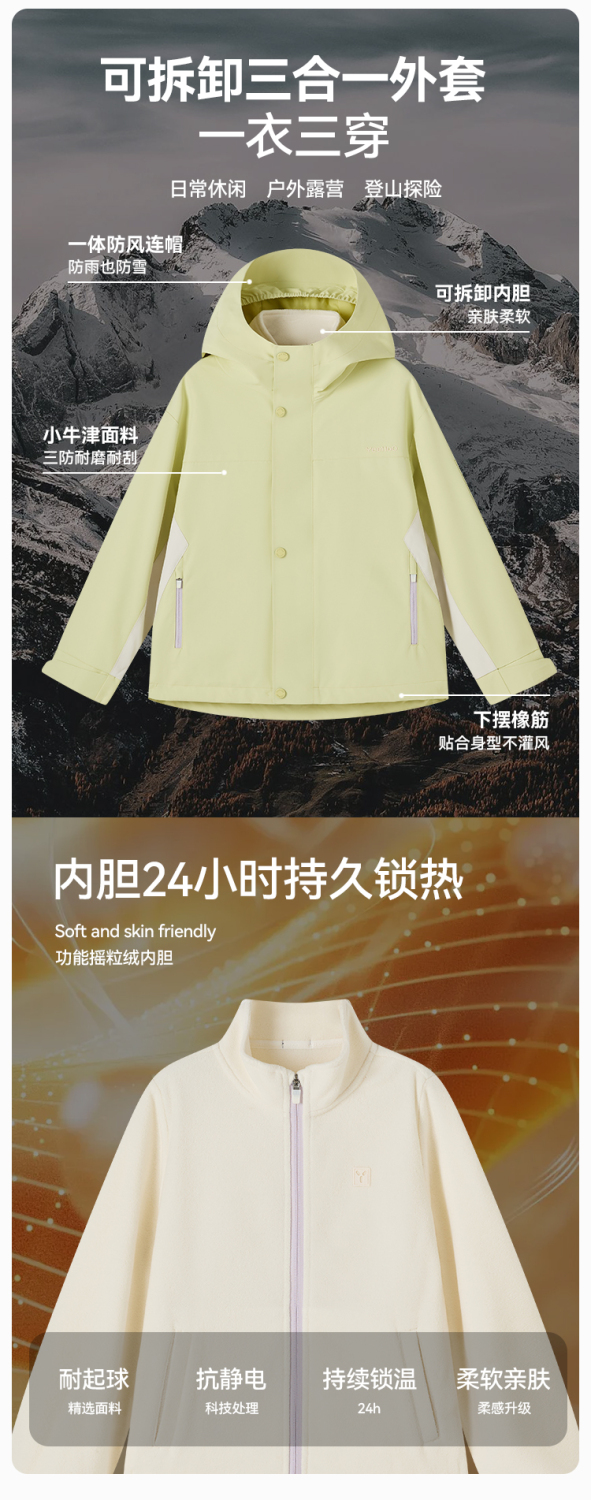 【英氏】【三防 三合一冲锋衣】【110-175】男女童秋冬款保暖三合一防风冲锋外套