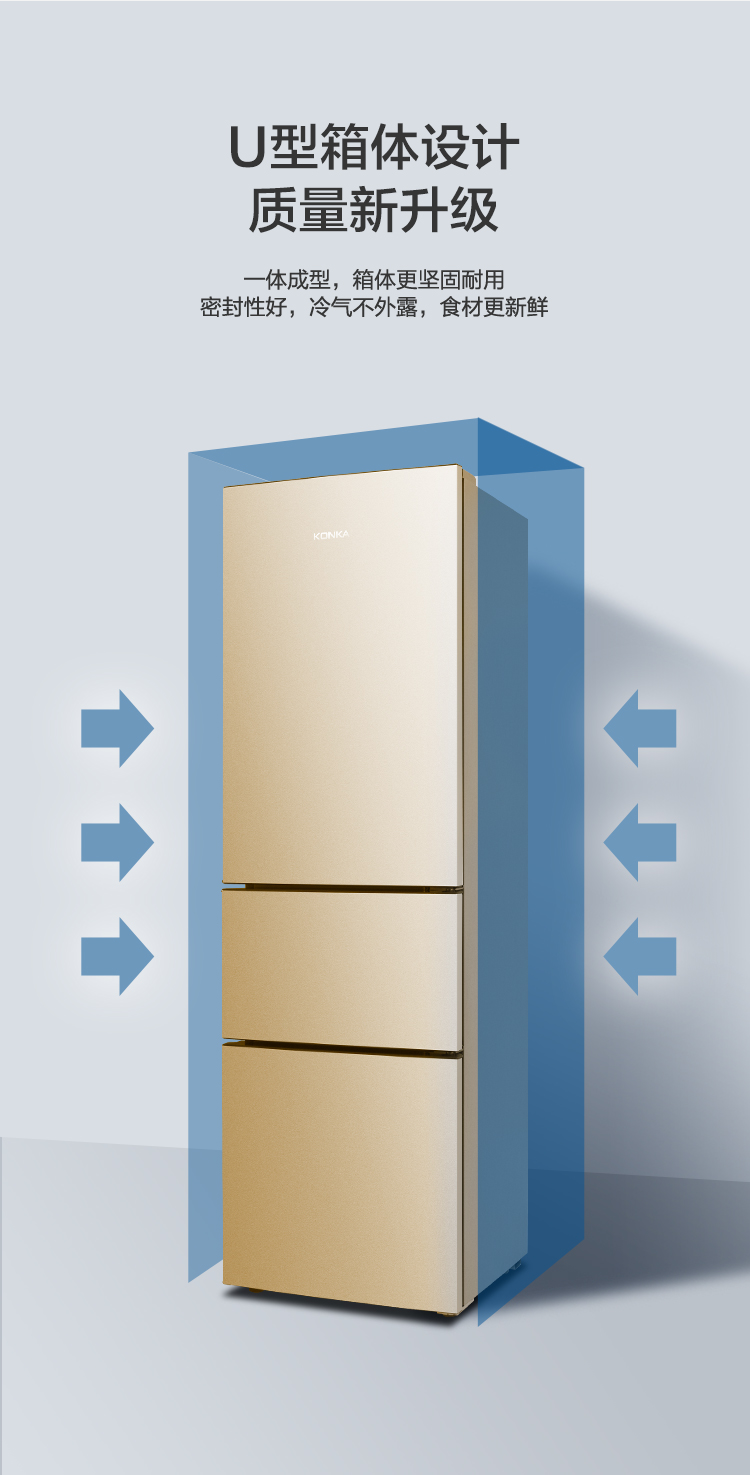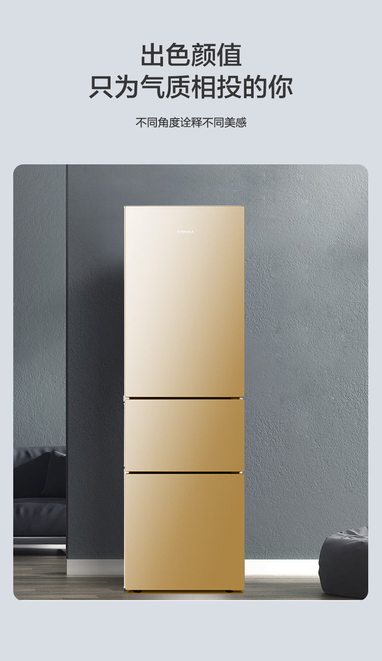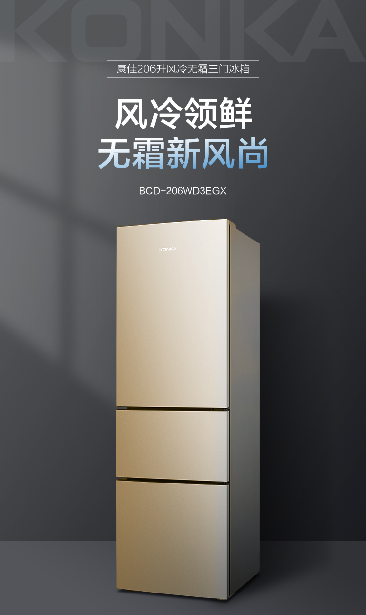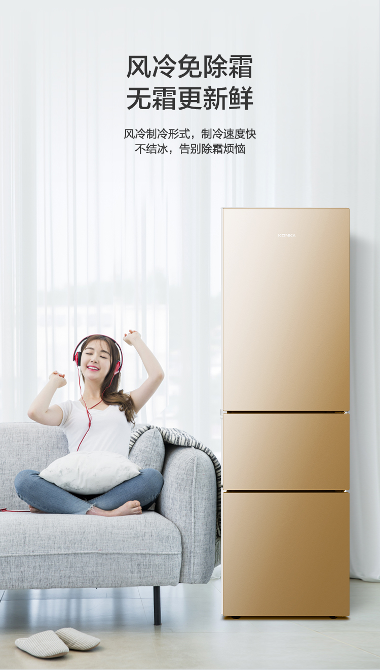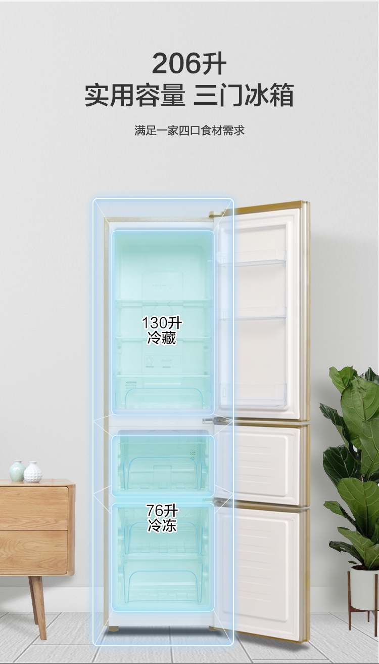 康佳206升三开门风冷电冰箱小型租房节能省电低噪冷冻冷藏