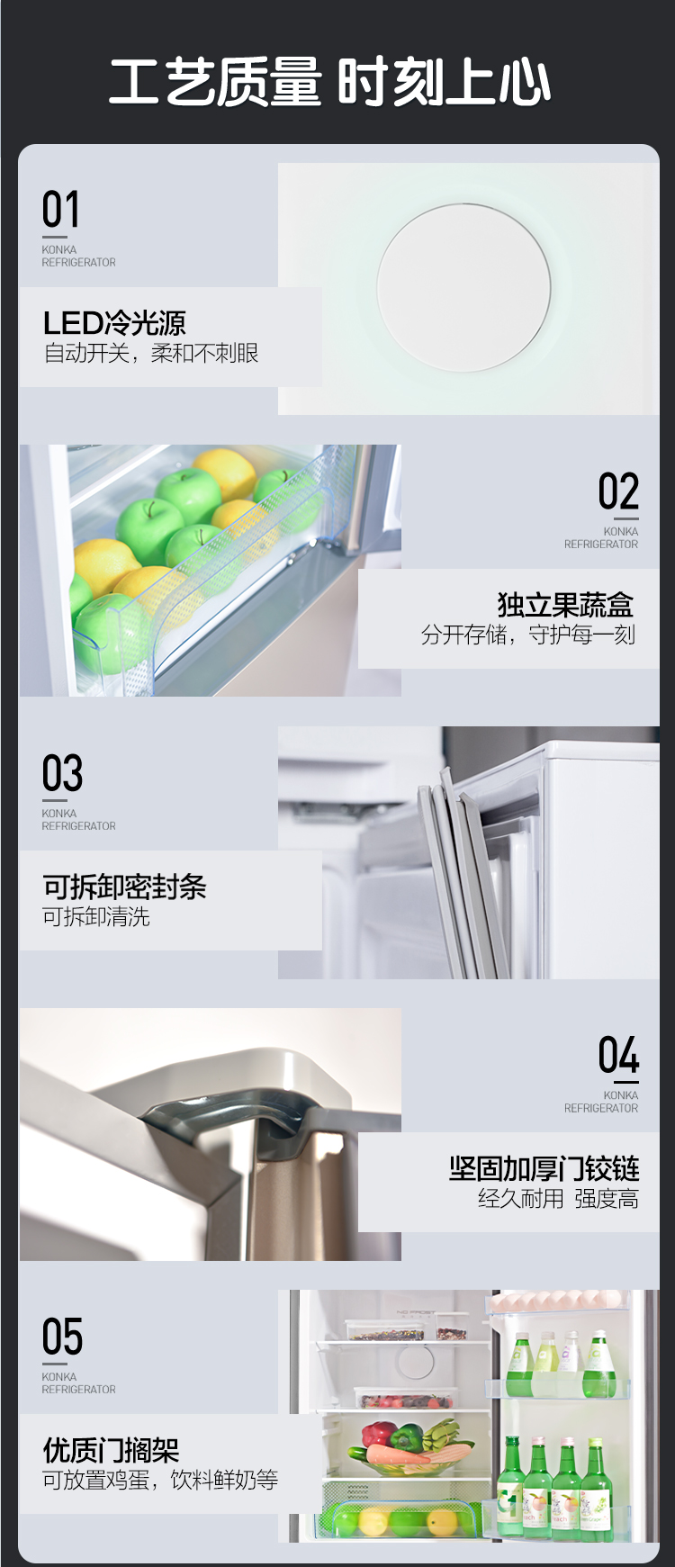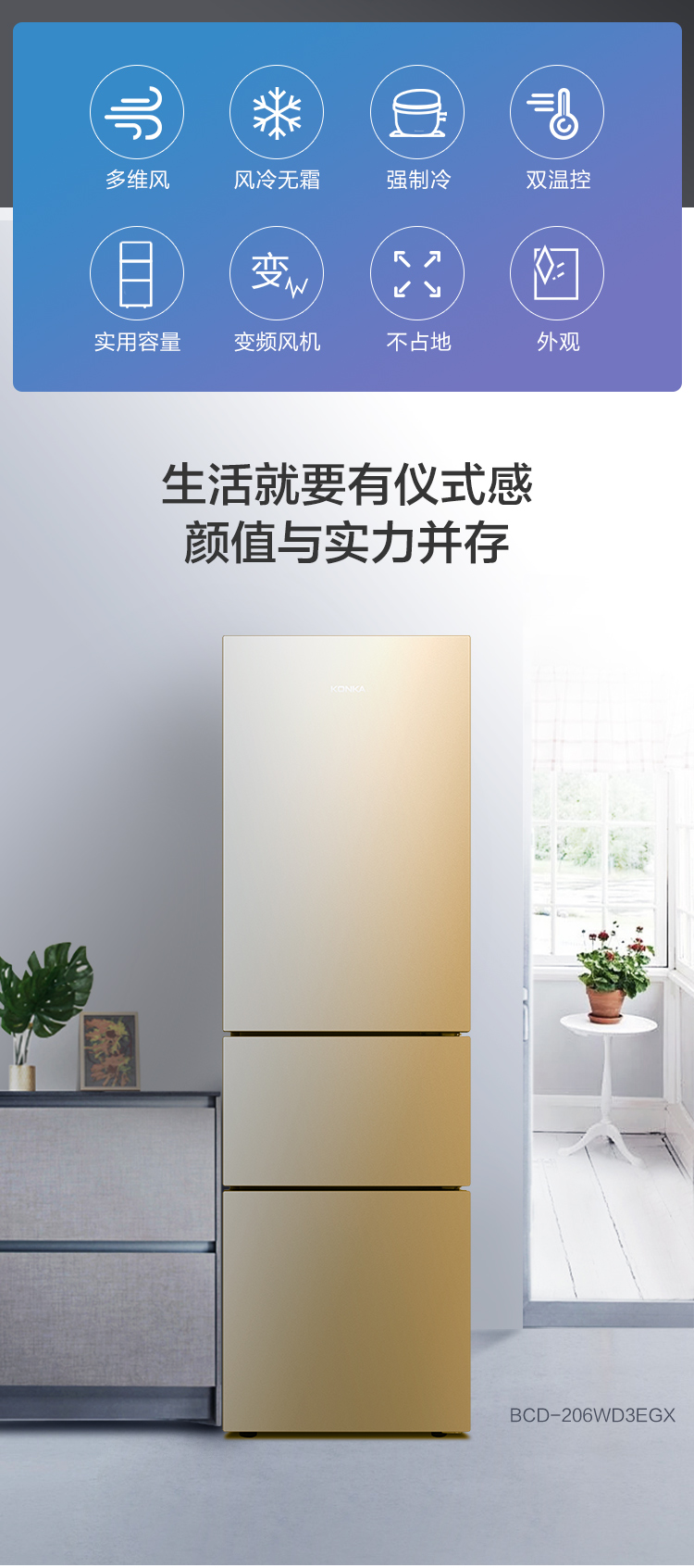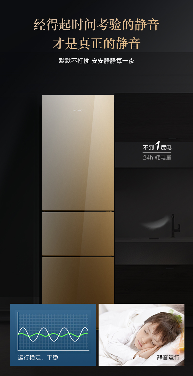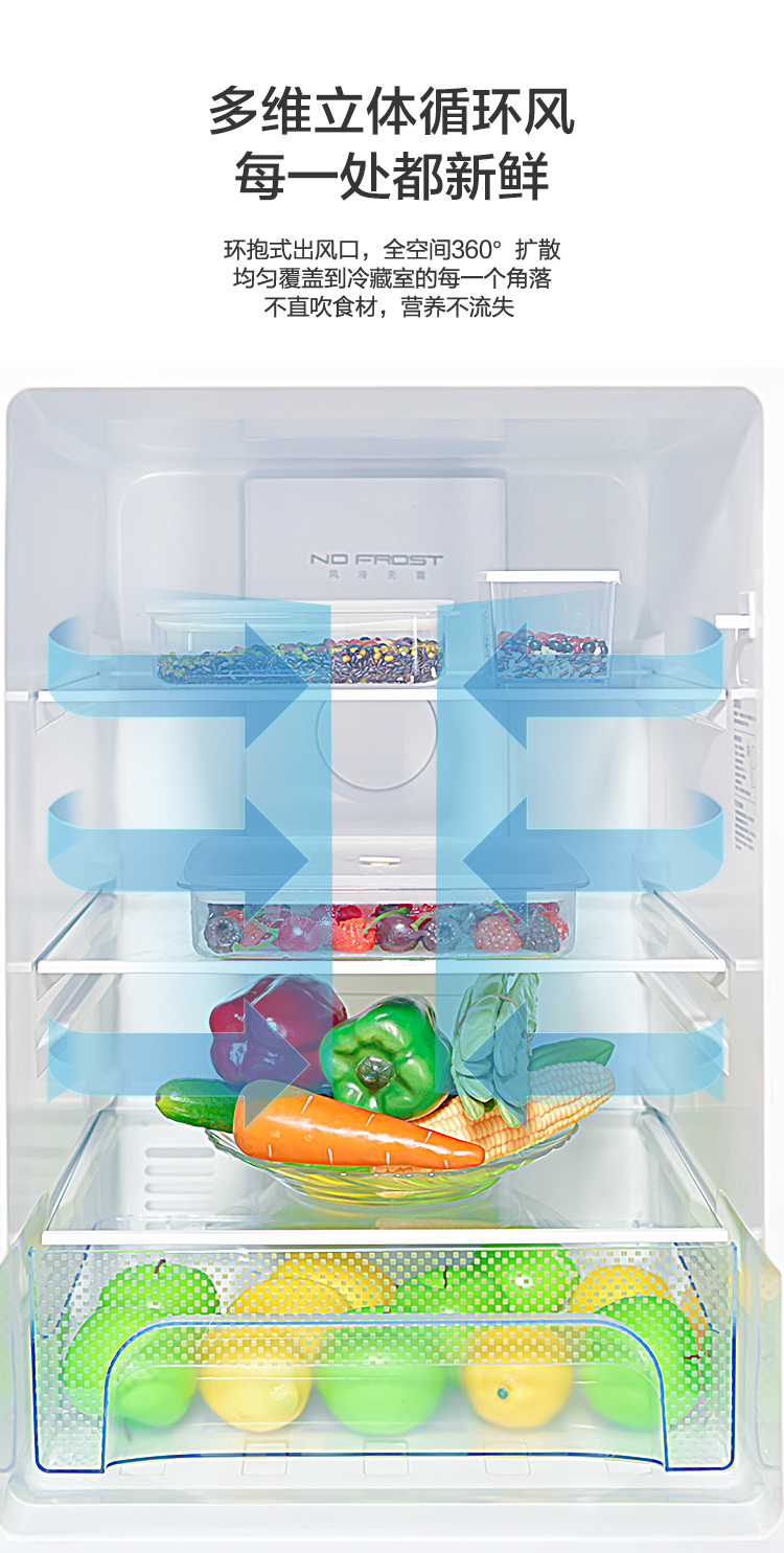康佳206升三开门风冷电冰箱小型租房节能省电低噪冷冻冷藏