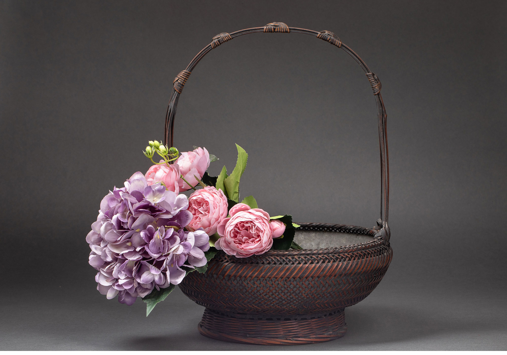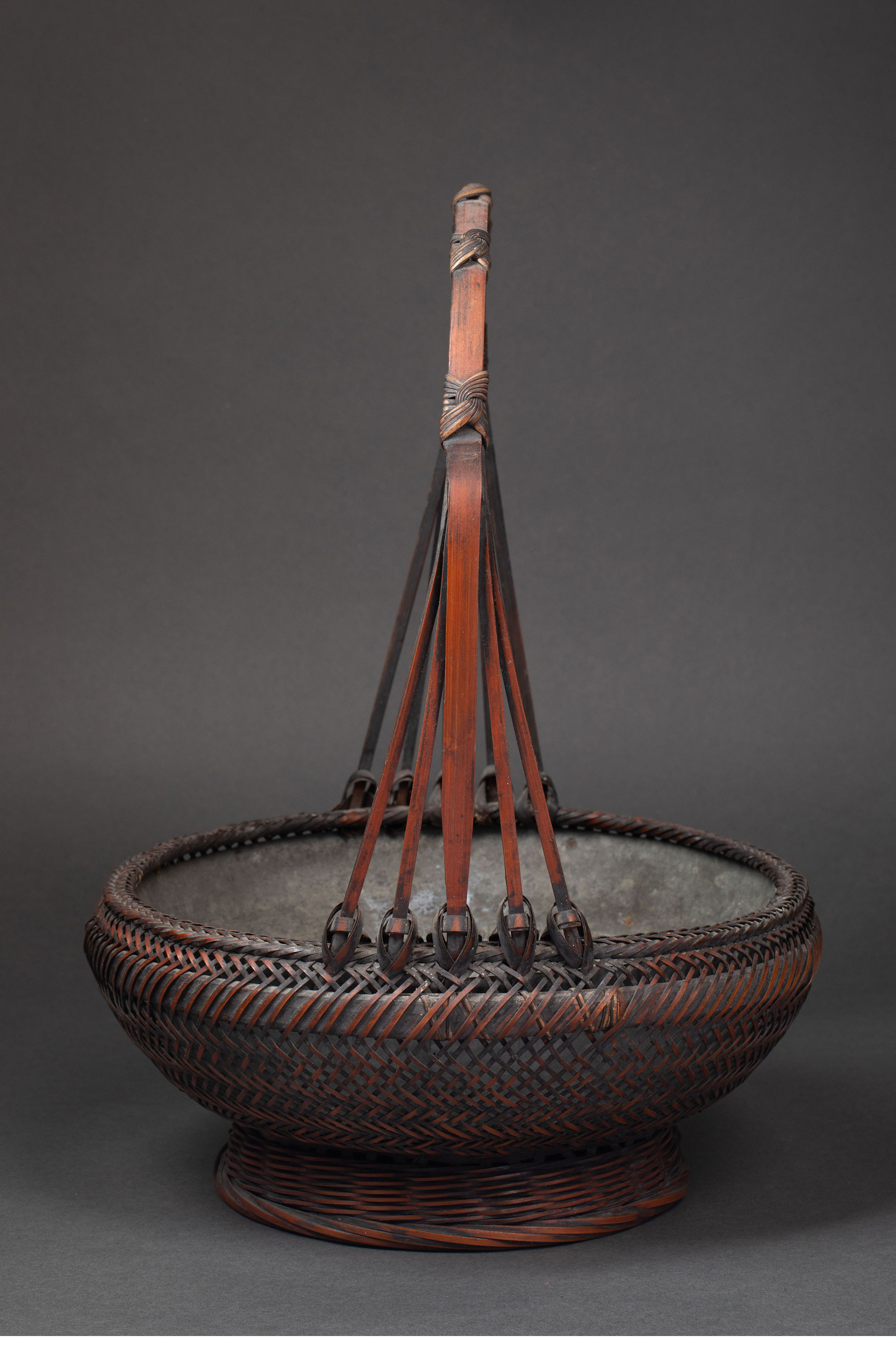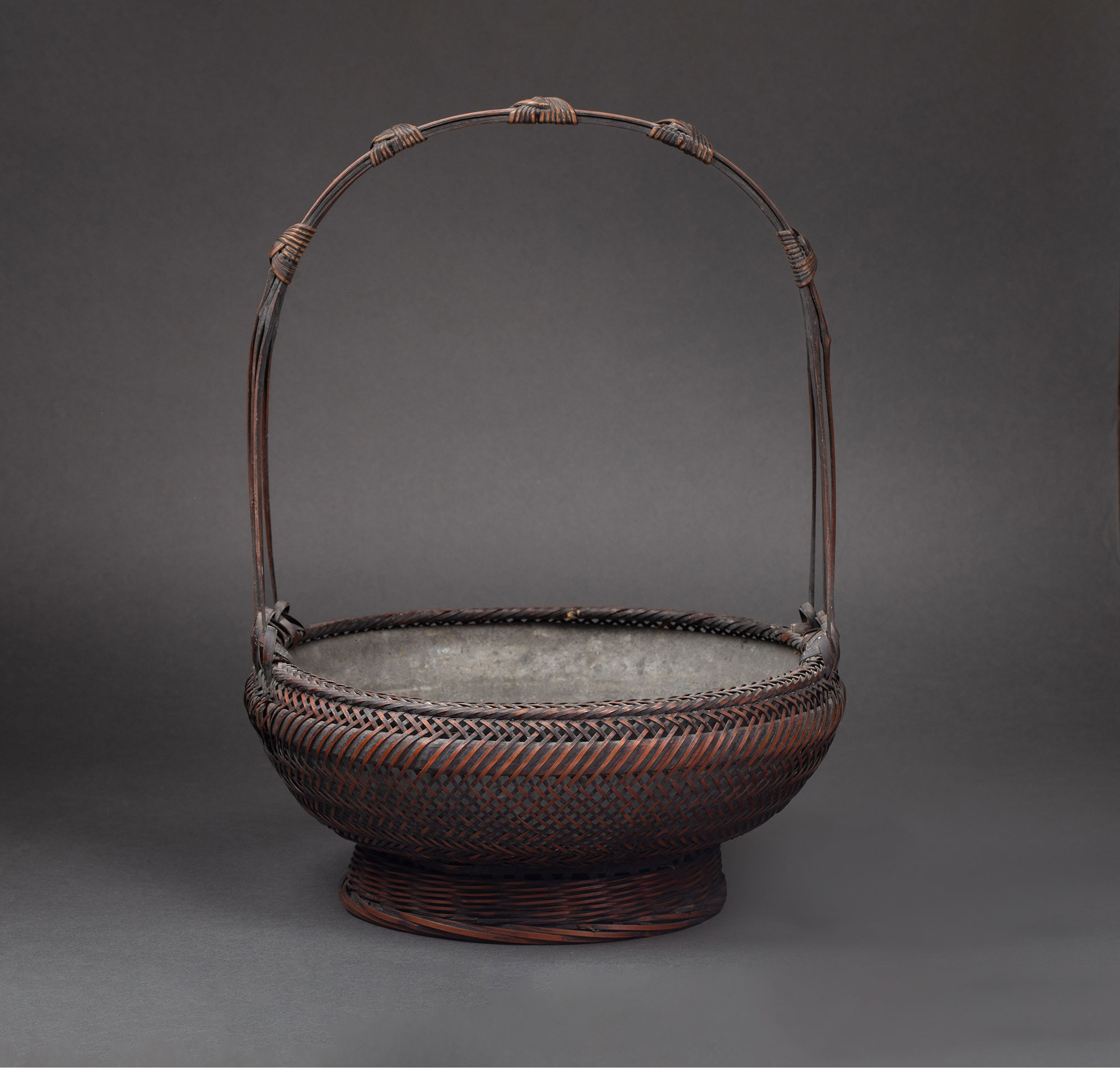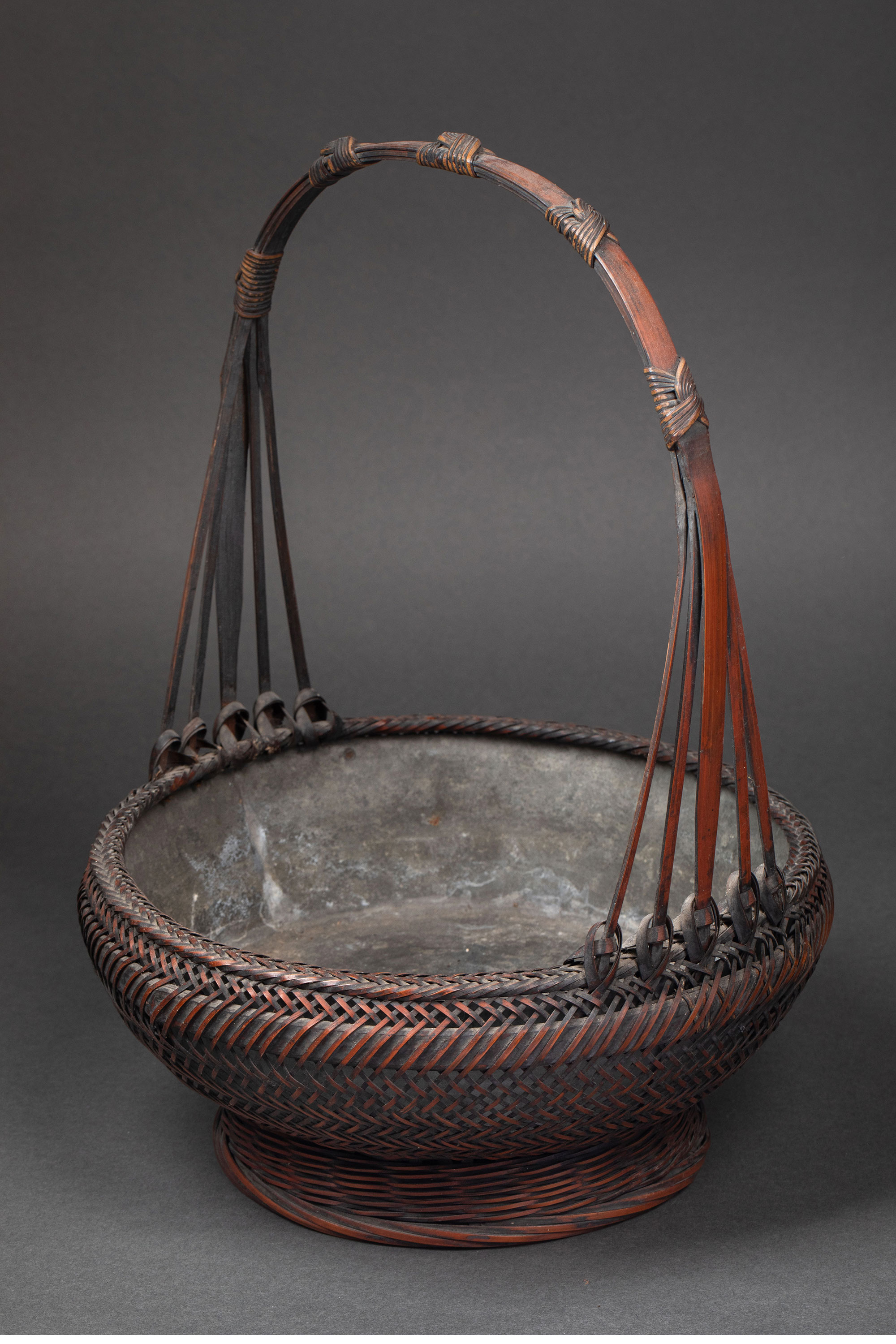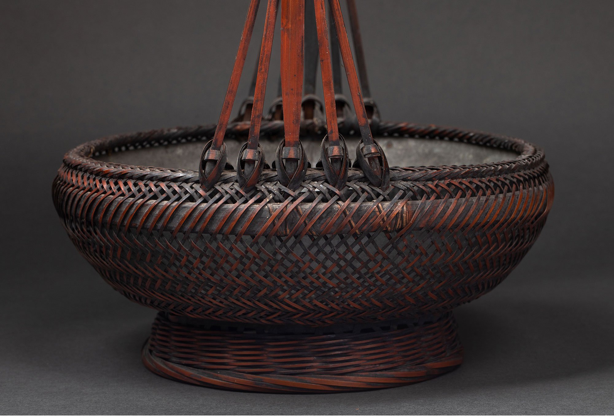 19世纪日本出品唐物式敞口钵形竹编提梁花笼