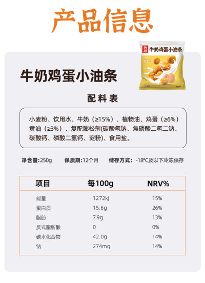 牛奶鸡蛋小油条:小麦粉、饮用水、牛奶(≥15%)、植物油、鸡蛋(≥6%)、黄油(≥3%)、复配膨松剂(碳酸氢钠、焦磷酸二氢二钠、碳酸钙、磷酸二氢钙、淀粉)、食用盐