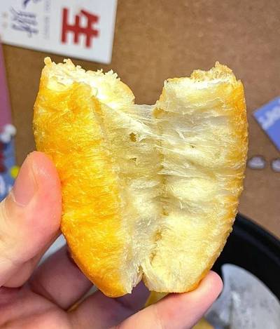 和普通油条只用小麦粉和水和面不一样,它家还特别加入了新鲜牛奶、鸡蛋和天然动物黄油。