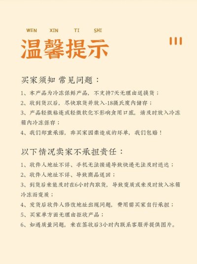 【售后说明】生鲜产品不适用7天无理由退换货,有问题第一时间和客服沟通;如破损漏发,需提供快递外包装、面单及产品图商品详情;发货后非质量问题不退不换不拦截,正常结算货款;不建议修改地址,如必须修改地址转寄费用同城加10元,异地加20元,修改地址运途延长造成的坏单不包赔