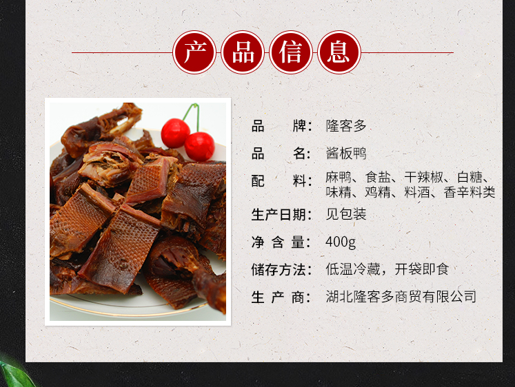 洪湖隆客多酱板鸭礼盒/公鸭装400g