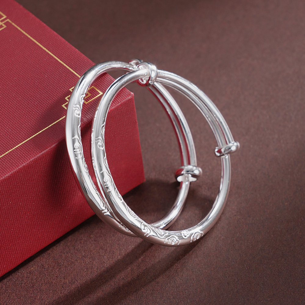 【寓意】:纯银童镯以祥云纹样勾勒,云纹舒展如智慧轻启,寓意宝宝在时光中乘风而上,开启智慧与无限可能。