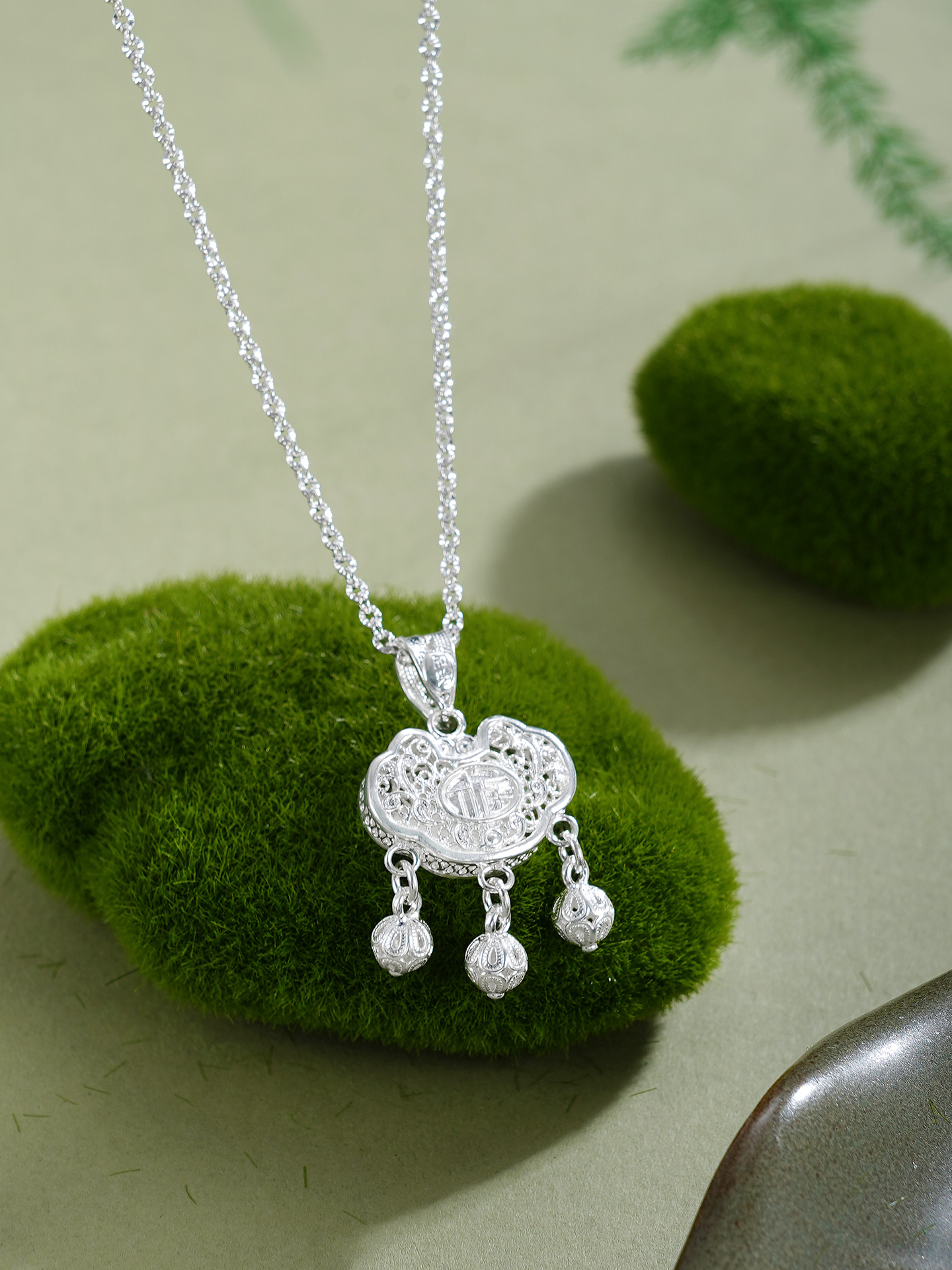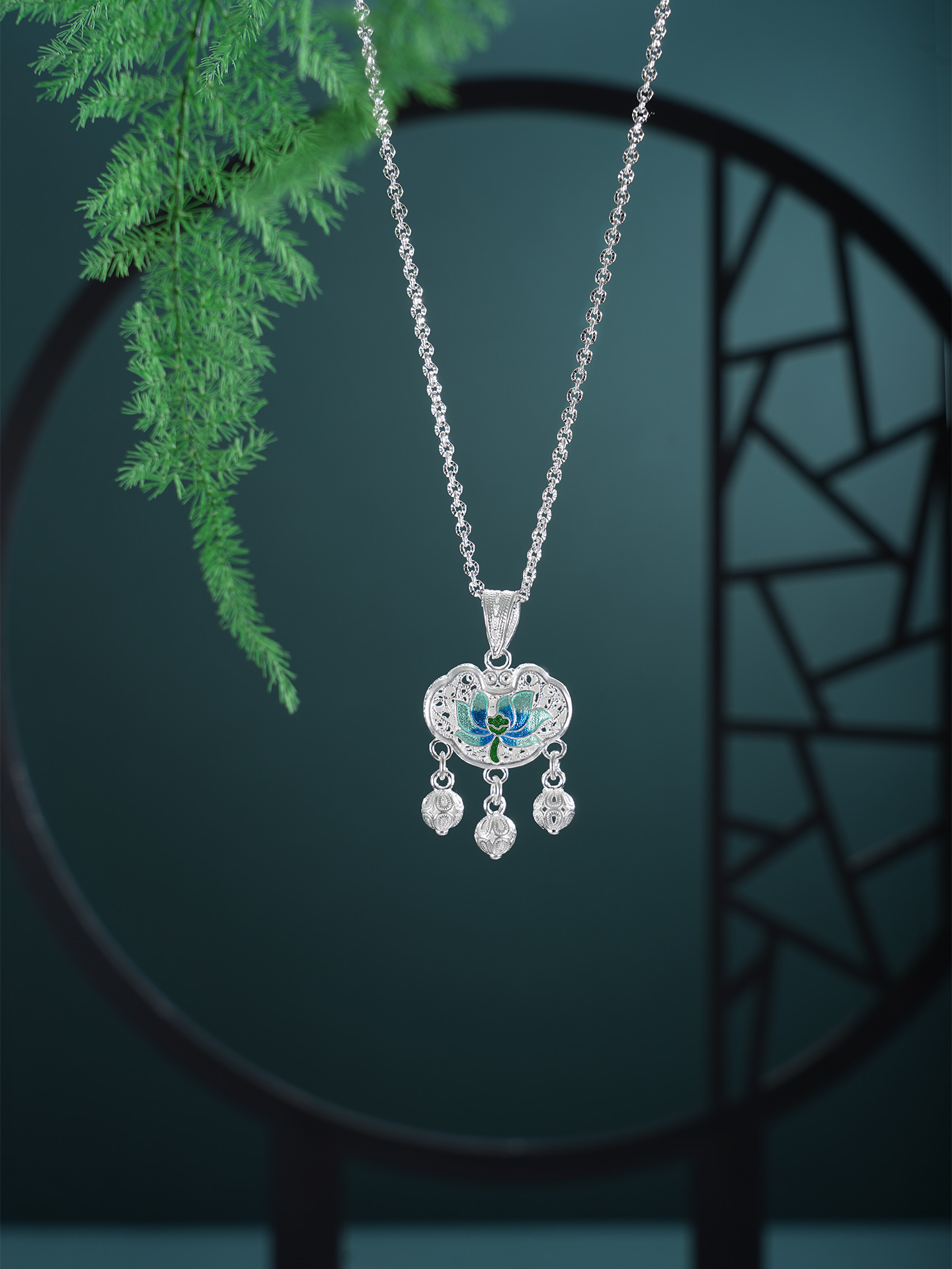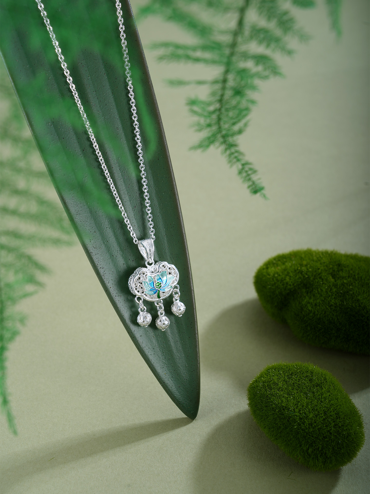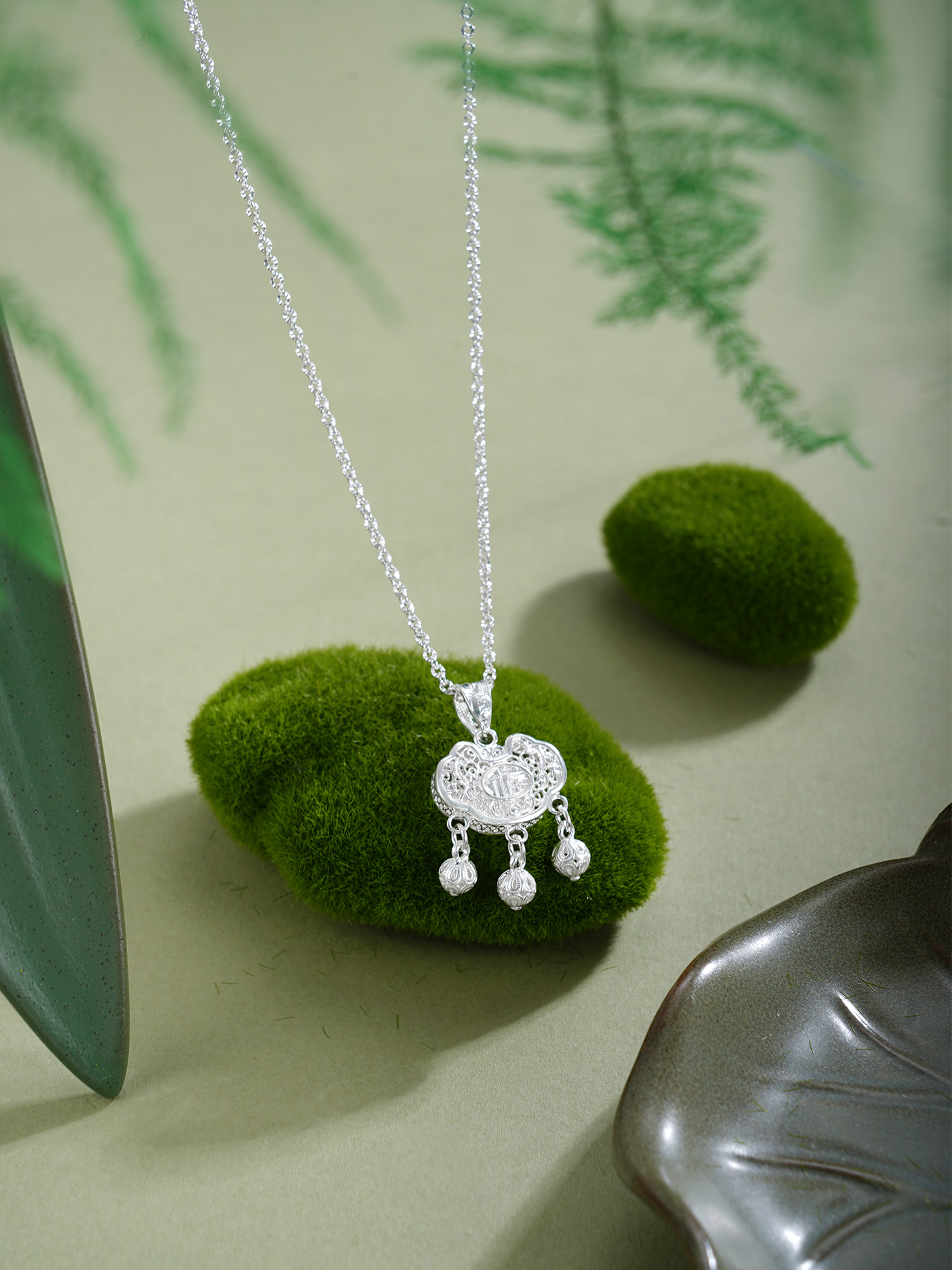 【寓意】:银花丝如意锁吊坠,其上饰以莲花纹样,营造出流光溢彩的视觉美感,更寓意着莲开静好,幸运永恒。