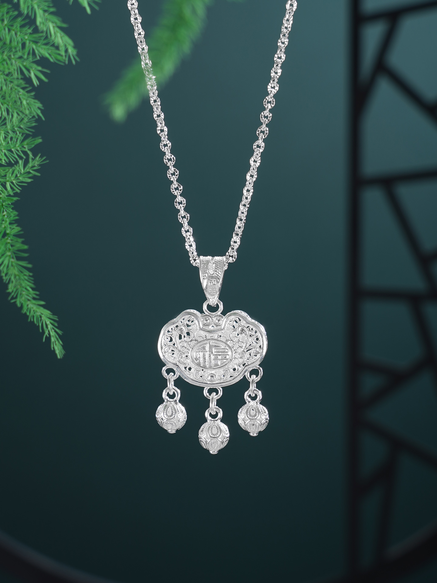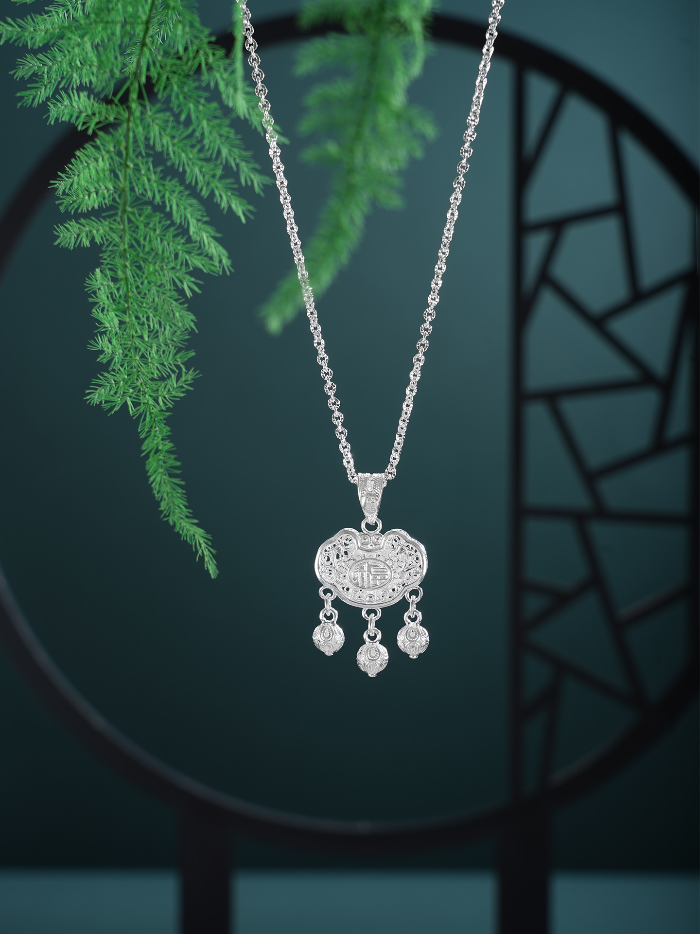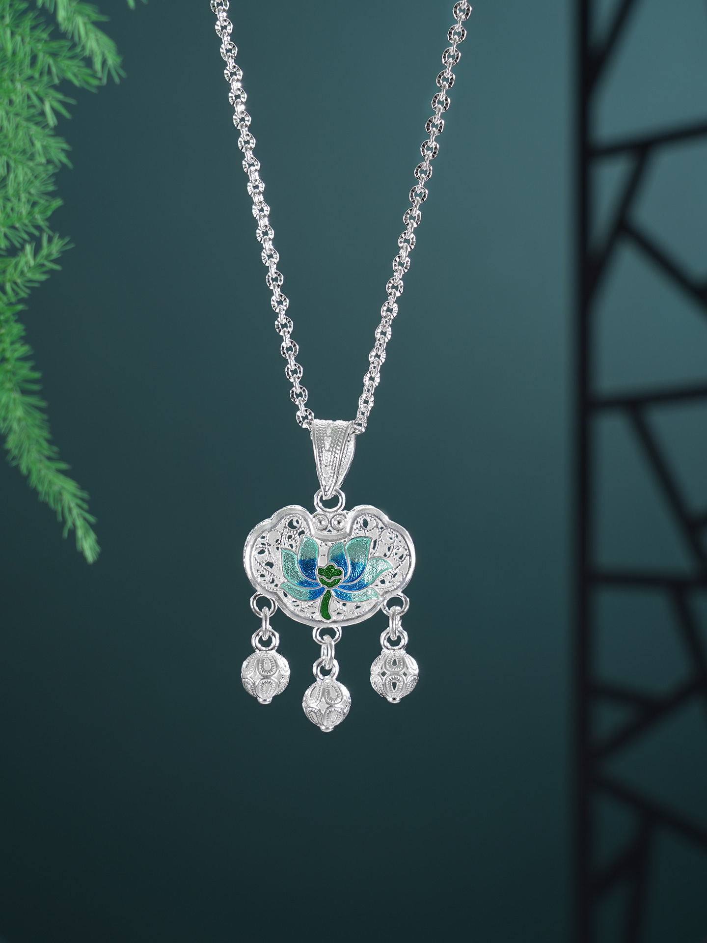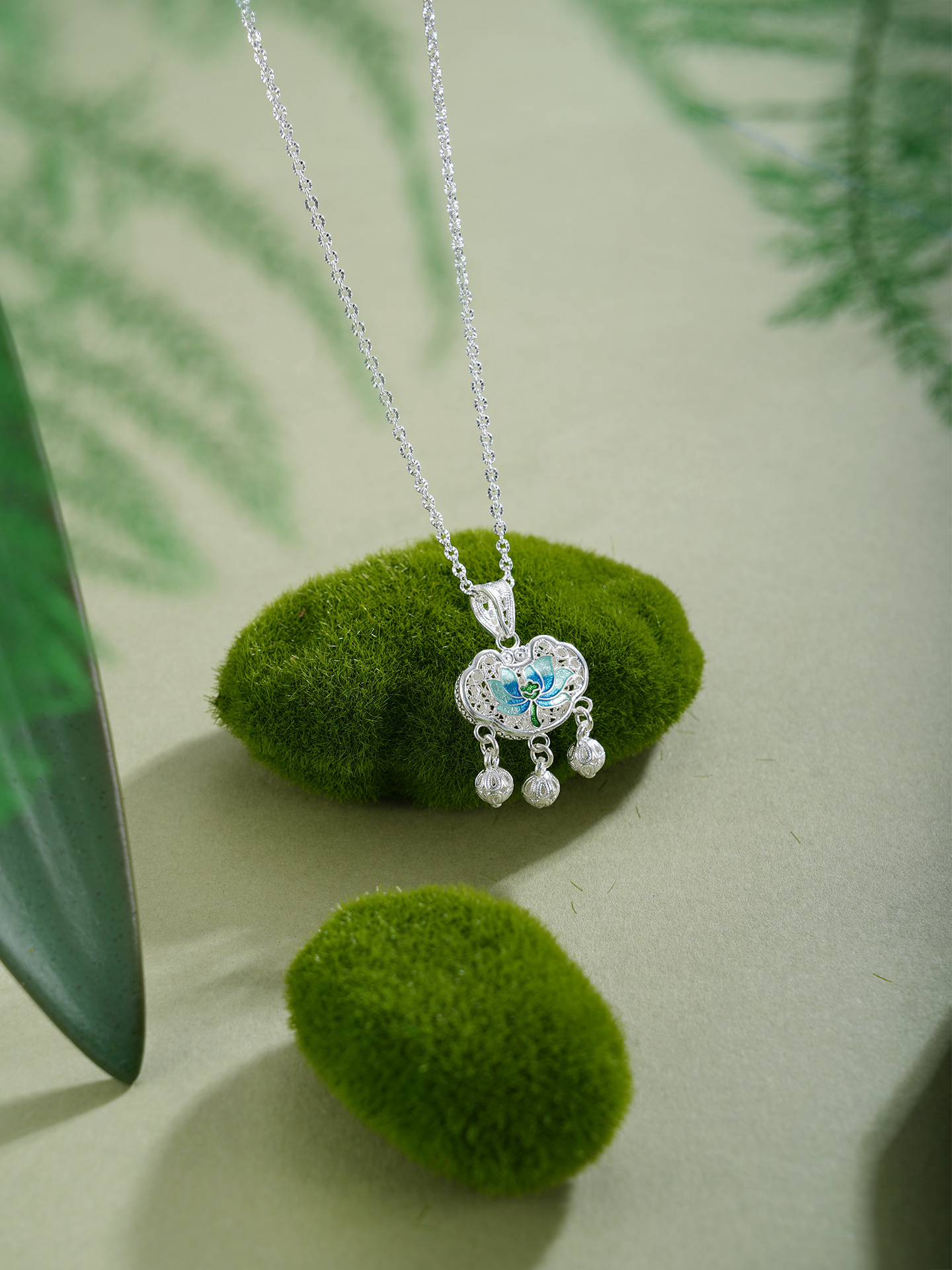 【寓意】:银花丝如意锁吊坠,其上饰以莲花纹样,营造出流光溢彩的视觉美感,更寓意着莲开静好,幸运永恒。