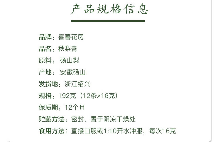 【分仓直发包邮】喜善花房砀山秋梨膏192g/盒(12条)